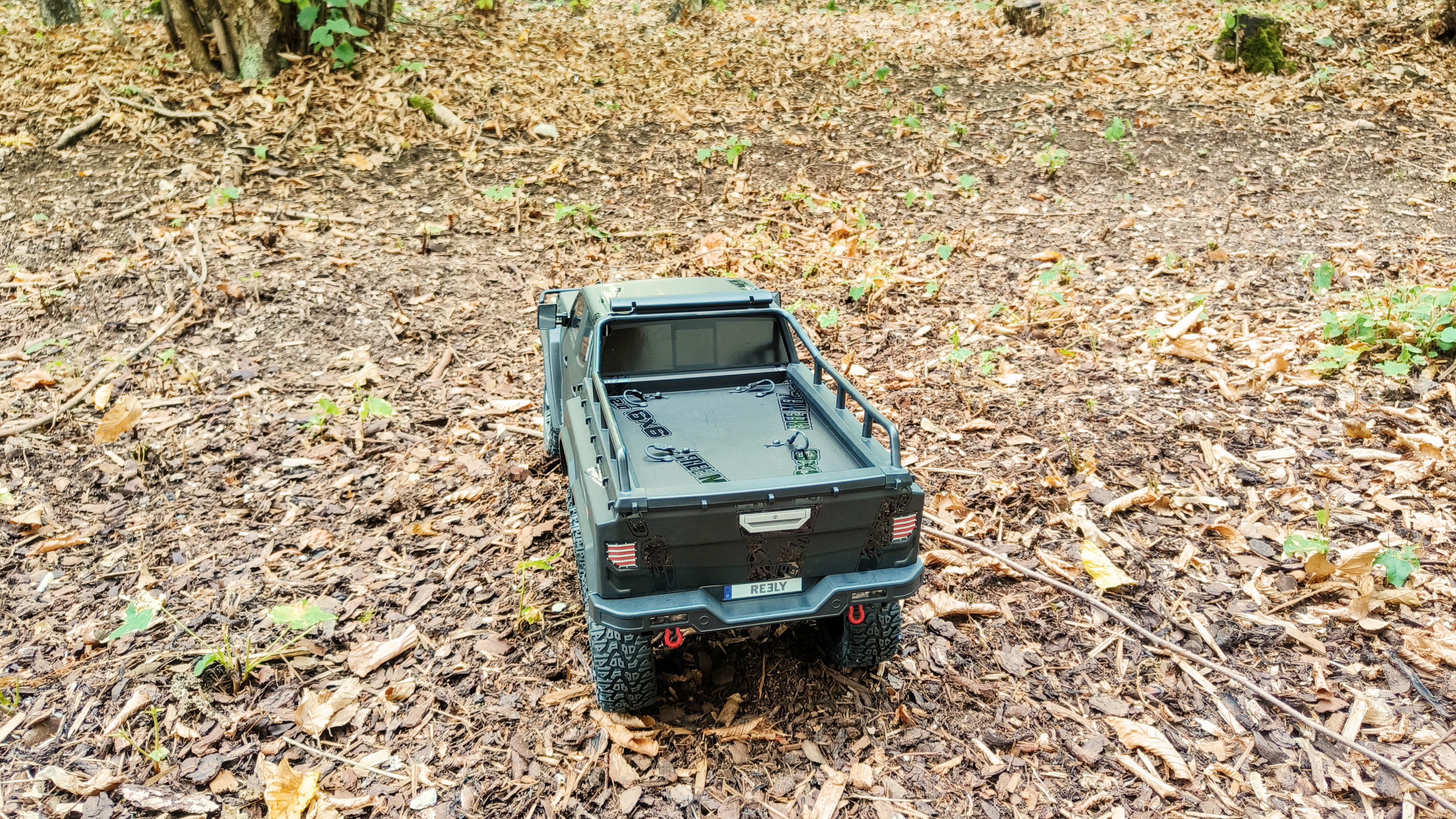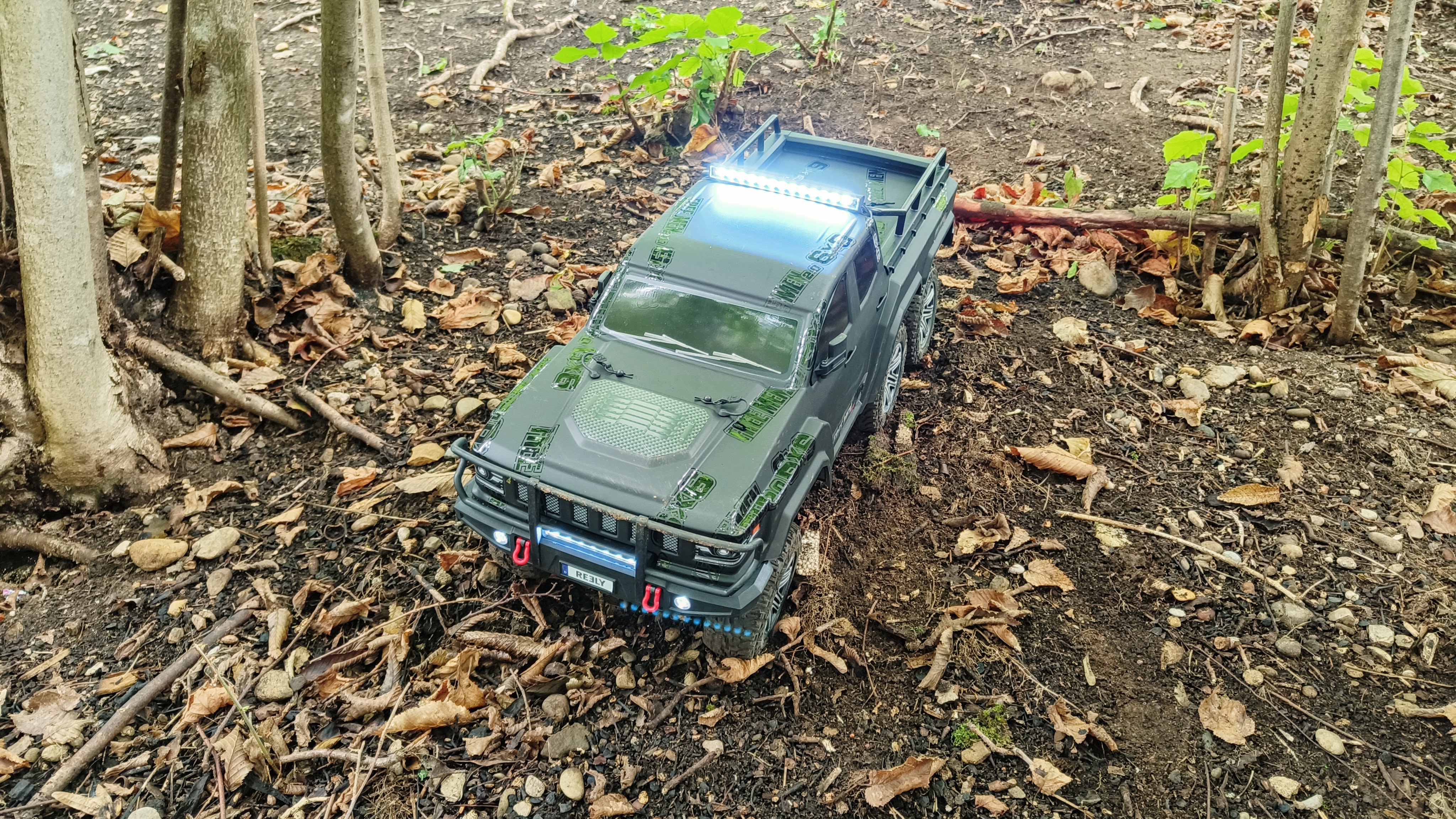 Der Reely Free Men 2.0 6x6 fühlt sich unbefestigtem Untergrund am wohlsten. Wir konnten mit dem Crawler problemlos einen steilen Anstieg auf Waldboden meisten und auch größere Äste oder Baumstümpfe bewältigen. Bei der weichen Federung ist aber auch Vorsicht geboten beim starken Einlenken auf weichem Untergrund – sonst kippt das Fahrzeug schnell um.