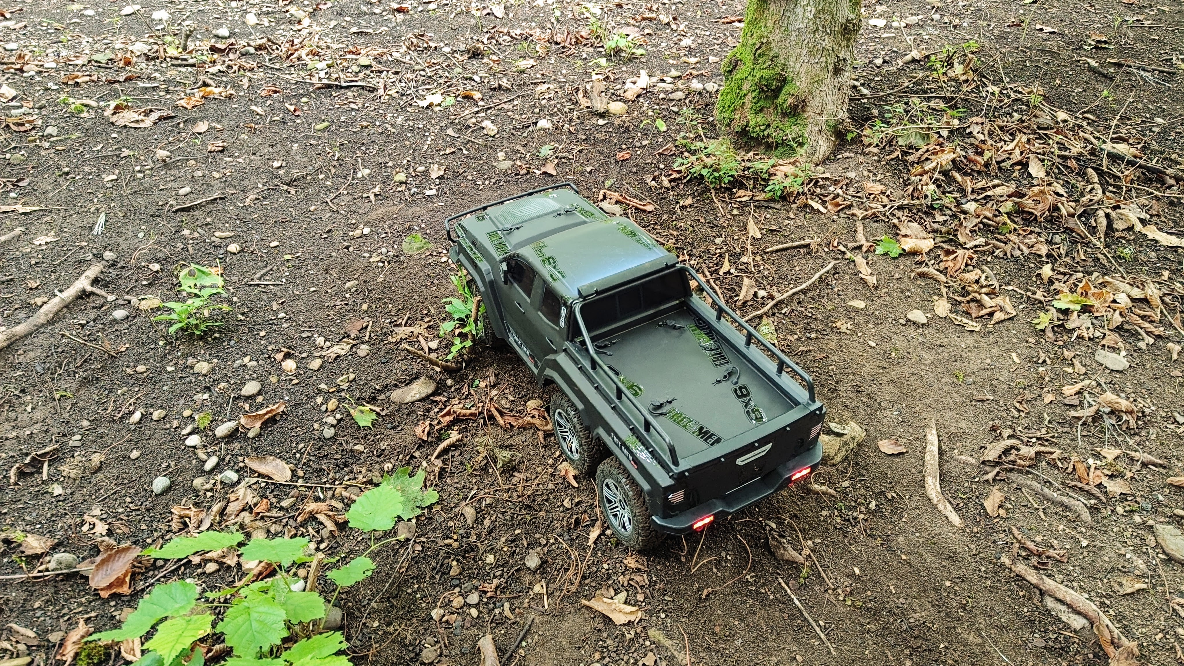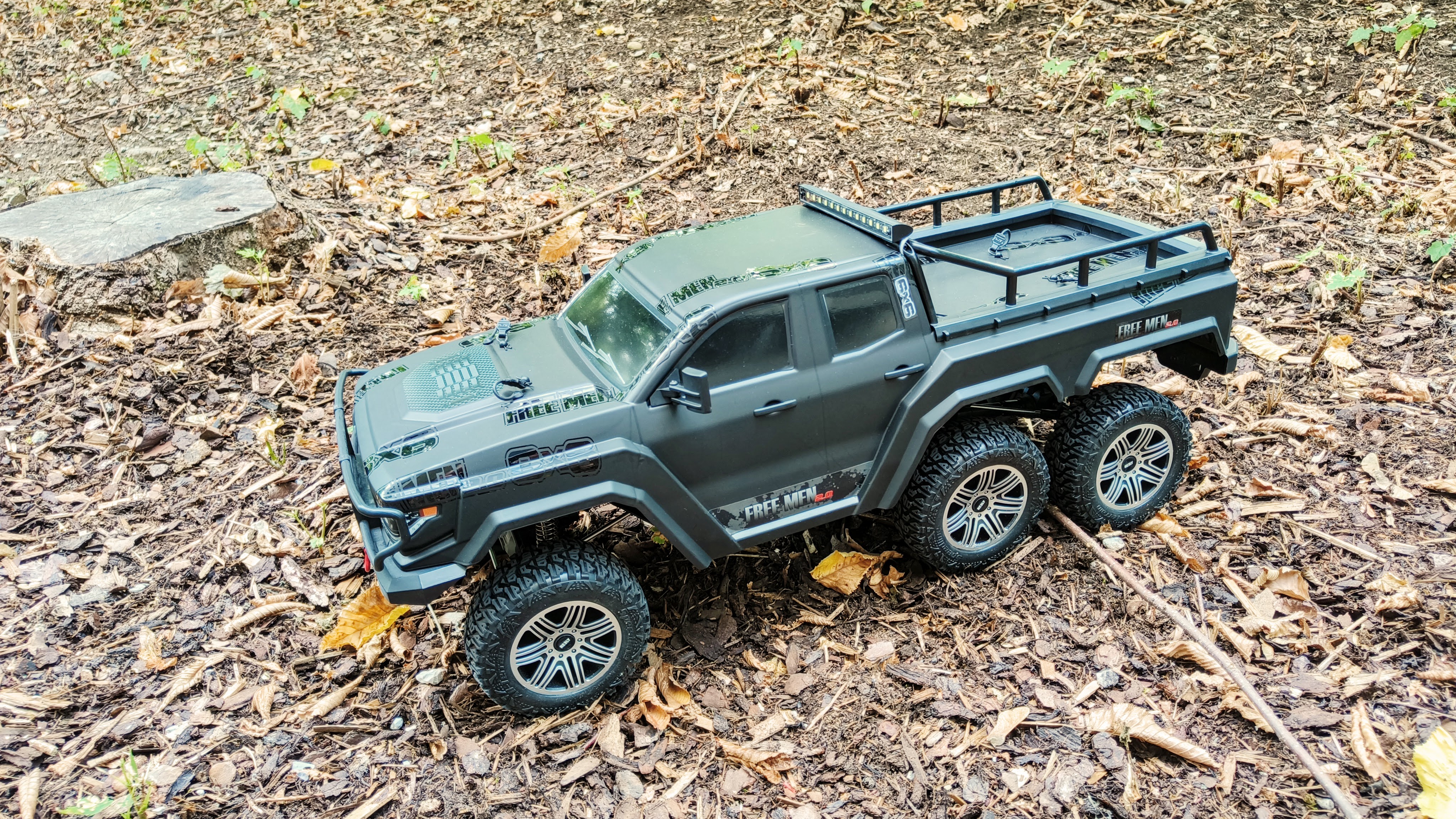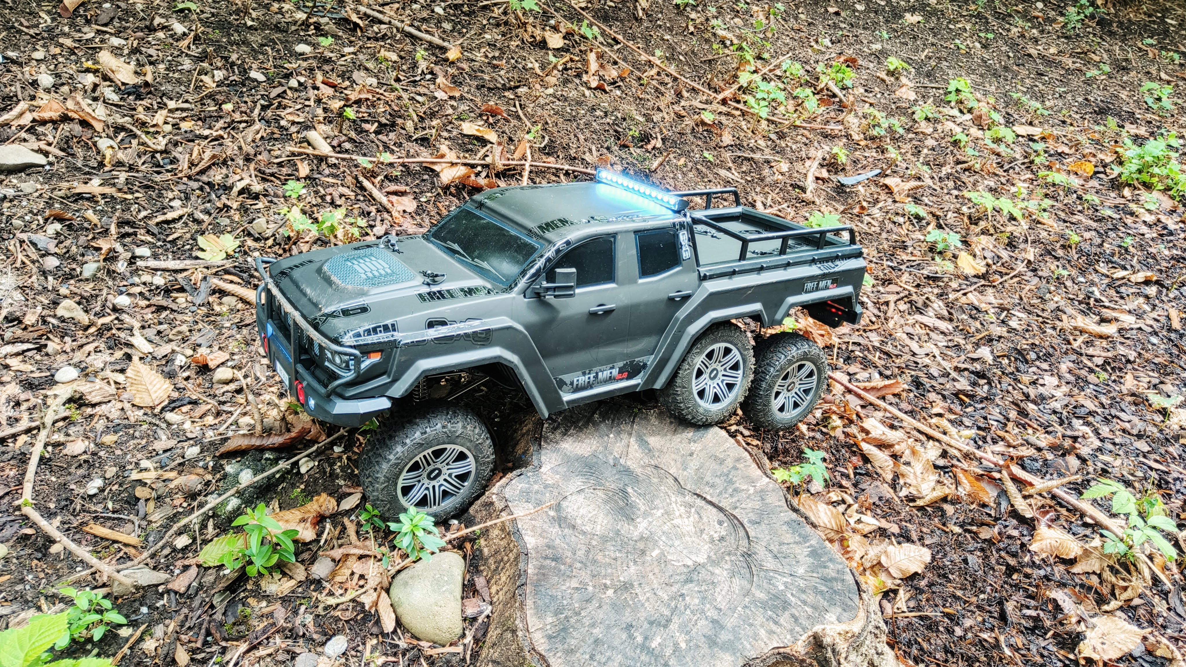 Zu Beginn sollte man nicht überrascht sein, wenn bereits nach wenigen Minuten der Fahrspaß zu Ende ist auf schwierigem Gelände. Der Akku braucht tatsächlich mehrere Ladezyklen, bis er seine Kapazität voll entfalten kann. Sobald das der Fall ist, macht eine Fahrt mit dem Free Men 2.0 6x6 über Äste, Felsen oder Waldboden eine Menge Laune – leider ist der Spaß verhältnismäßig schnell vorbei.