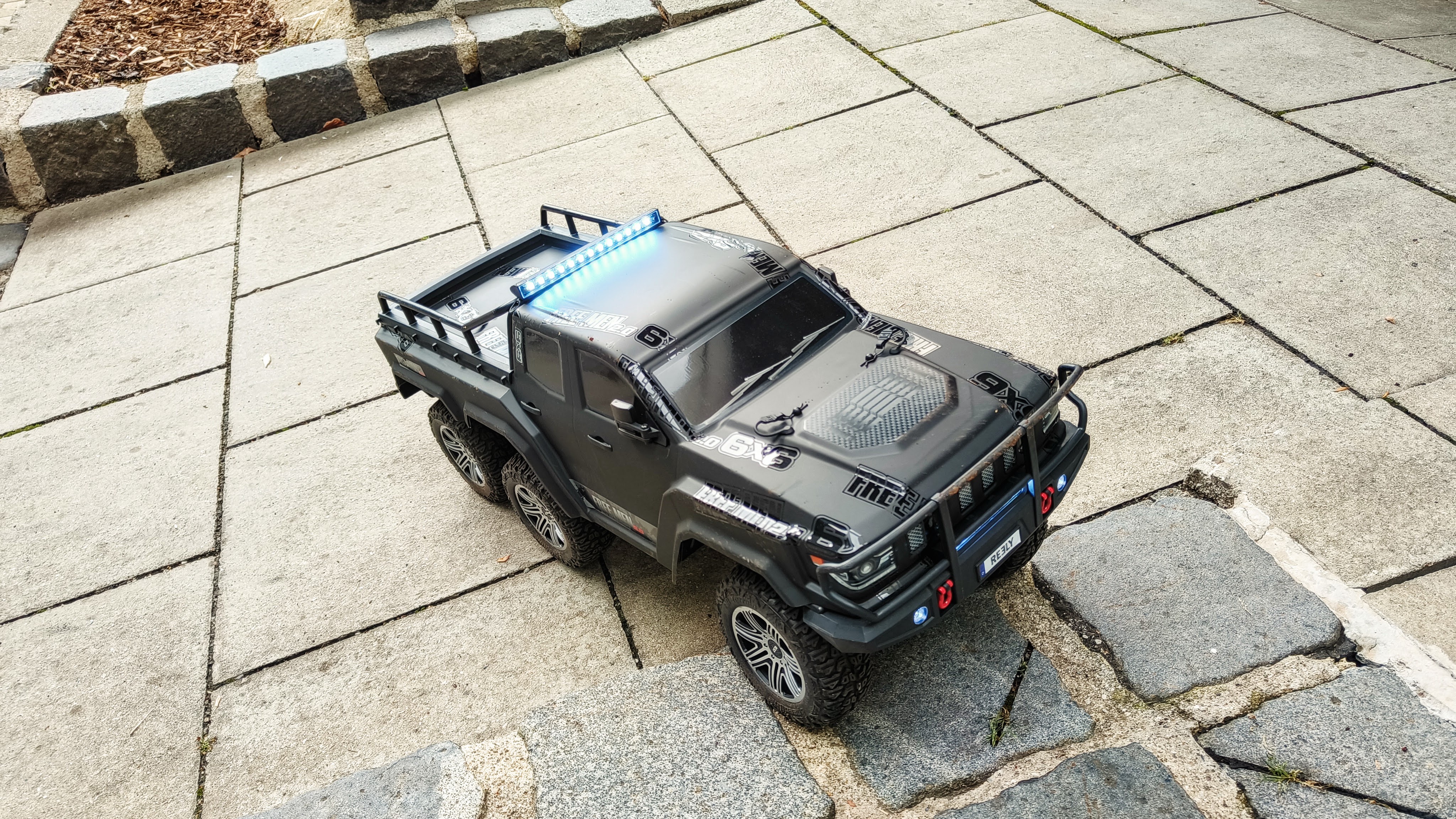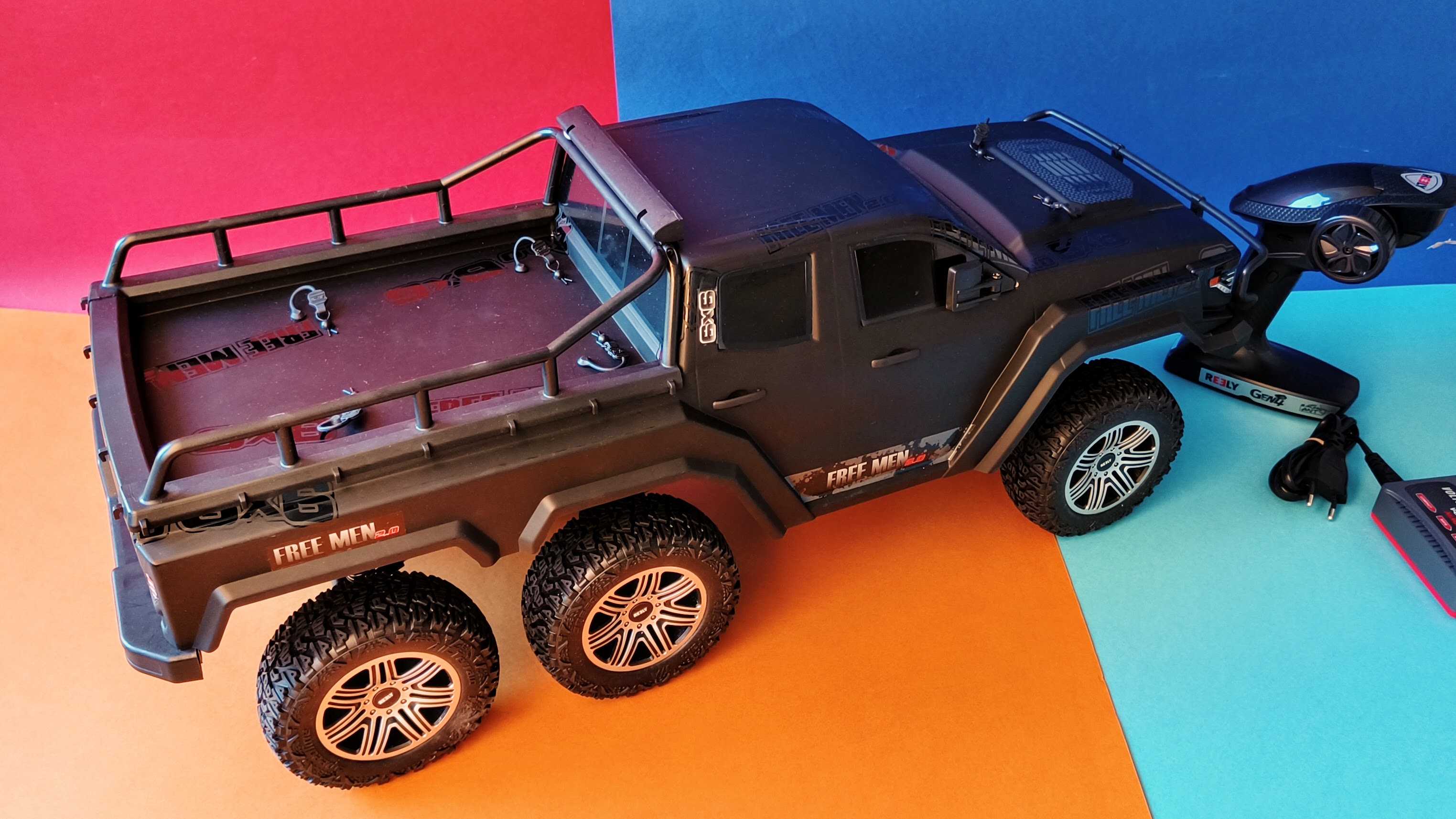 Beim Reely Free Men 2.0 6x6 handelt es sich um eine Neuauflage des Scale-Crawlers Free Men 2.0 (Testbericht). Der größte Unterschied zum Vorgänger: Das Fahrzeug setzt auf drei Achsen mit Allradantrieb (6x6). Als Vorbild für die Karosserie dient jetzt keine G-Klasse von Mercedes-Benz, sondern ein Pick-up. Das RC-Auto ist „ready to run“ (RTR) – kann also nach dem Aufladen des Akkus direkt in Betrieb genommen werden.