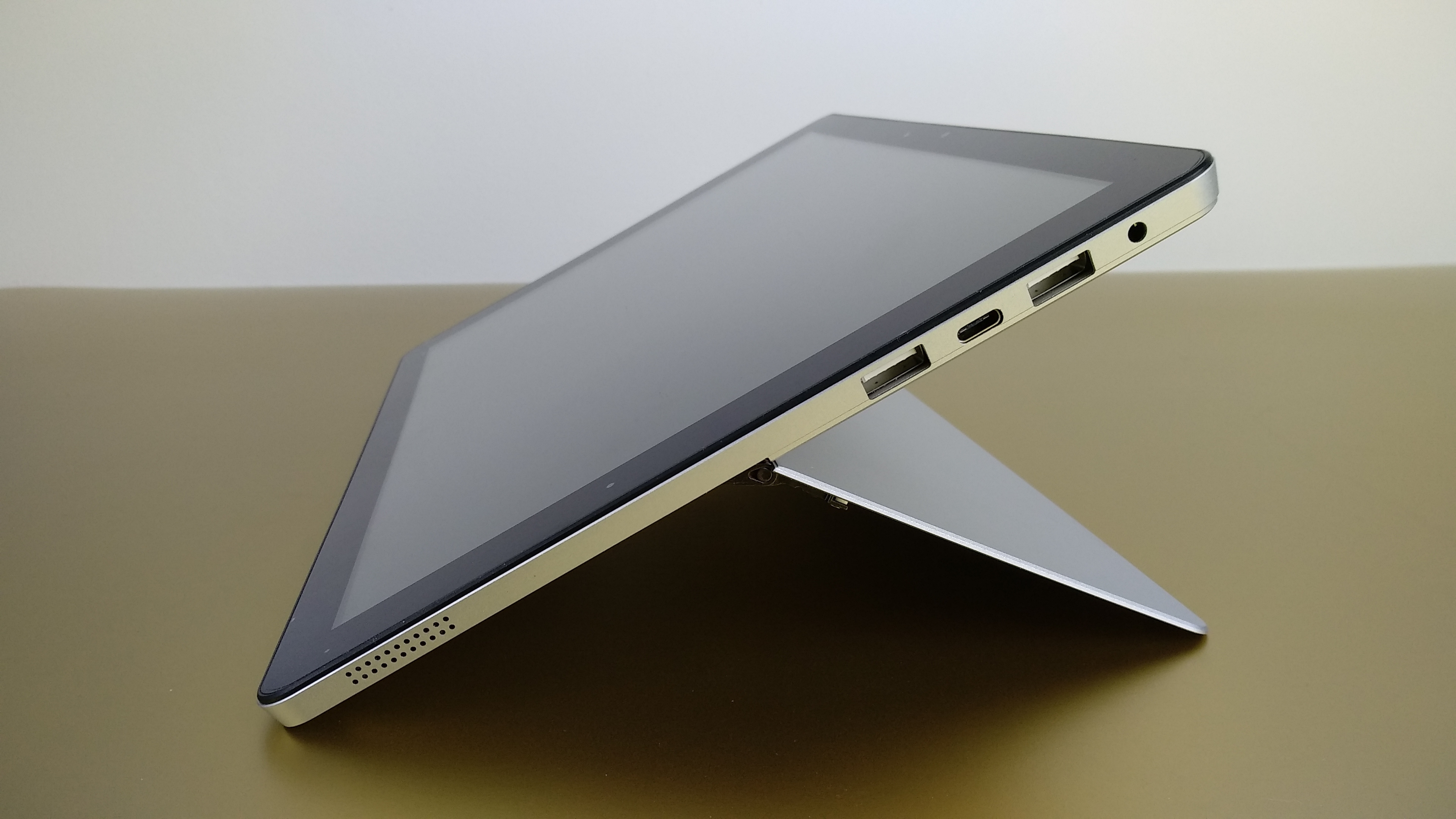 Mit dem 37-Wh-Akku kamen wir im Test bis auf zu acht Stunden Laufzeit, das Aufladen nimmt um die drei Stunden in Anspruch. Statt nur einen Lautsprecher links wie beim Surbook Mini gibt es beim Surbook Stereolautsprecher auf beiden Seiten des Tablets. Und die klingen sogar recht ordentlich, dürften allerdings etwas mehr Reserven in Sachen Lautstärke bieten.