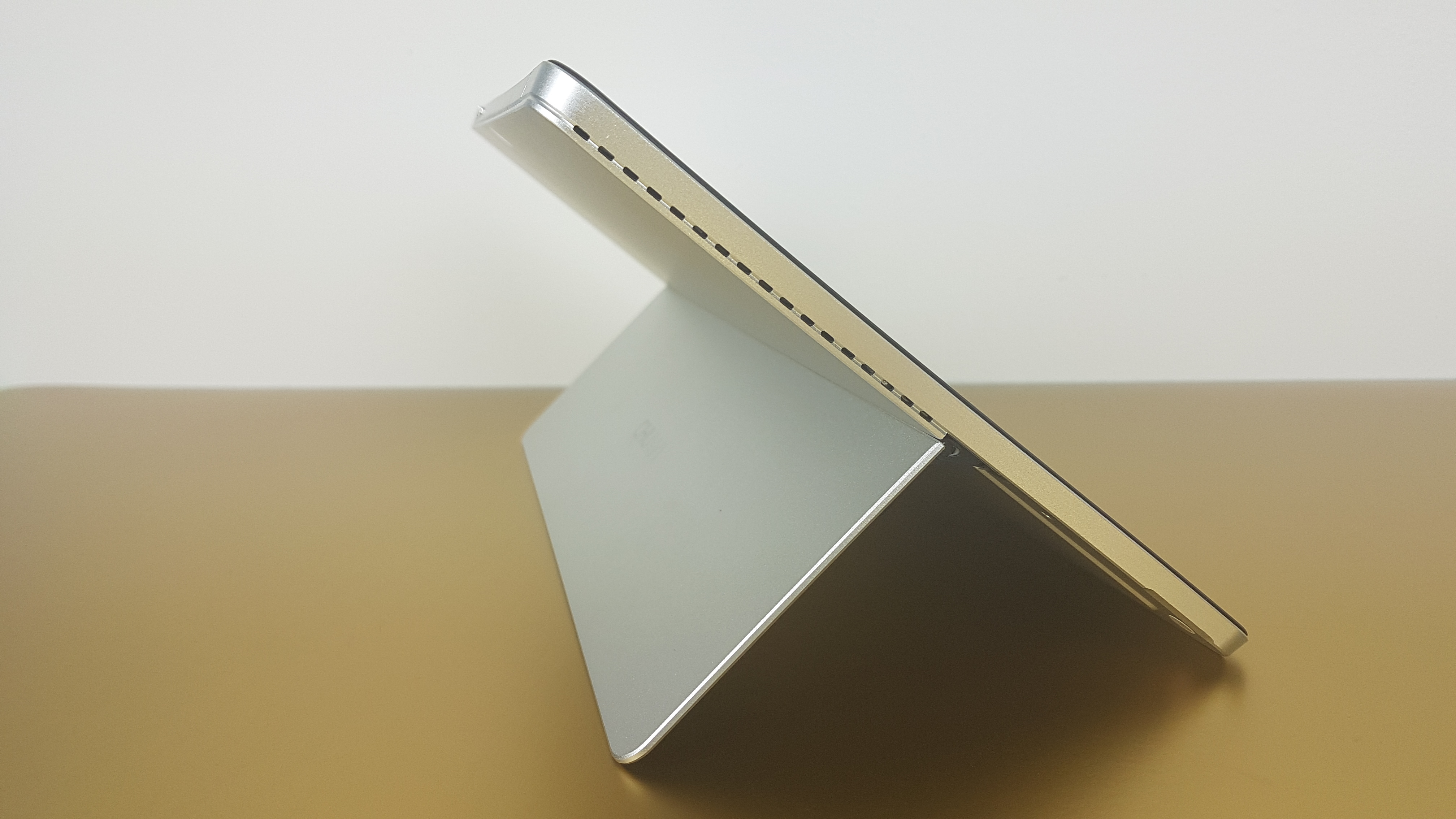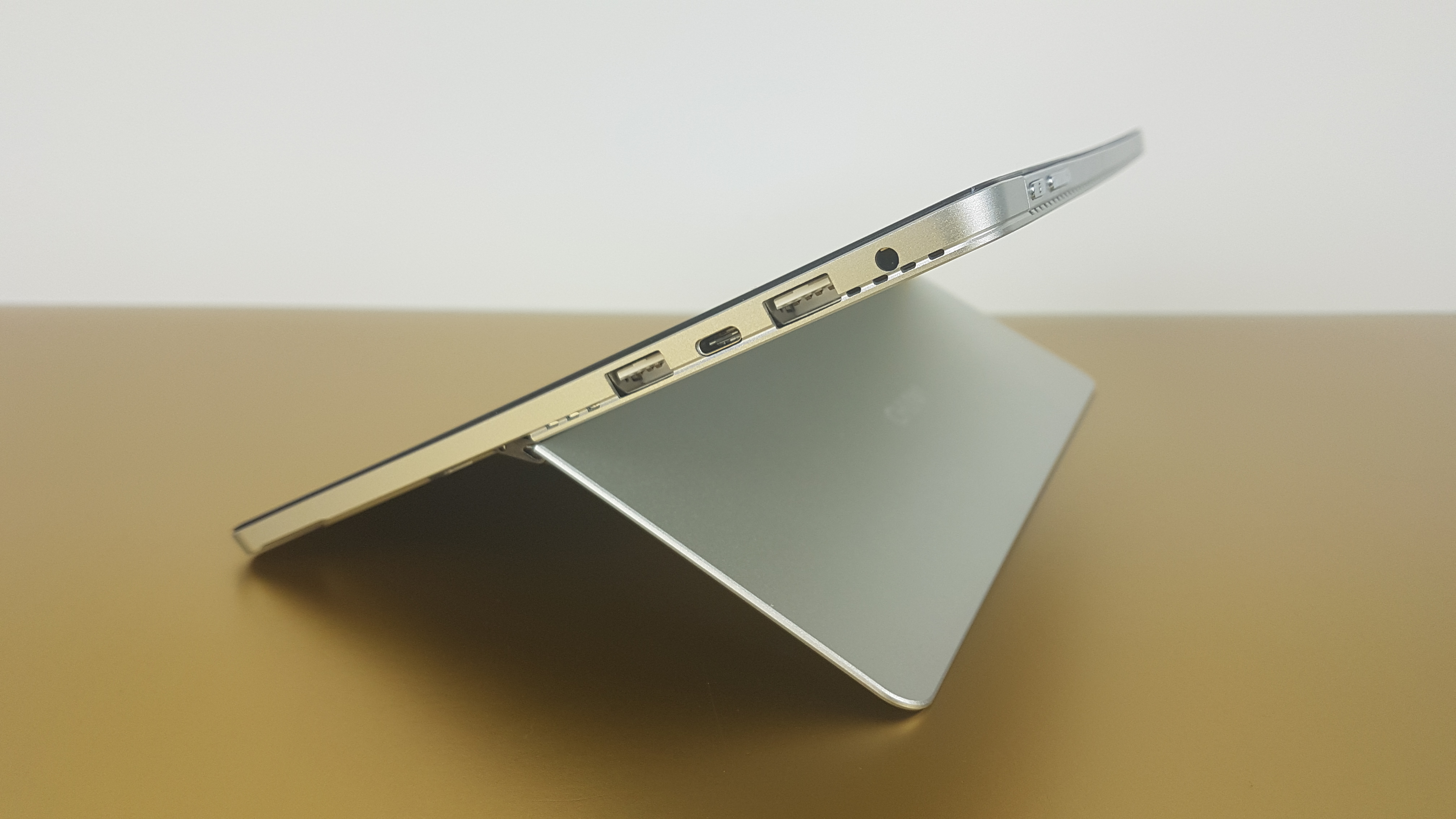 Surface typisch besitzt das Surbook Mini 10.8 einen Kickstand zum Aufstellen des Geräts. Dieser lässt sich stufenlos bis zu einem Winkel von 125 Grad neigen. Der Ständer macht einen soliden Eindruck und hielt im Test seine Position zuverlässig. Auf der Rückseite befindet sich ein MicroSD-Kartenslot. Oben am Tablet sitzen der Power-Button und die Lautstärkewippe. Auf der rechten Seite sind zwei USB-3.0-Buchsen, ein USB-Type-C-Anschluss und ein Klinkenstecker angebracht. Lüftungsgitter zum Ableiten der Wärme befinden sich an den Seiten und oben. Links hinter den Entlüftungsschlitzen hat der Hersteller einen Lautsprecher versteckt.