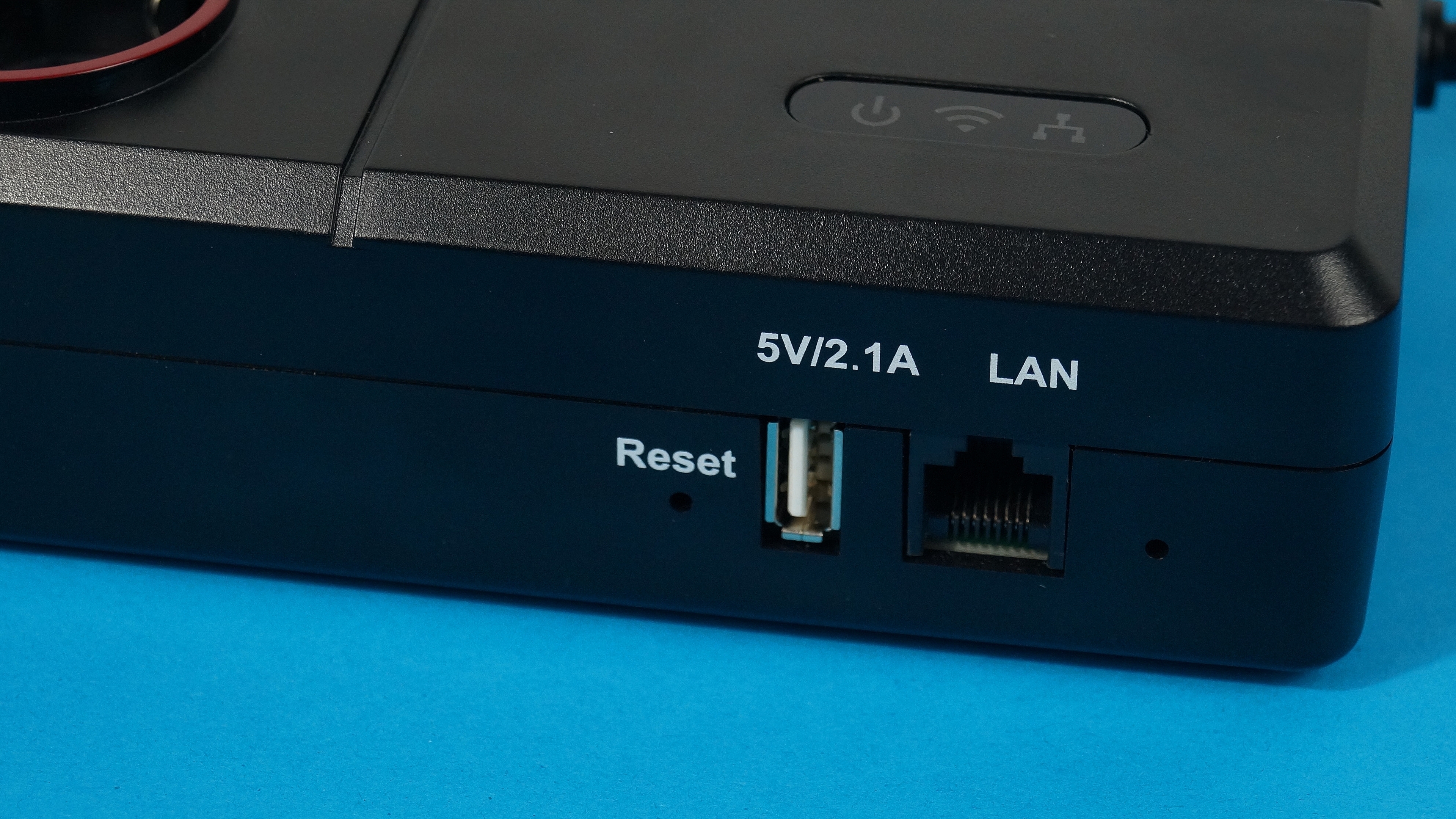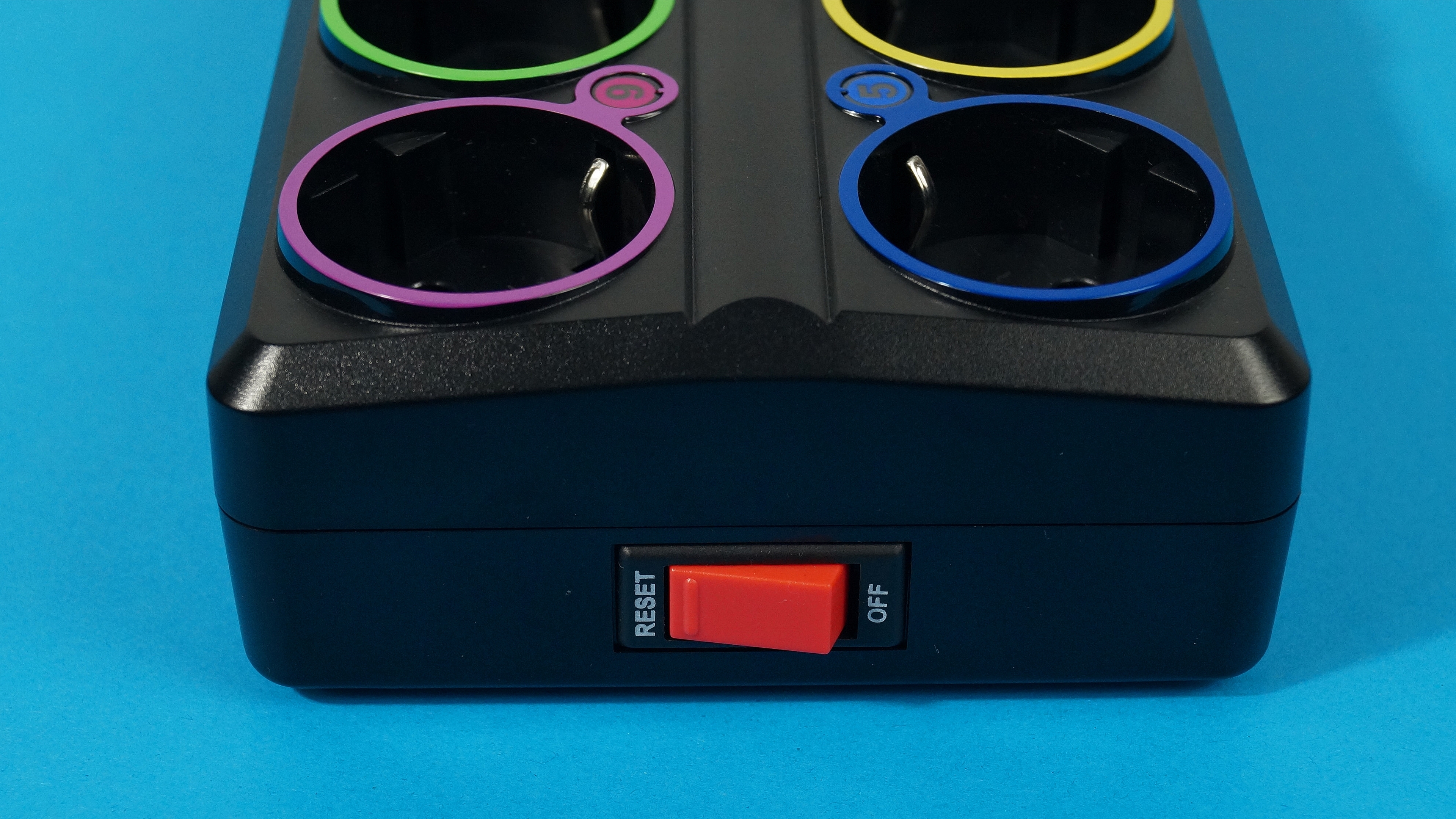 Positiv fällt auf, dass der Hersteller die insgesamt sechs einzeln schaltbaren Steckdosen nicht nur mit gut unterscheidbaren Farben markiert, sondern zusätzlich mit gut lesbaren, LED-hintergrundbeleuchteten Ziffern versehen hat. Ebenfalls auf der Oberseite findet sich ein kleines Feld mit Beleuchtungselementen zur Status-Anzeige für Power, WLAN und LAN. Die uns vorliegende Version der Steckerleiste verfügt über die Möglichkeit, das Gerät über ein Netzwerkkabel mit dem Router zu verbinden. Das soll allerdings mit der nächsten Revision wegfallen. Zusätzlich gibt es noch einen Reset-Taster zur Wiederherstellung des Auslieferungszustandes, der durch das Einführen eines schmalen Gegenstands wie beispielsweise einer Nadel oder Büroklammer ausgelöst wird.