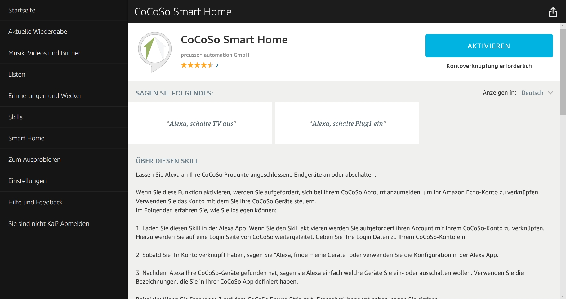 Die Aktivierung des Alexa-Skills verläuft wie gewohnt und ohne weitere Probleme, im Rahmen der Installation muss man die Cocoso-Account-Daten (E-Mail-Adresse und Passwort) angeben, um Zugriff zu erhalten.