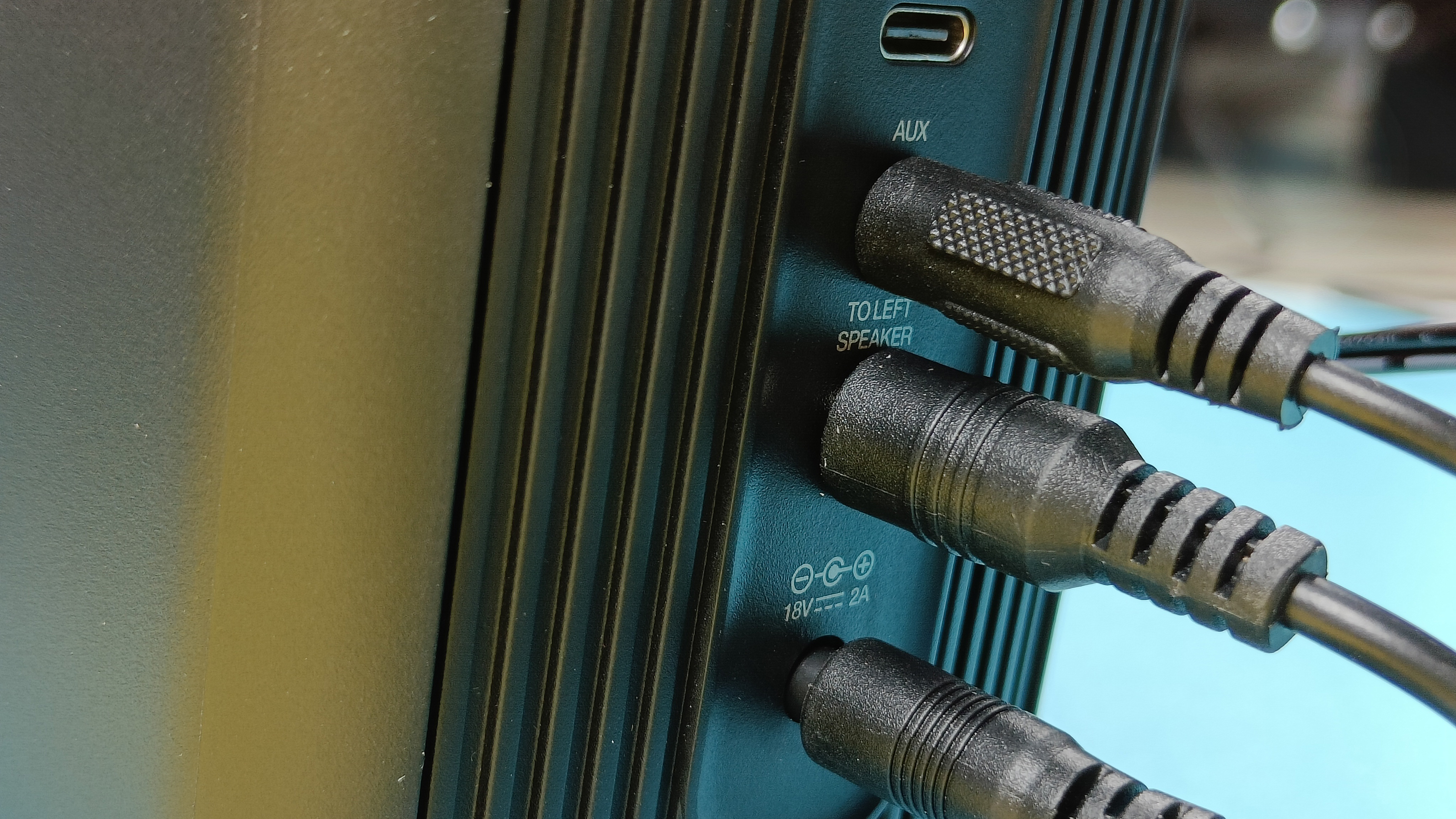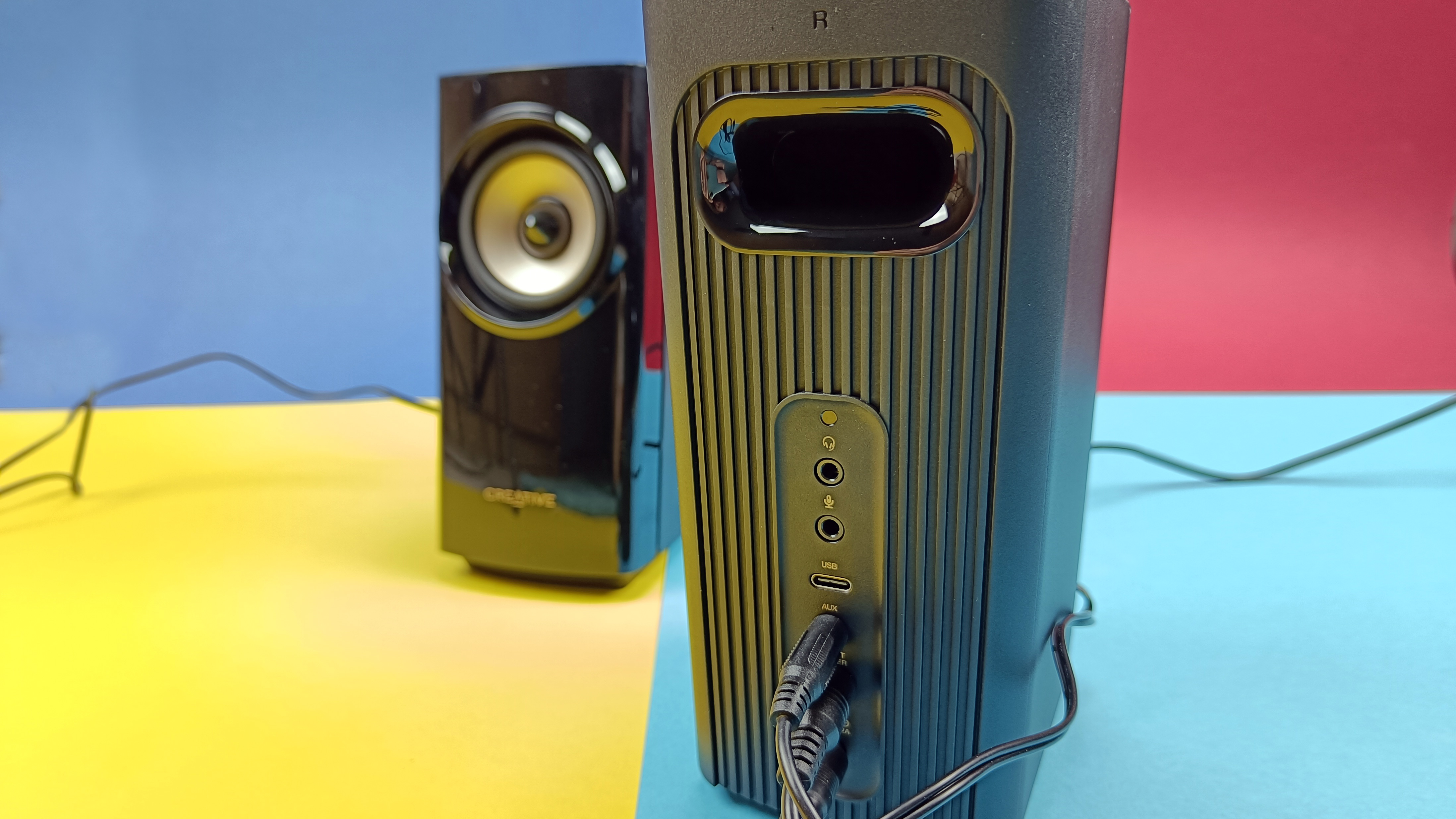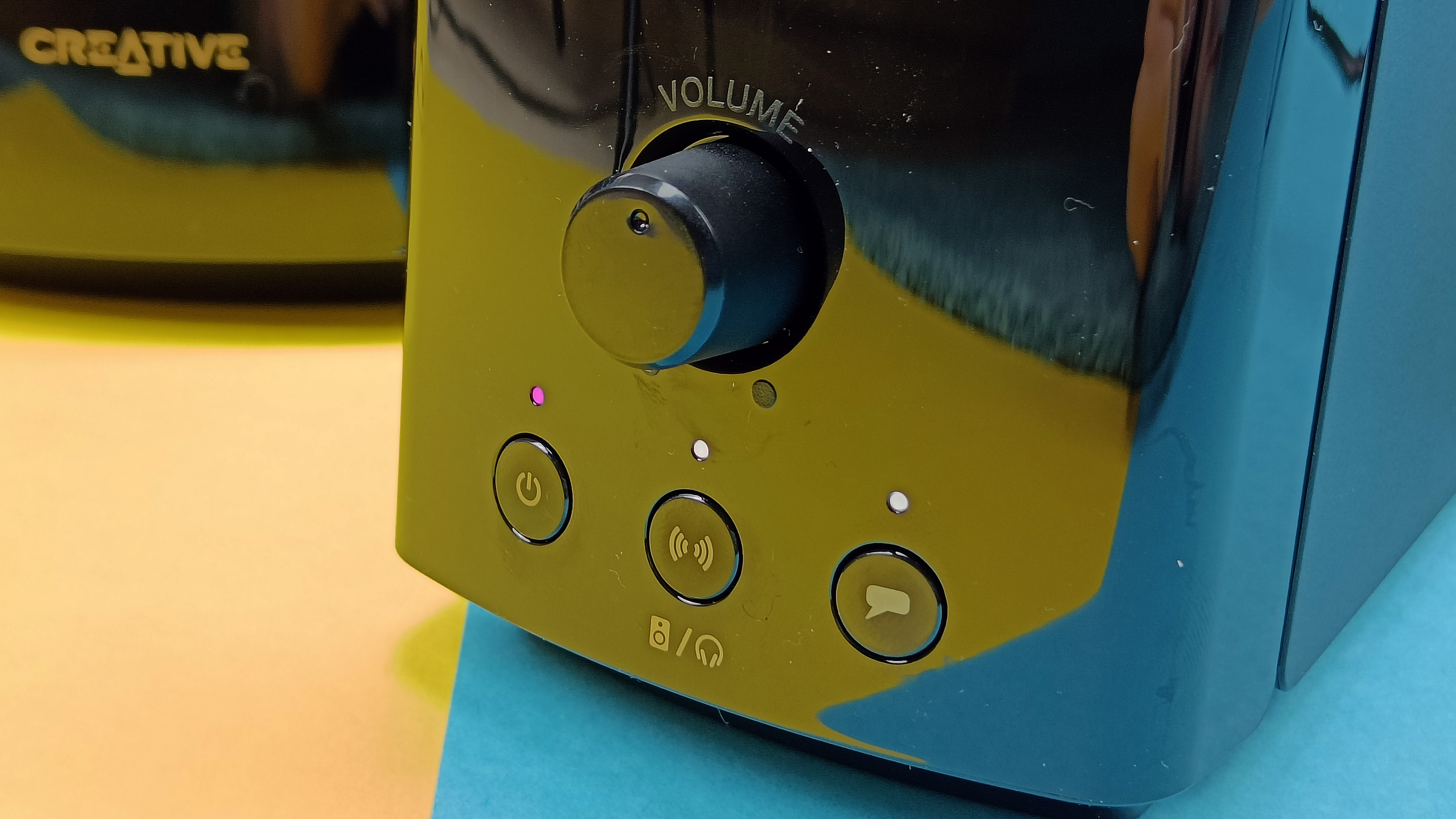Der Hauptlautsprecher bietet einen drehbaren Lautstärke-Knopf mit LED, eine Power-Taste, die gleichzeitig als Moduswahlschalter zwischen AUX- und Bluetooth-Betrieb dient sowie eine Taste für Surround-Klang und eine für klarere Sprachwiedergabe. Letzteres nennt der Hersteller „Clear Dialog“. Die Front des Satelliten-Speakers ist bis auf den Treiber frei von weiteren Verzierungen, lediglich ein goldener Creative-Schriftzug ist hier zu finden. Auf der Rückseite der Lautsprecher sind am oberen Ende je ein Bassreflex-Port zu sehen. Die Hauptbox bietet zudem USB-C- und AUX-Anschluss sowie eine Buchse für Strom und Verbindung zur zweiten Box. Außerdem dürfen Nutzer hier Kopfhörer und Mikrofon anstöpseln. Gut: Ein längerer Druck auf die Surround-Taste wechselt anschließend zwischen Lautsprecher- und Headset-Ausgabe.