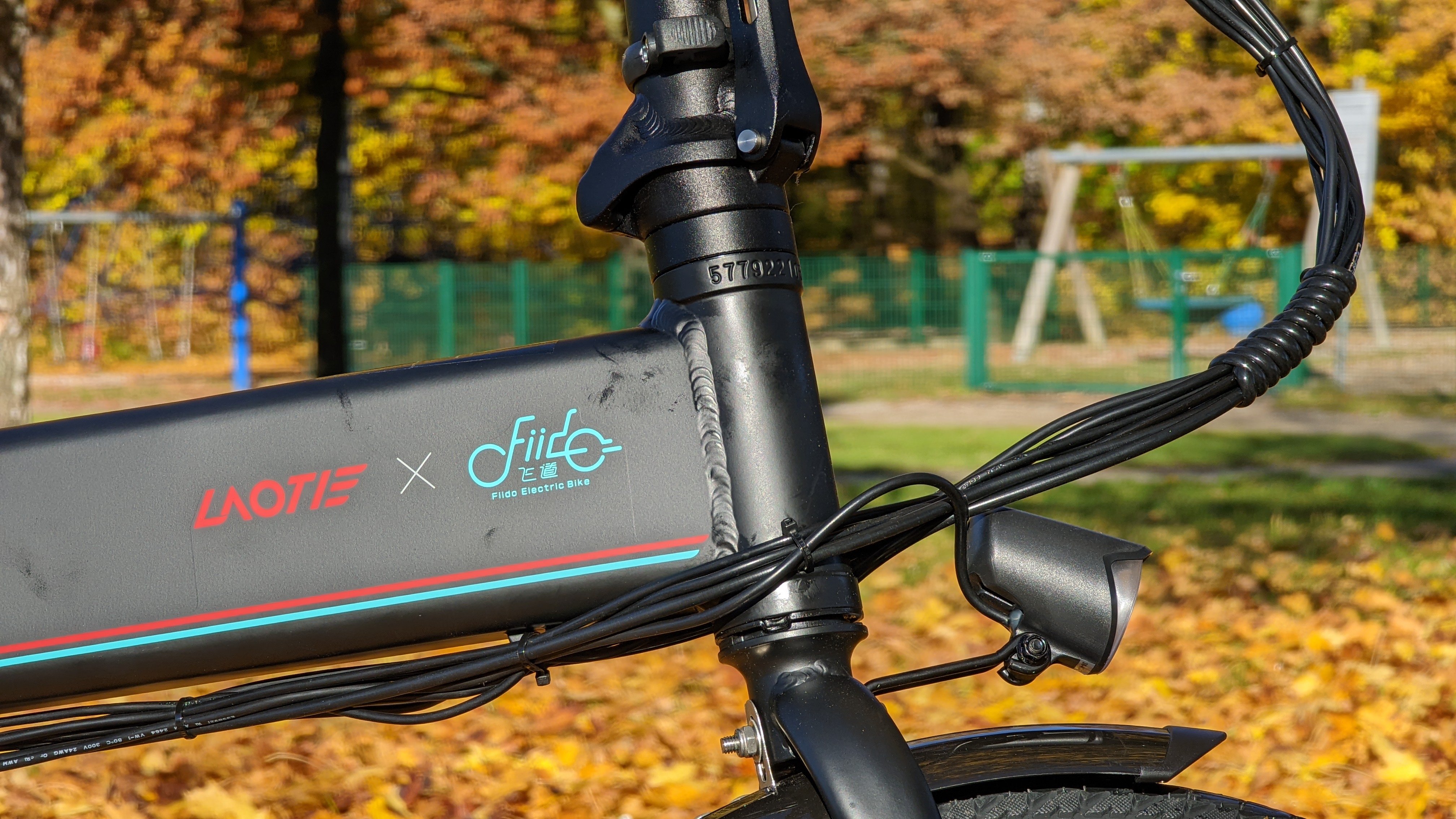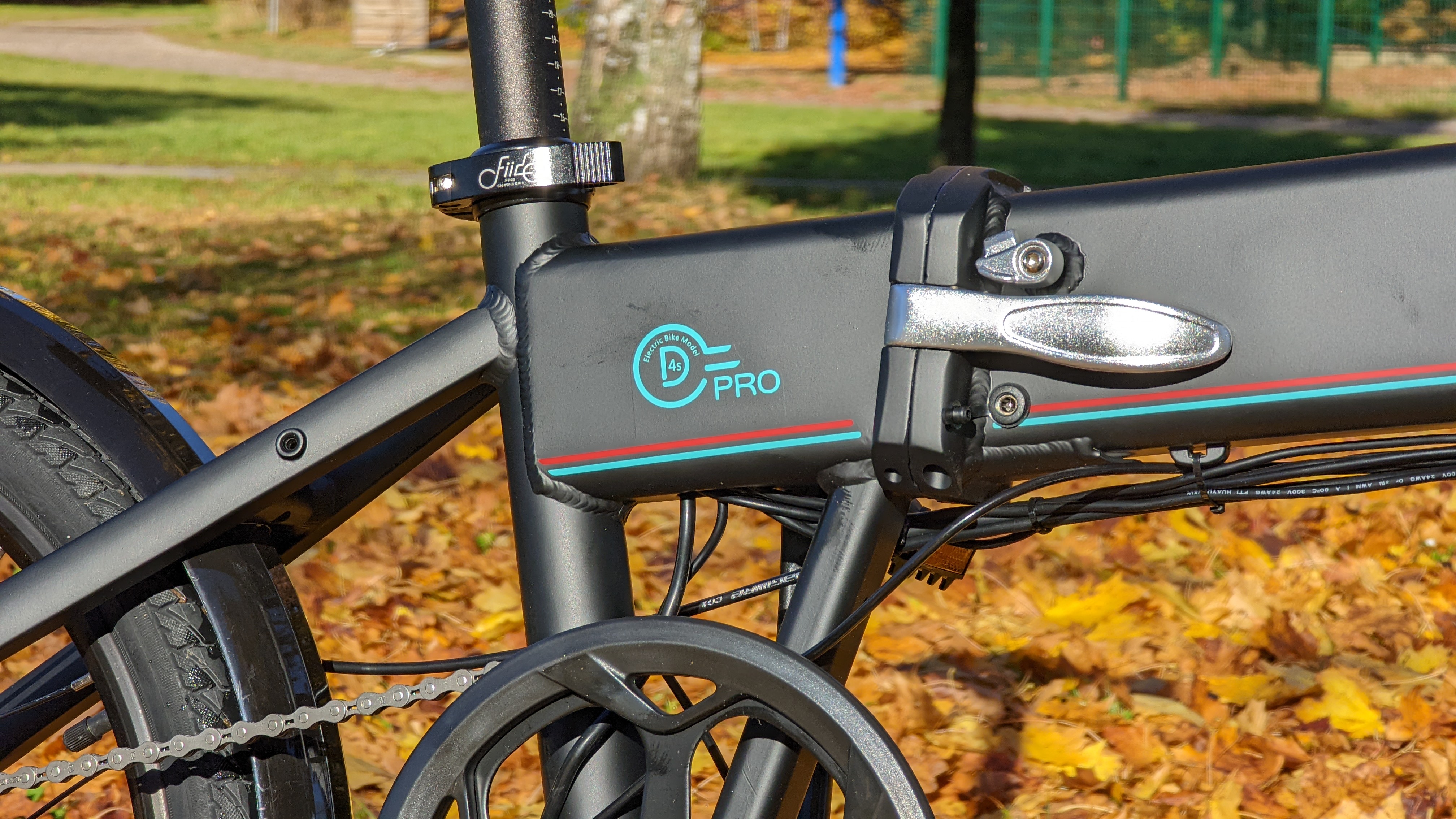 Optisch ähneln sich das D4S und das D4S Pro stark. Beide E-Bikes sind verhältnismäßig flach und etwa 150 Zentimeter lang. Der breite, klappbare Rahmensteg, in dem sich der Akku versteckt, dominiert das Design. Neben dem bereits bekannten Fiido Schriftzug in Türkis gesellt sich nun in Rot das Logo von Laotie dazu. Die Lenkstange ist wieder höhenverstellbar (92 bis 108 Zentimeter) und auch die Sattelstange lässt sich angenehm weit herausfahren (70 bis 110 Zentimeter). Das ist bei einem derart kompakten E-Bike keineswegs selbstverständlich, aber wichtig, damit es auch größere Fahrer ergonomisch sinnvoll nutzen können. Als besonderes und ziemlich cooles Feature integriert Fiido in der Sattelstange eine Luftpumpe. Diese ist nicht ganz einfach zu bedienen. Allerdings kann sie im Notfall eine echte Hilfe sein.