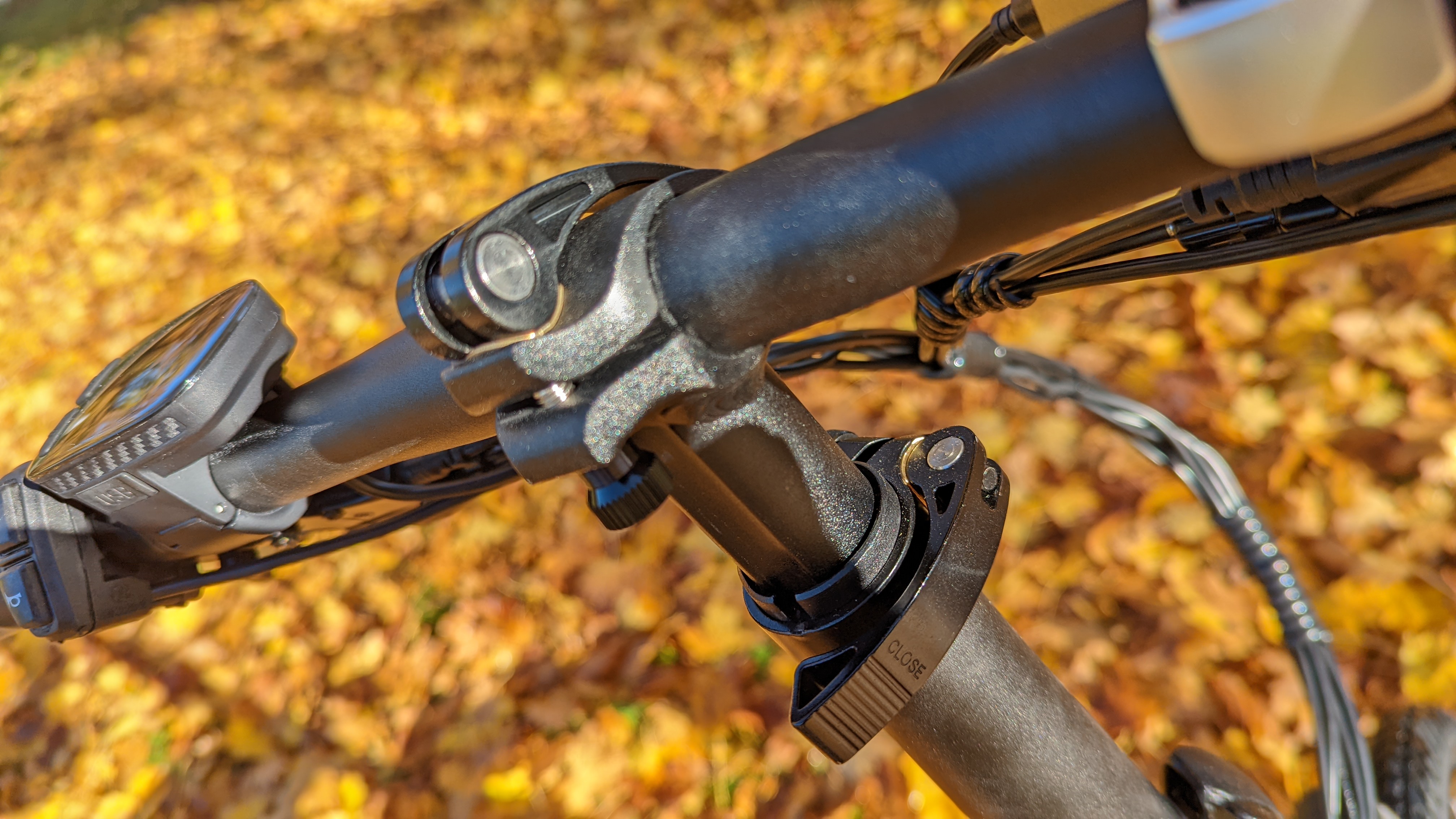 Das Kabelmanagement ist nicht schön gelöst. So bündelt Fiido alle acht von Lenker abgehenden Kabel in einem Strang, der im weiten Bogen vor der Lenkstange nach unten führt und überwiegend unter der Rahmenquerstange nach hinten geleitet wird. Dies ist der Konstruktion geschuldet. Hätte Fiido die Kabel in der Lenkstange verstecken wollen, wäre diese nicht mehr höhenverstellbar gewesen. Der große Bogen ist nötig, damit die Lenkstange zusammenklappbar bleibt.