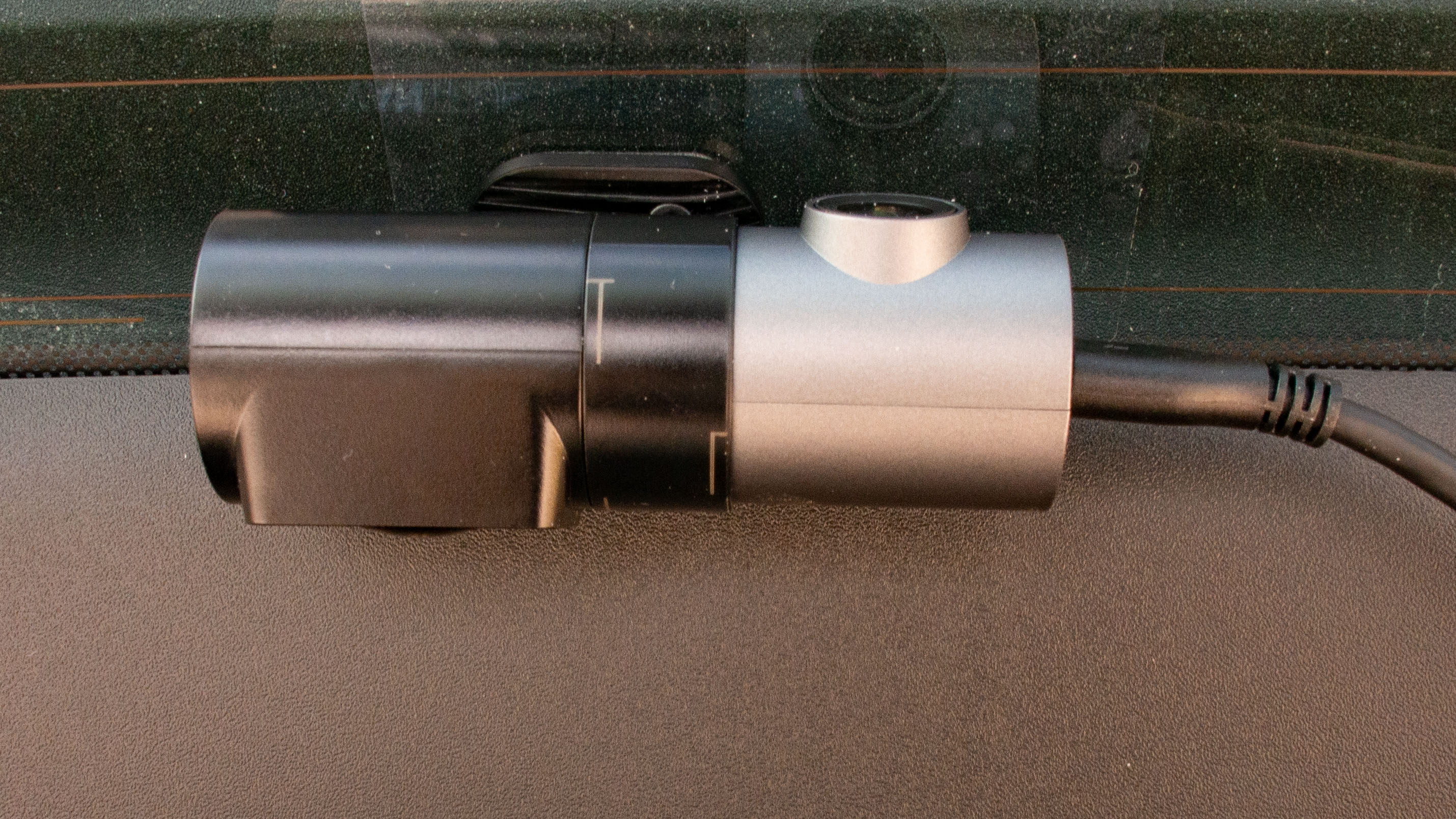 Der zweite Zylinder ist nur 8,5 Zentimeter lang und hat 3,2 Zentimeter Durchmesser, neben ebenfalls zwei Objektiven und Infrarotbeleuchtung ist hier nur der USB-C-Anschluss zur Frontkamera zu finden. Er wiegt nur 53 Gramm. Beide Kameras sind unauffällig und schränken kaum das Sichtfeld des Fahrers ein.