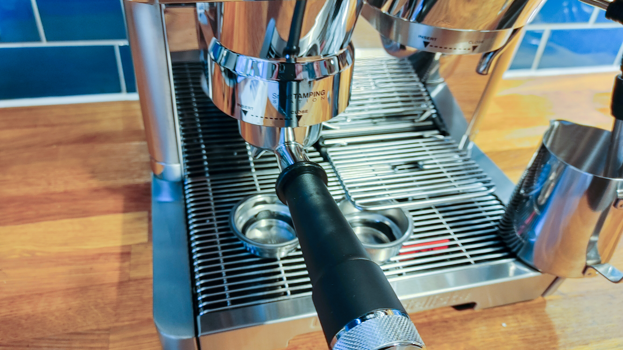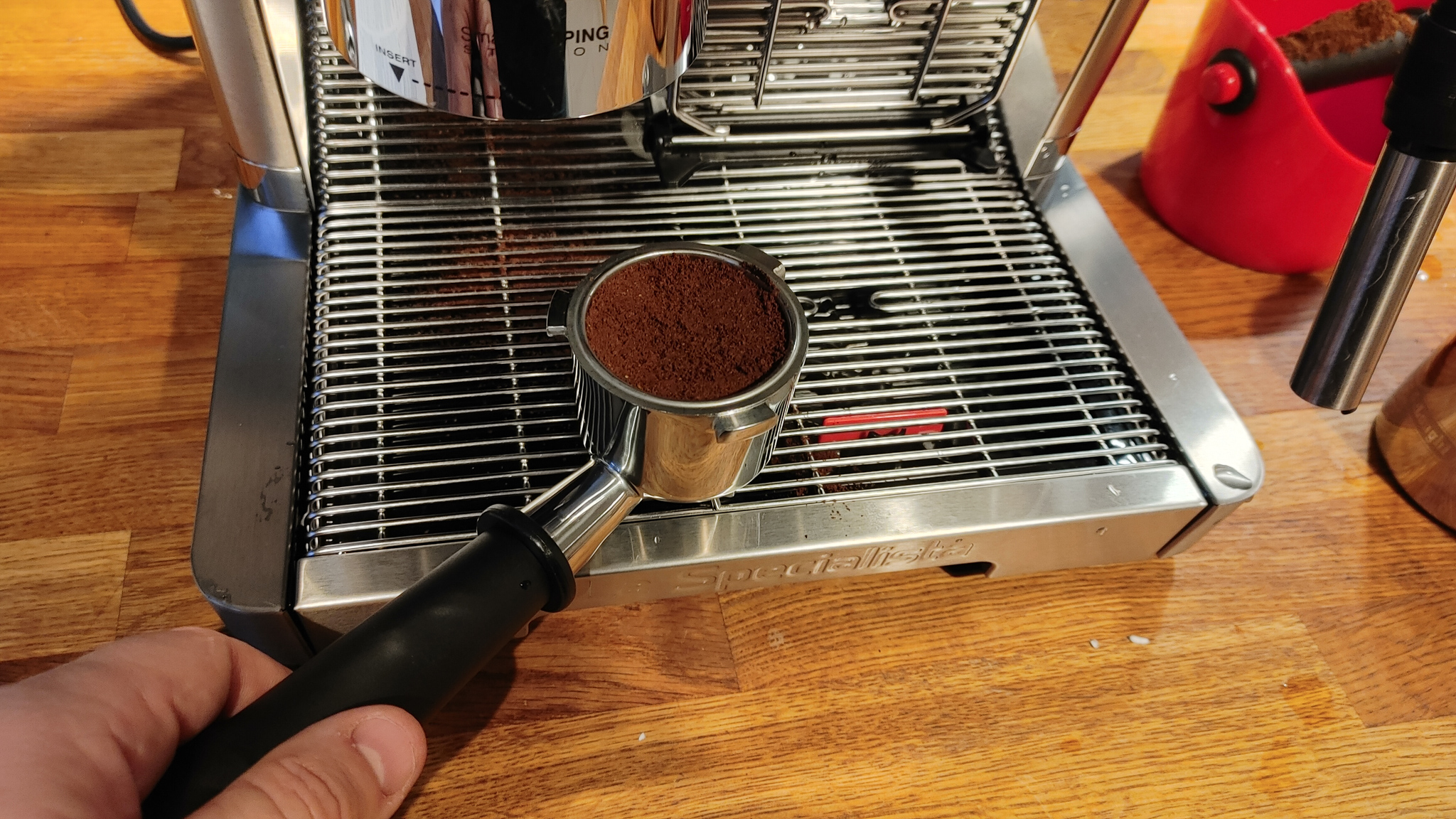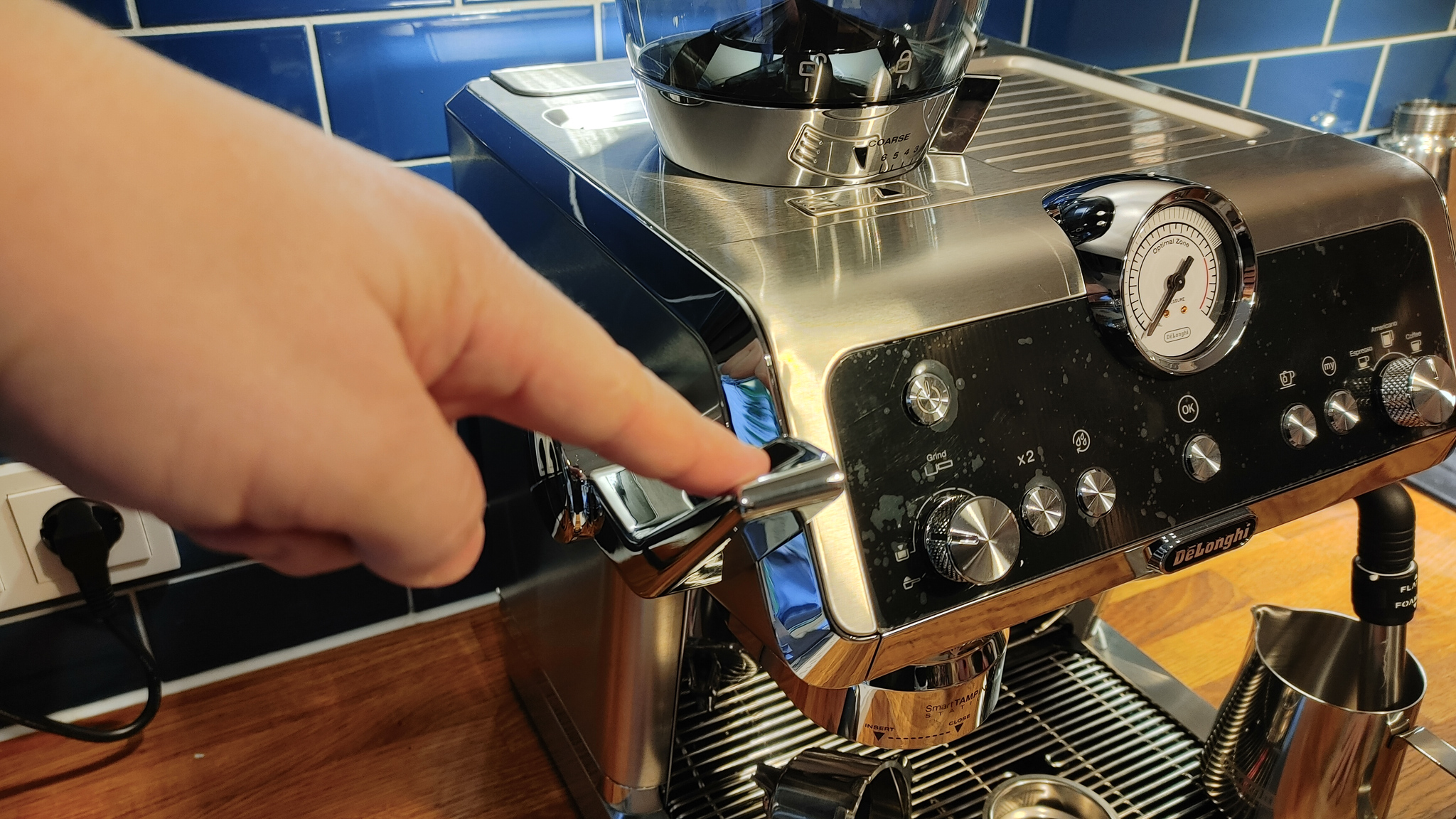 Denn nachdem das System durchgespült ist, geht es ans Anpassen des Mahlgrads, die Füllmenge und das Tamping. De’Longhi empfiehlt die mittlere Einstellung des Mahlgrads, um sich anschließend vorzutasten. Die eigentliche Einrichtung ist simpel: Siebträger einsetzen, ganz nach rechts drehen und die Maschine mahlt eine Portion in den Siebträger. Anschließend zieht man den Tamping-Hebel links nach vorne und schiebt ihn ganz zurück. Die La Specialista erinnert mit einem blinkenden Icon daran, wenn der Hebel gezogen wurde.