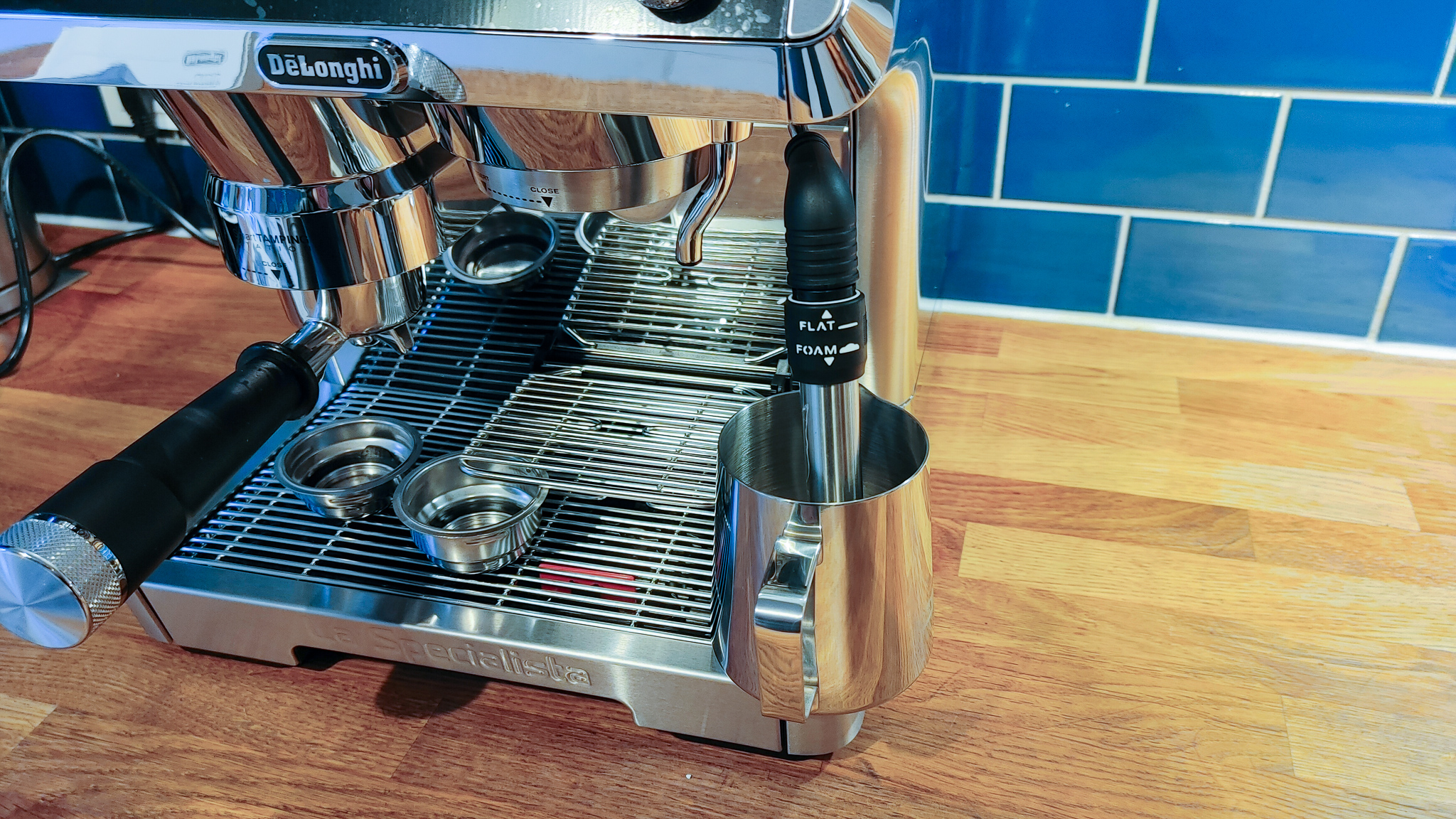 Milch für Cappuccino, Flat White oder Latte Macchiato muss man selbst aufschäumen. Dazu legt De’Longhi eine kleine Kanne aus Metall bei. Die Dampflanze sitzt rechts an der Maschine und hat zwei Einstellungen: entweder festerer Schaum für einen Flat White oder etwas fluffigeren Schaum für einen Cappuccino. Im Test hatten wir meist den Cappuccino-Modus, damit kann man sehr gut das Verhältnis aus heißer Milch und Schaum kontrollieren. Die Dampffunktion schaltet man über einen Drehknopf an der rechten Seite ein. Wobei es hier keine Abstufungen gibt, man Dampft entweder voll oder gar nicht. Mit etwas Übung bekommt man schnell vernünftigen Milchschaum hin.