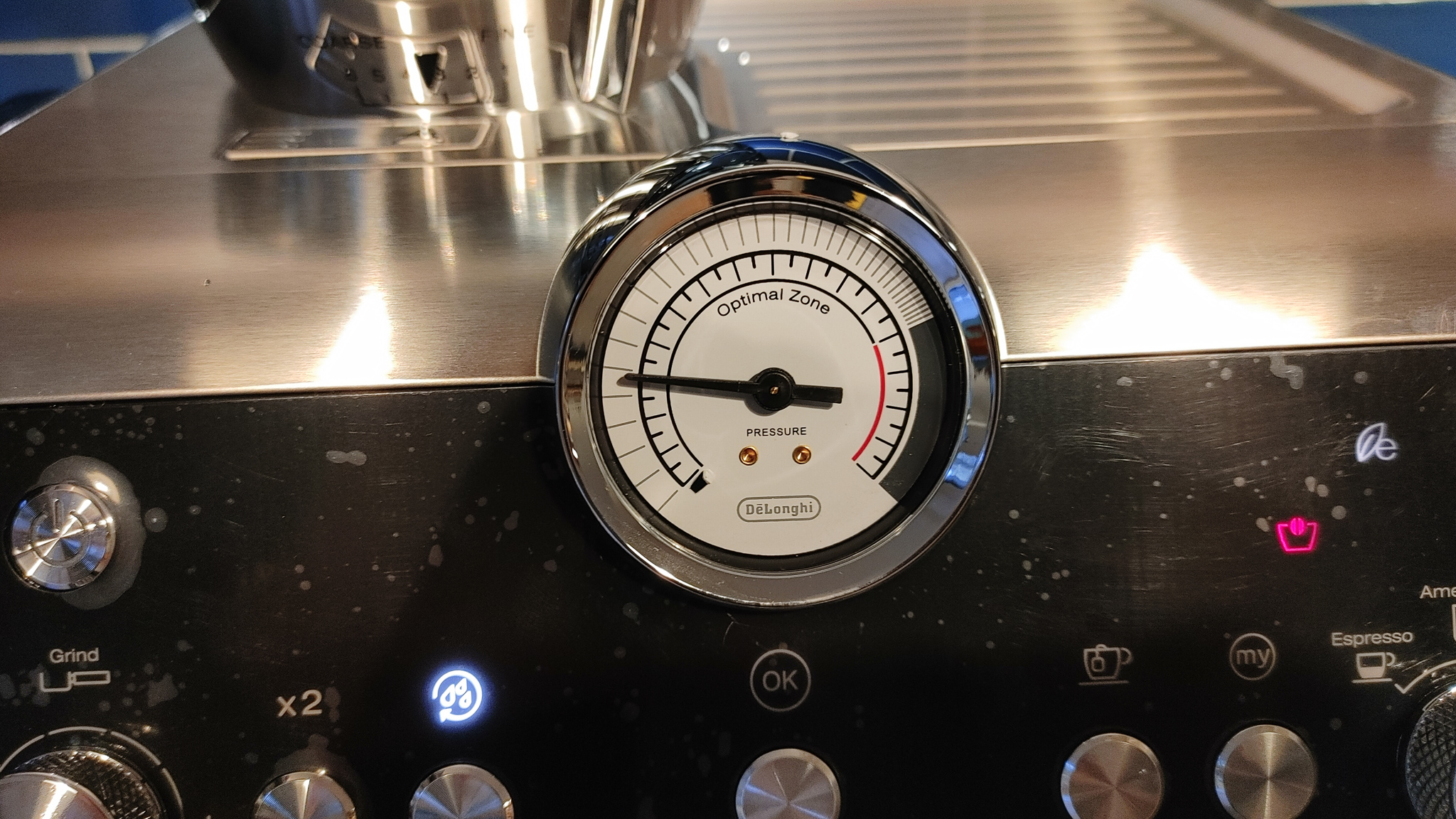 Während des Brühvorgangs kann man an einem Manometer den Druck sehen. Das ist bedingt hilfreich, zwei Drittel der Anzeige werden als “Optimal Pressure” gekennzeichnet, lediglich das letzte Drittel ist rot markiert. Sprich, damit kann man vor allem Fehler suchen, aber den Kaffee wenig optimieren. Dennoch, in den Standardeinstellungen mit einmal Tampen kommt ein sehr guter Espresso mit einer schönen Crema in die Tasse.