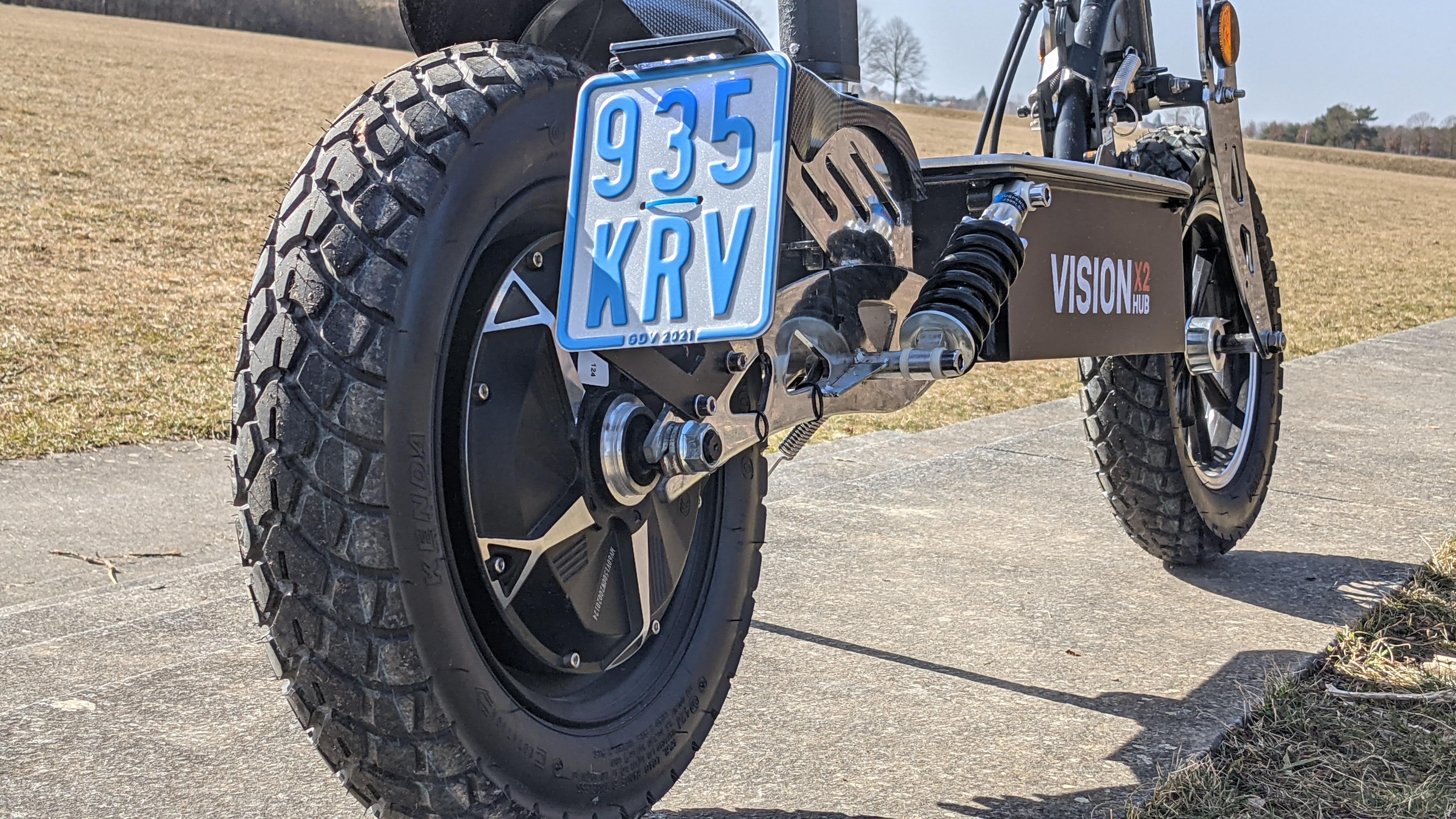 Der Eflux Vision X2 Hub hat breite, 10 Zoll große Luftreifen. Diese allein fangen bereits die meisten Unebenheiten ab. Zusätzlich baut der Hersteller vorne und hinten je eine Federung ein, welche die Fahrt komfortabler und weicher gestalten. Tatsächlich ist die Kombination aus dicken Luftreifen und Federung derart sanft, dass der Eflux auch offroad eine gute Figur macht.