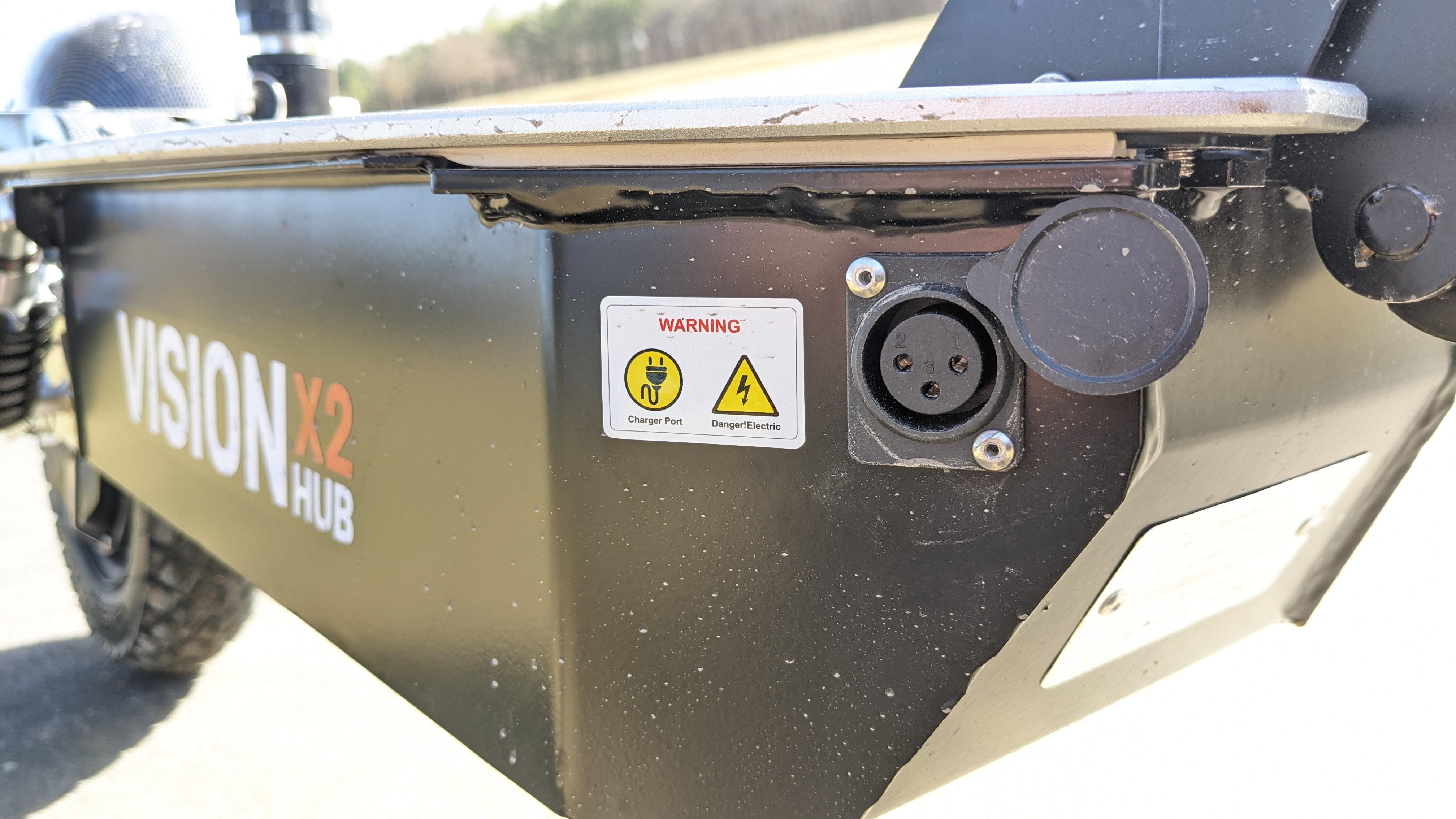 Den Akku kann man nach dem Aufschrauben des Trittbretts entnehmen. Allerdings empfiehlt der Hersteller, ihn ausschließlich im Roller zu laden. Das ist sehr schade, da gerade im urbanen Umfeld, welches sich für die Nutzung des Eflux Vision X2 anbietet, an den meisten Parkplätzen keine Lademöglichkeit gibt.