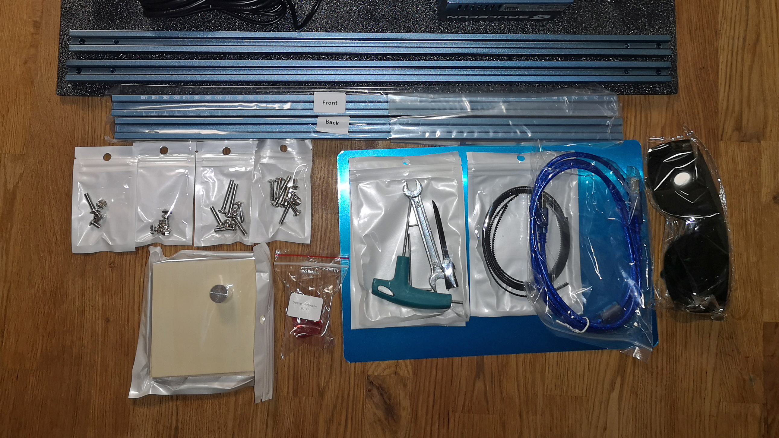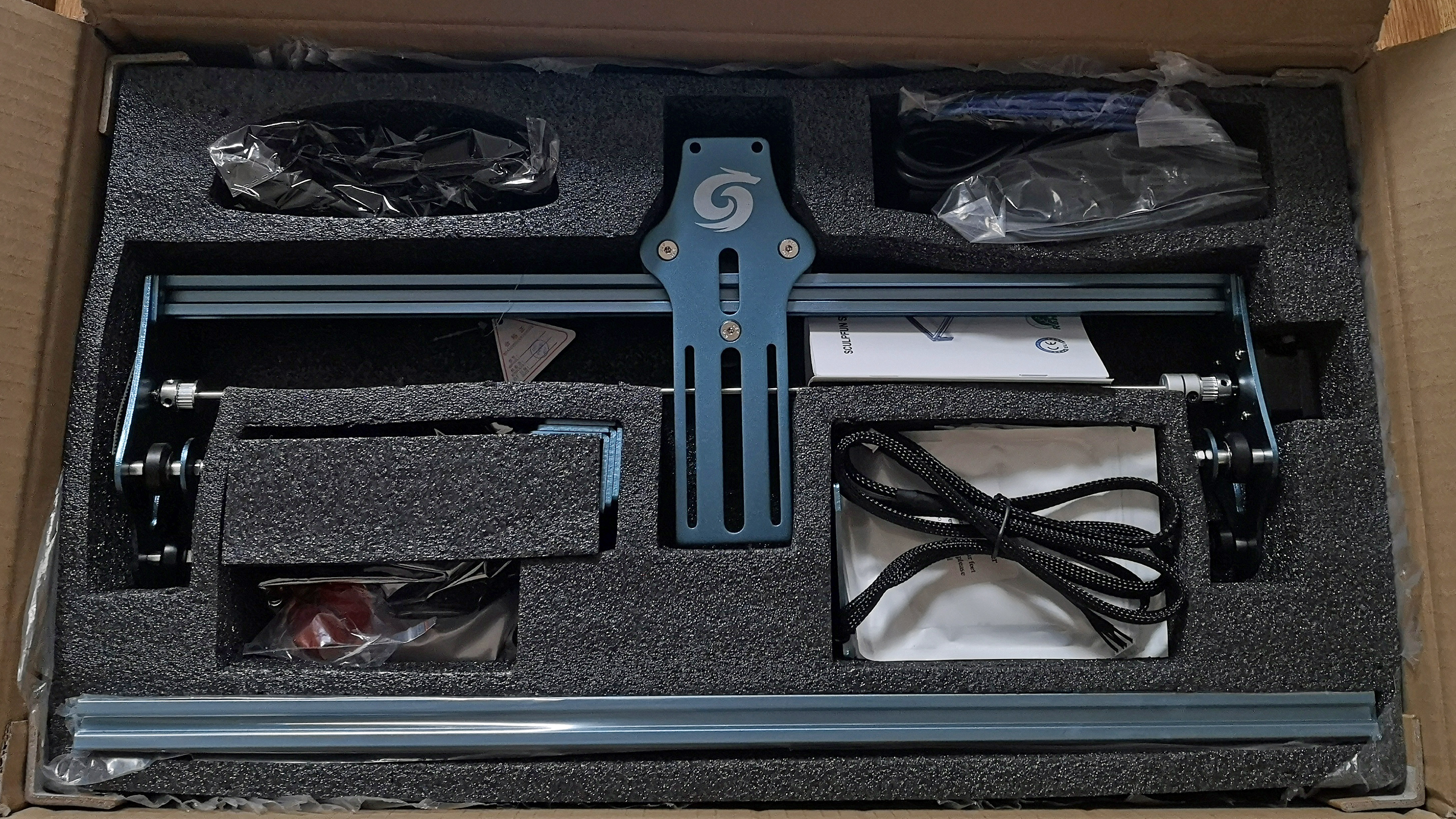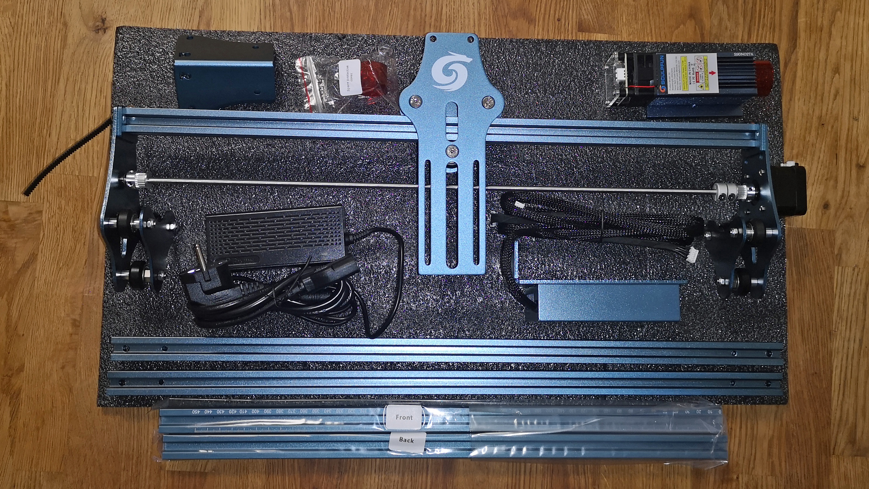 Der Bausatz vom S9 kommt ordentlich verpackt in der Redaktion an. Im Inneren liegen die einzelnen Teile des Rahmens inklusive Schrauben und Werkzeug. Auch der vormontierte Laser-Kopf, ein USB-Kabel, einige Musterstücke zum Gravieren und eine knappe Anleitung liegen im Karton. Die Schrauben sind nach den Schritten in der Anleitung geordnet verpackt. Die einzelnen Teile sind alle ordentlich verarbeitet und hinterlassen einen wertigen Eindruck.