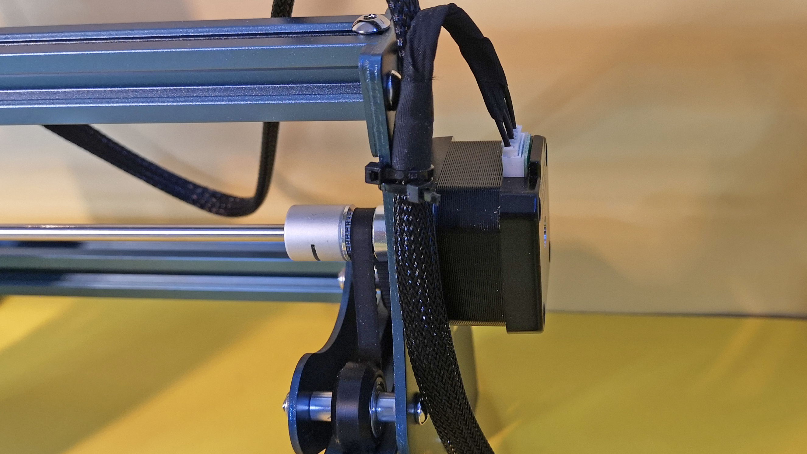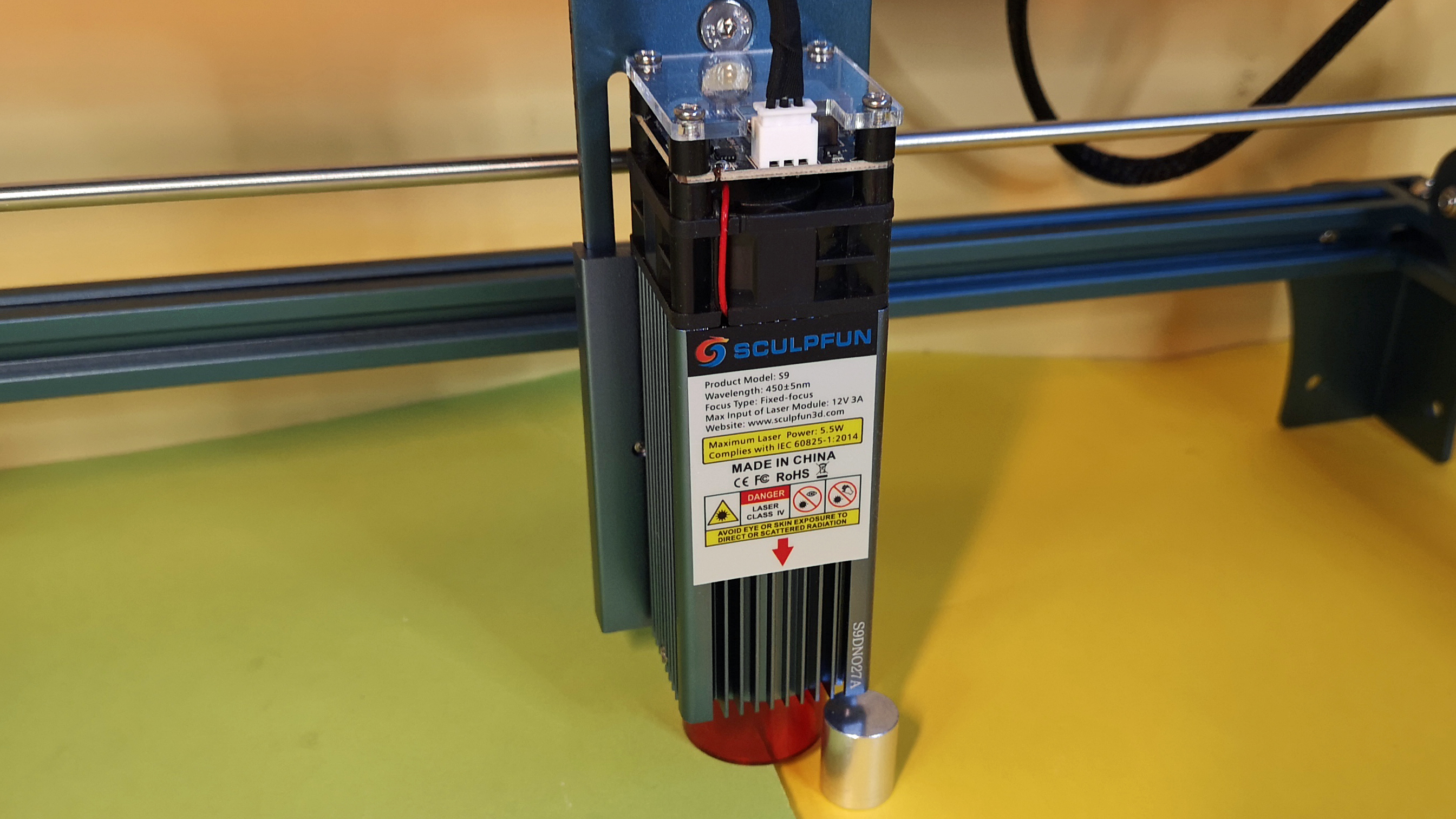 Der massive Metallrahmen des S9 ist gleichzeitig die y-Achse, auf der sich die x-Achse vor- und zurückbewegt. Der Laser-Kopf sitzt auf der x-Achse und vollführt auf dieser die Seitwärtsbewegungen. Da es sich um ein Lasermodul mit festem Fokus handelt, muss der Abstand zum Werkstück angepasst werden, um das volle Potenzial des Lasers auszuschöpfen. Das funktioniert mittels zweier Schrauben auf der Rückseite des Laserkopfs. Sind diese gelöst, wird das Lasermodul entlang der z-Achse auf und ab bewegt. Für den perfekten Abstand legt der Hersteller einen kleinen Abstandshalter aus Metall bei. Das Fokussieren funktioniert beim S9 ohne Werkzeug. Ganz so bequem wie beim Totem S mit nur einer Stellschraube ist die Lösung allerdings nicht. Trotzdem, diese Methode ist ein guter Mittelweg aus Komfort und Zuverlässigkeit.