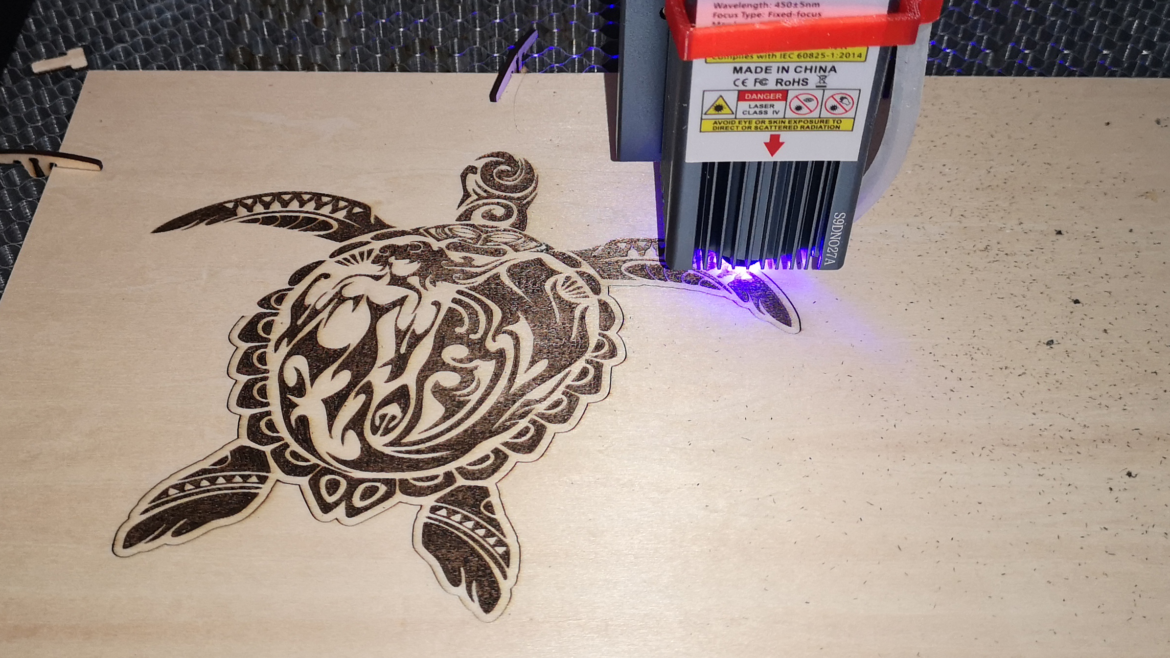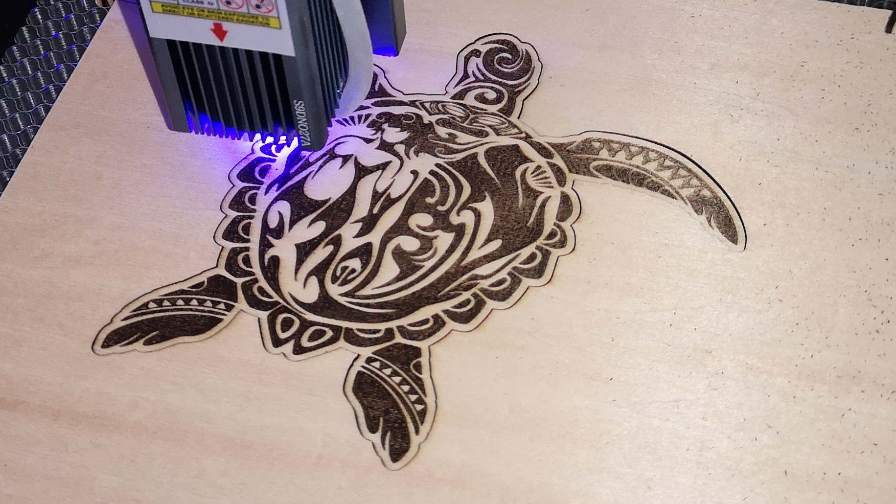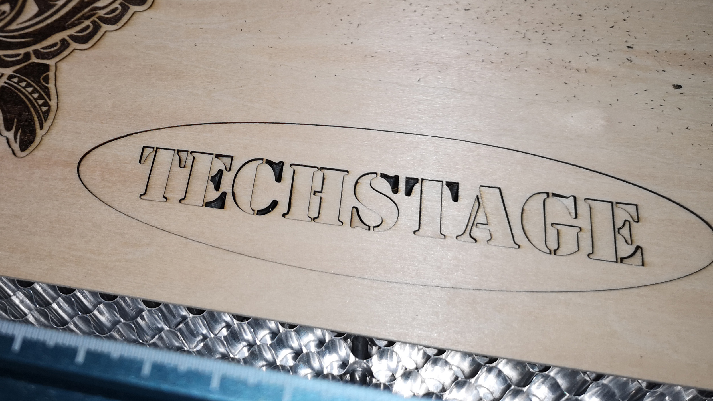 Der S9 ist für erfahrene Anwender aus dem 3D-Druckbereich und für Nutzer mit ausreichend technischem Grundverständnis sehr einfach zu bedienen. Schon die ersten Tests mit dem Totem S verlaufen äußerst zufriedenstellend. Das Gravieren von Holz, Leder und einer lackierten Fliese funktioniert einwandfrei. Die Tiefe der Gravur zeigt bereits hier, dass der S9 mehr Power als die bisher getesteten Desktop-Laser hat. Der 5,5-Watt-Laser macht, wenn er korrekt fokussiert ist, einen exzellenten Job. Umrisse und Details sind knackscharf und spürbar ins Holz eingebrannt.