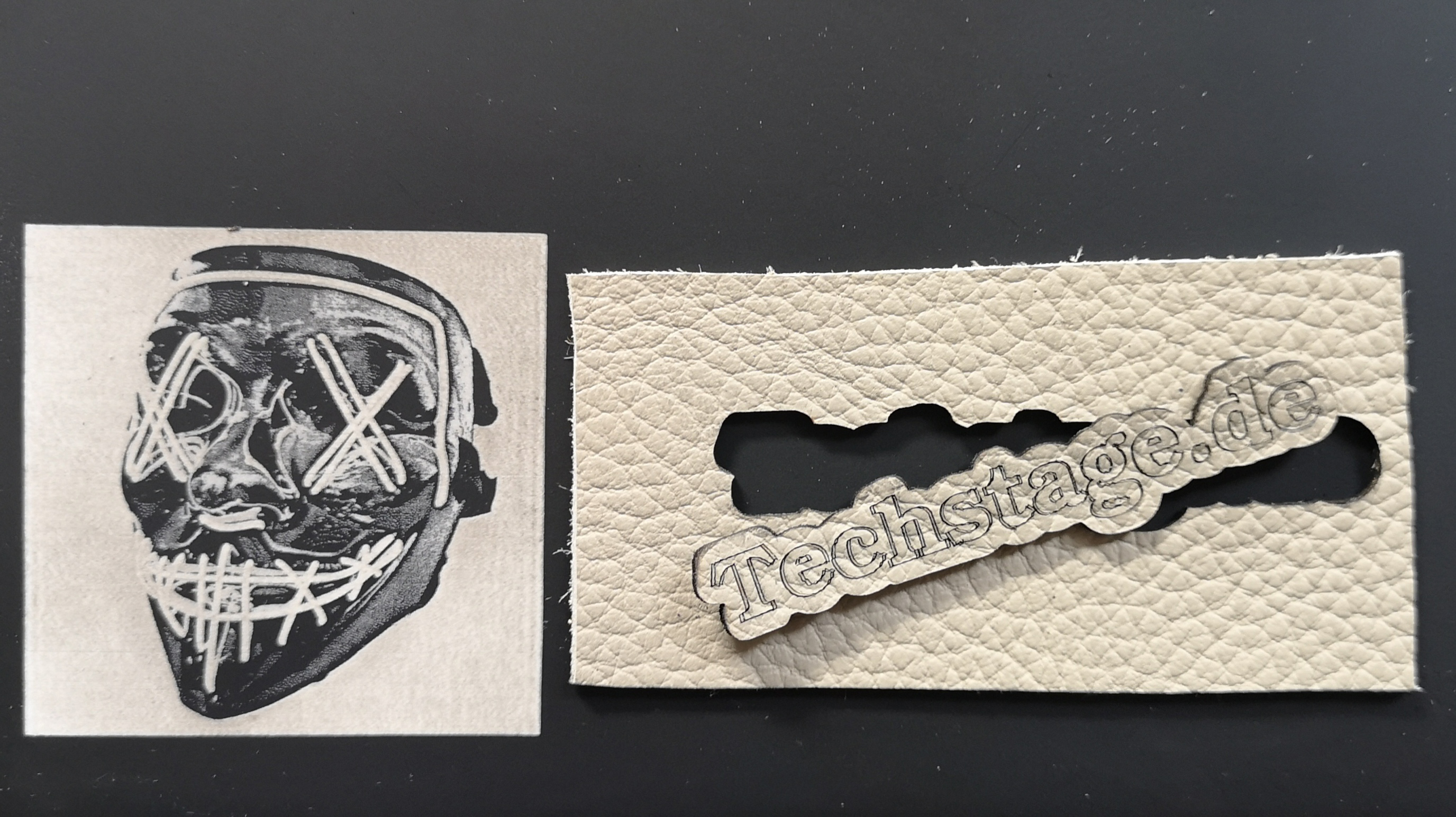 Schneiden und Gravieren von Leder funktioniert ebenfalls prima. Allerdings sind Rauch- und Geruchsentwicklung extrem unangenehm und so waren wir froh, eine aktive Lüftung in der Laser-Box zu haben. Wir haben zwar nur wenige Versuche mit Lederresten gemacht, aber insgesamt sehr ordentliche Ergebnisse erzielt. Hier ist allerdings deutlich weniger Power nötig als bei der Arbeit mit Holz oder Schiefer.