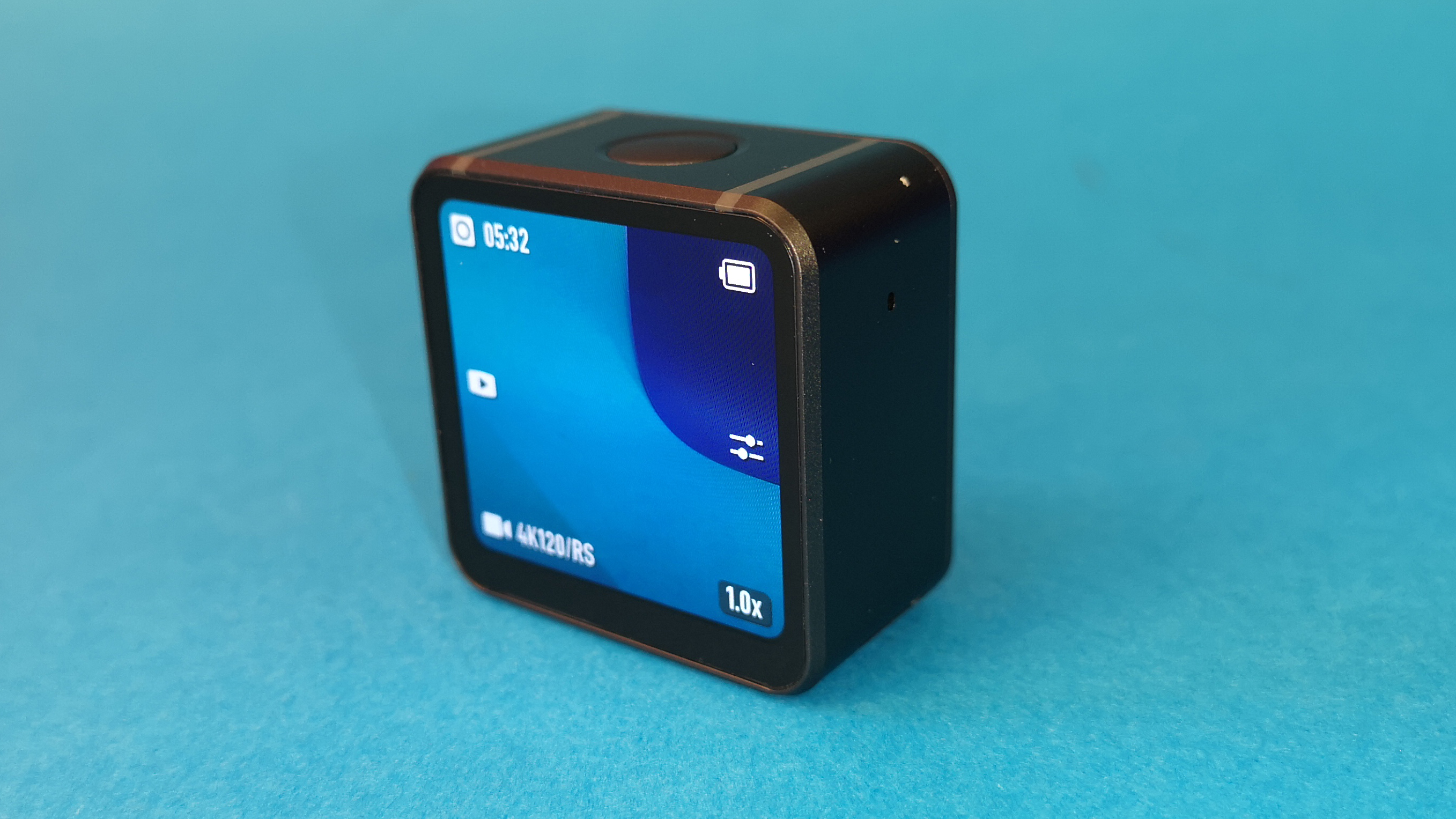 Die Action 2 steckt in einem würfelförmigen Metallgehäuse mit rückseitigem 1,76 Zoll Touchscreen und einem auf der Oberseite zentral platzierten Bedientaster. Der kleine Bildschirm ist dank einer Pixel-Dichte von 350 ppi knackscharf und selbst bei direkter Sonneneinstrahlung ausreichend hell. Trotz der geringen Größe klappt die Bedienung per Berührung erfreulich gut. Für die Aufnahmen kommt ein CMOS-Sensor mit 1/1,7 Zoll und einer maximalen Datenrate von 100 Mbit/s zum Einsatz. Fotos landen mit einer Auflösung von 12 Megapixel auf dem Speicher. Der FOV (Blickwinkel) beträgt 155 Grad.