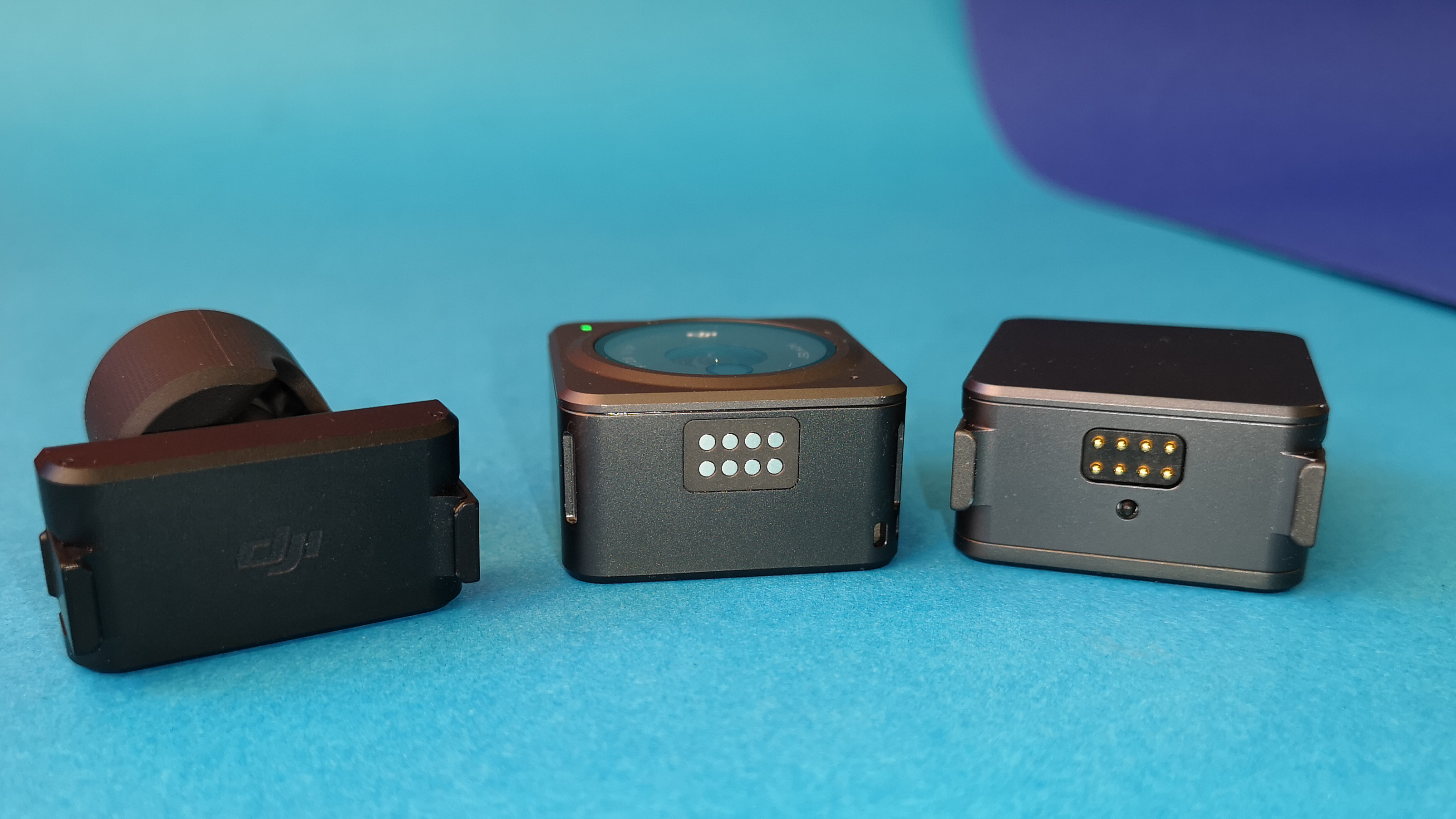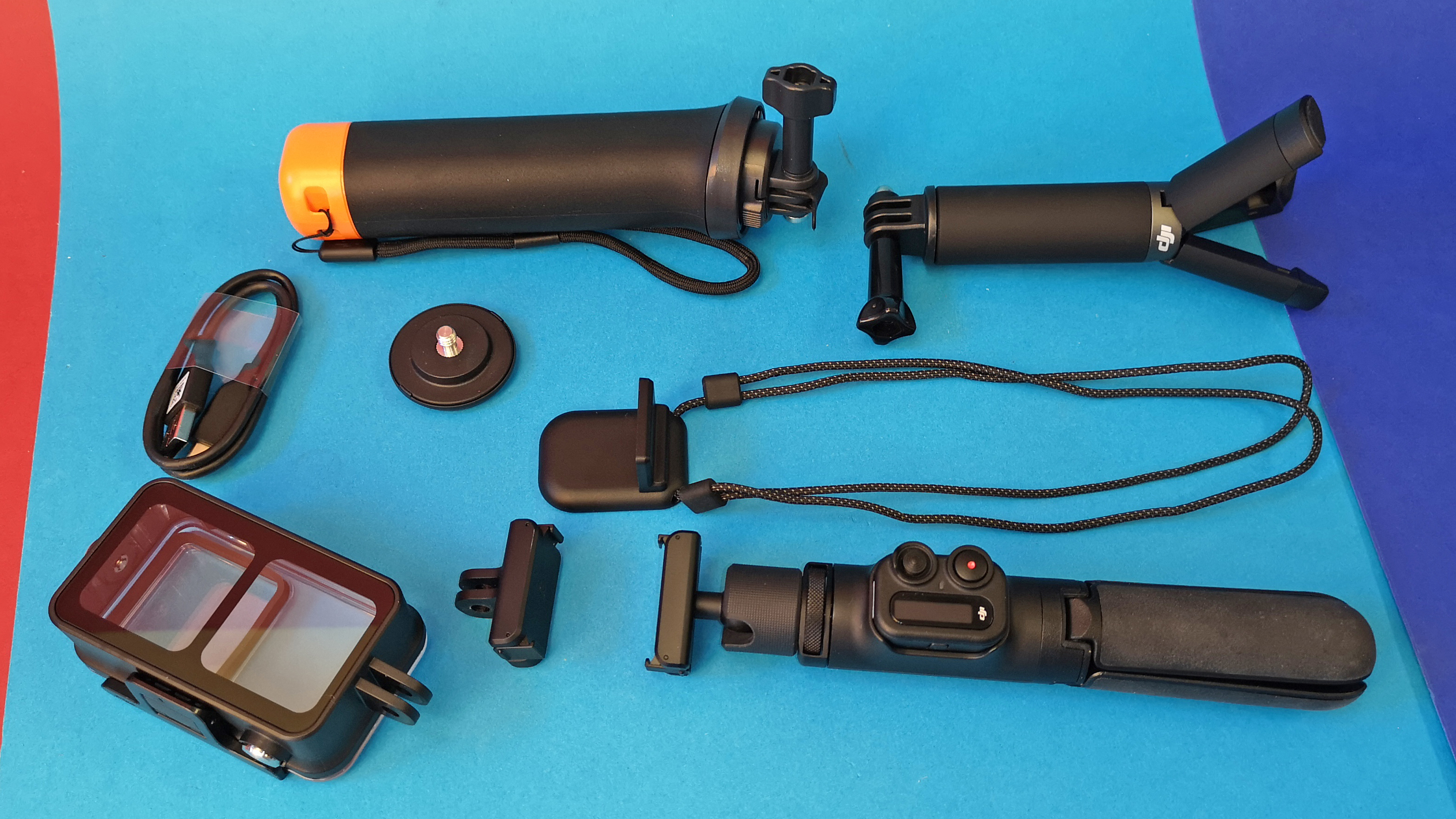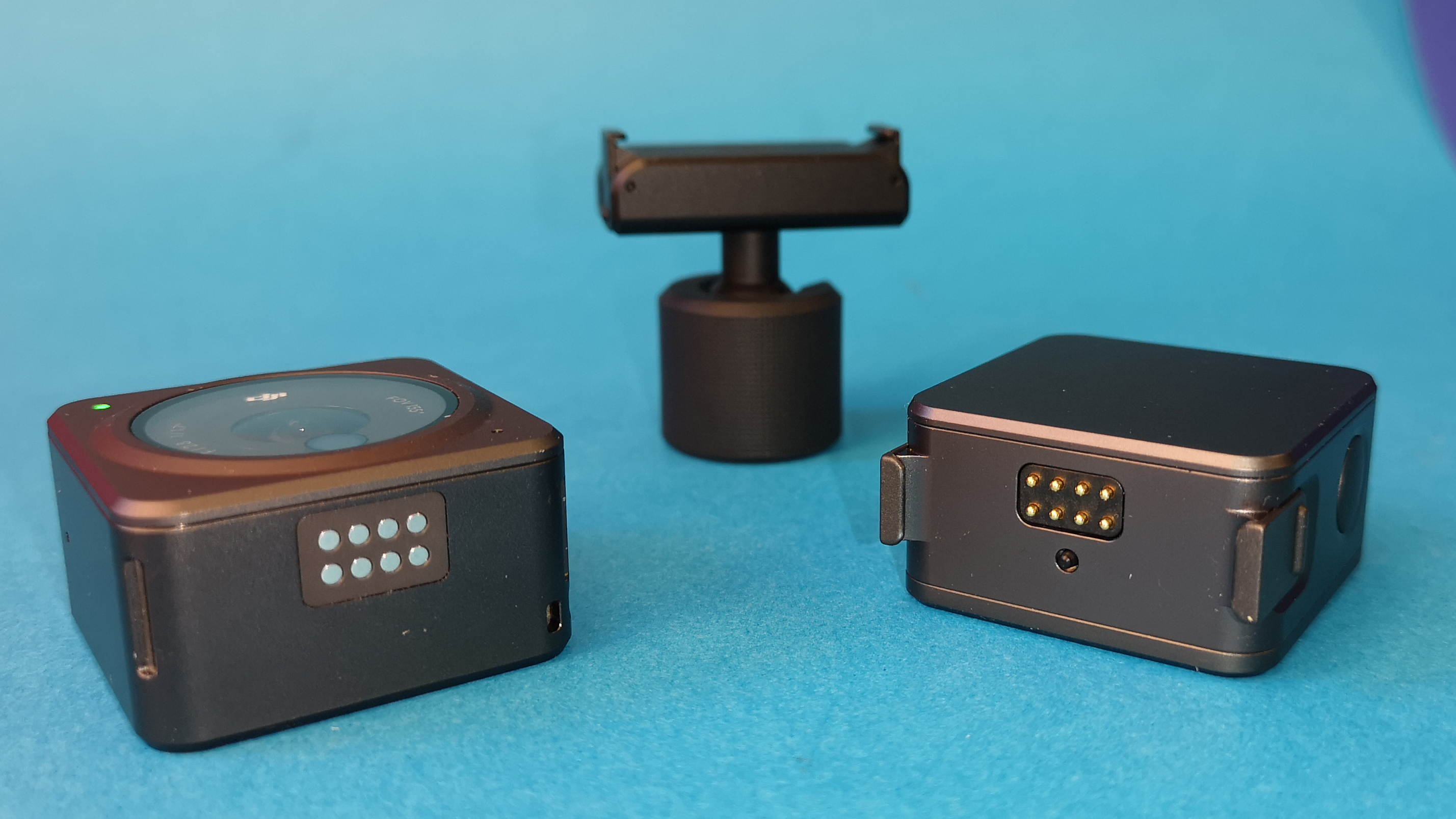 DJI bietet außerdem noch einiges an optionalem Zubehör. Dazu gehört etwa eine ebenfalls magnetische Makro-Linse für Aufnahmen in wenigen Zentimeter Entfernung. Auch eine Halterung, um die Action 2 um den Hals zu hängen, ist erhältlich. Eine ähnliche Lösung hat Insta360 für seine Go-Serie im Programm. Zusätzlich gibt es eine Befestigungsmöglichkeit mit dem Actioncam-Mount, eine magnetische Kopfhalterung, einen schwimmfähigen Handgriff, ein Ministativ und einen kleinen ausfahrbarer Selfiestick mit Fernbedienung. Diese arbeitet kabellos und verfügt über ein kleines Display. Für Fotos mit langer Belichtungszeit und Aufnahmen, bei denen man nicht direkt an die Kamera herankommt, ist die winzige Fernbedienung äußerst praktisch. Wer die Kamera beim Tauchen benutzen will, bekommt außerdem ein in bis zu 60 Meter Tiefe wasserdichtes Gehäuse, in welchem die Action 2 zusammen mit dem Akku-Modul Platz findet. Außerdem soll es zukünftig ein kabelloses Funkmikrofon geben.