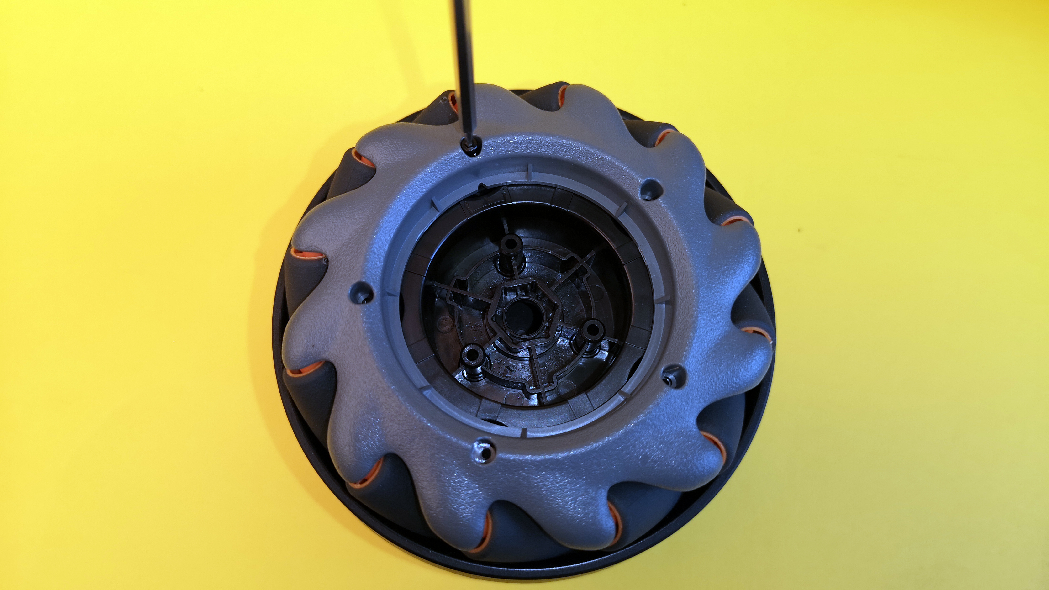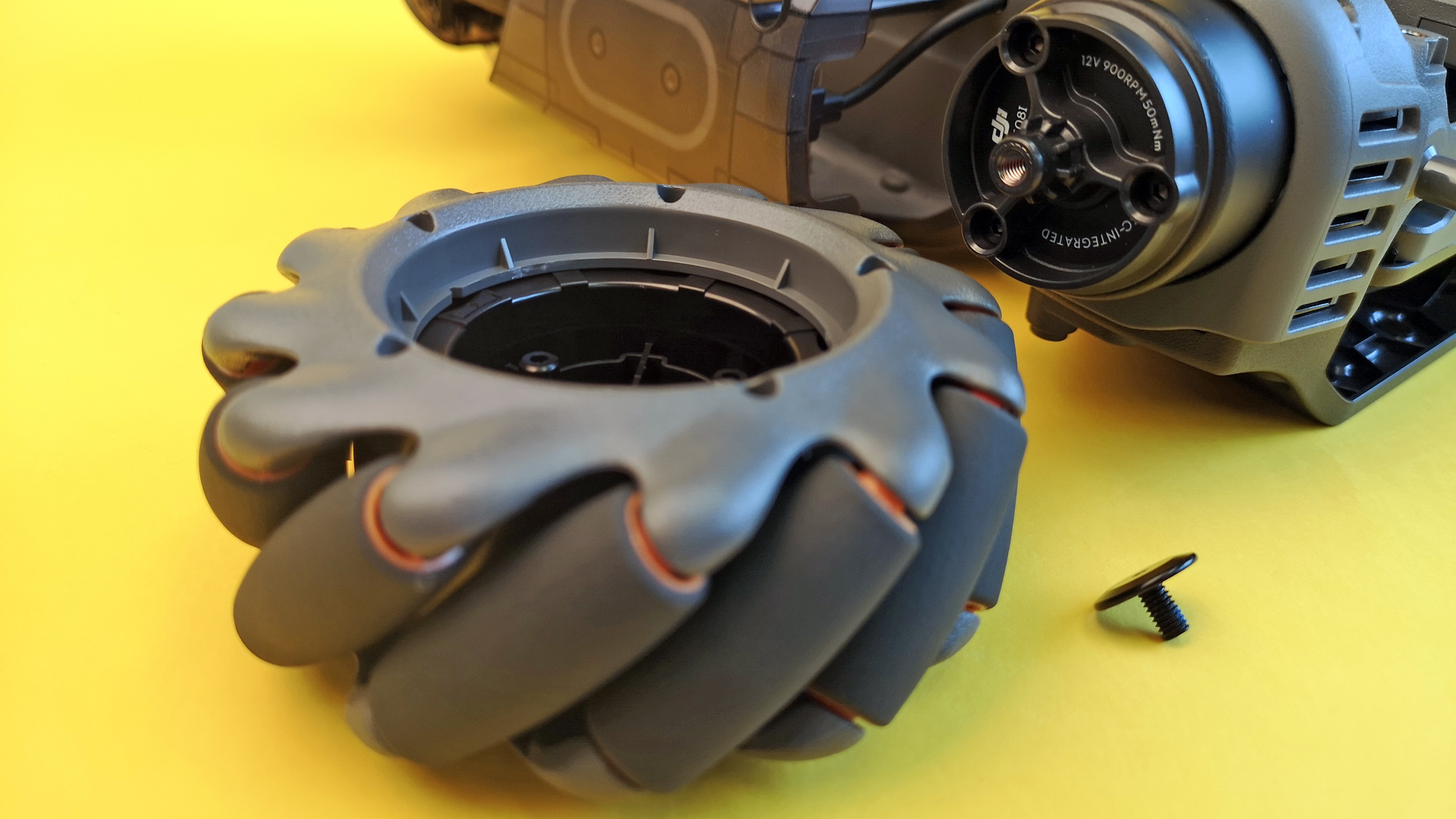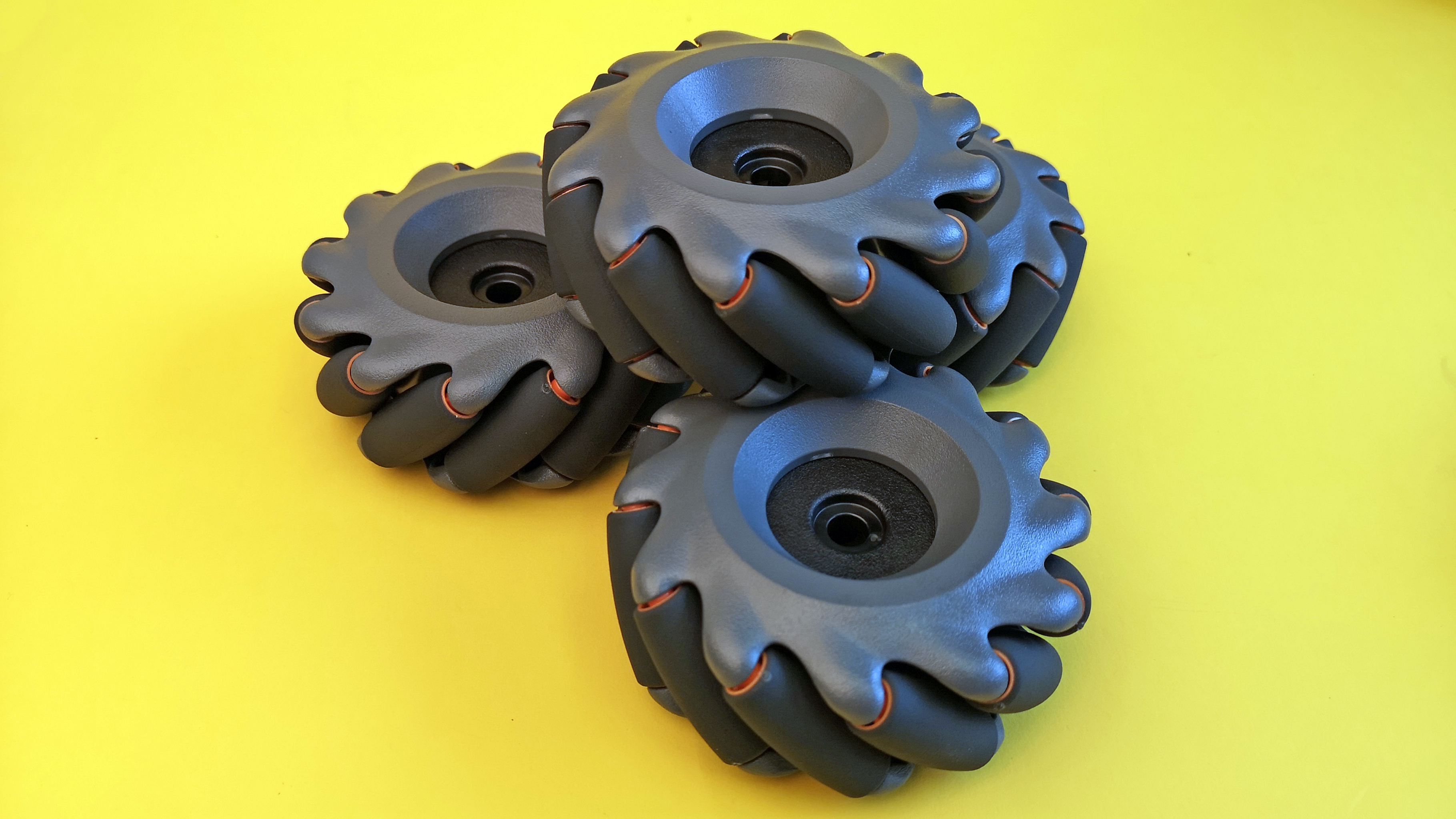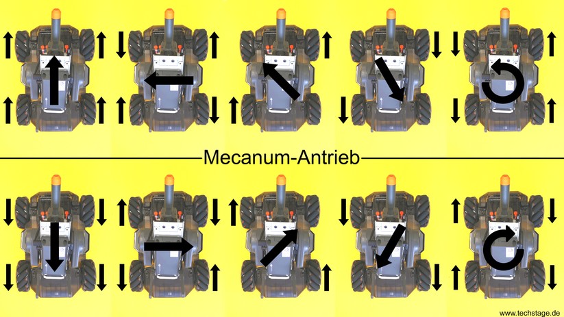 Statt normaler Räder kommt ein sogenannter Mecanum-Antrieb zum Einsatz. Dieser besteht im Falle des S1 aus zwölf gelagerten Einzelrollen, die schräg zur Fahrtrichtung um den Motor angeordnet sind. Zwar sind die Fahreigenschaften ähnlich wie mit herkömmlichen Reifen, allerdings funktioniert diese Art von Antrieb auch ganz ohne bewegliche Lenkachse. Je nachdem, welches Rad in welche Richtung dreht, kann der S1 auf der Stelle drehen, seitwärts oder schräg fahren. Wie das genau funktioniert, zeigt folgende Grafik.