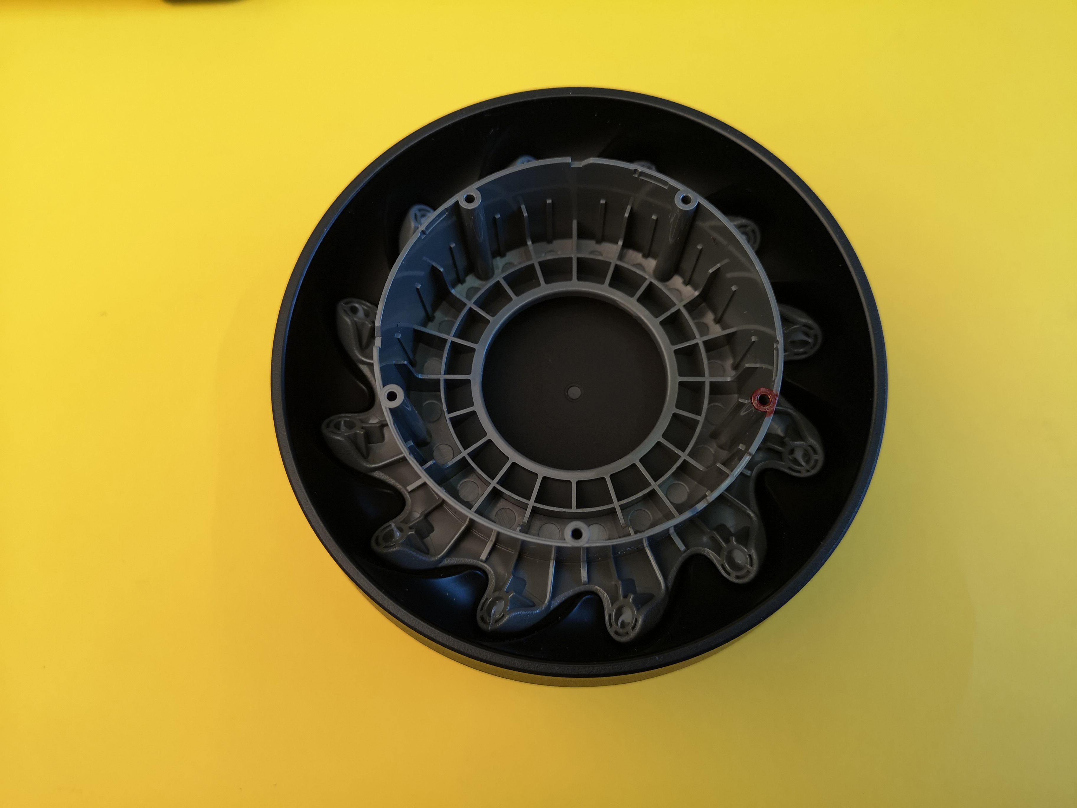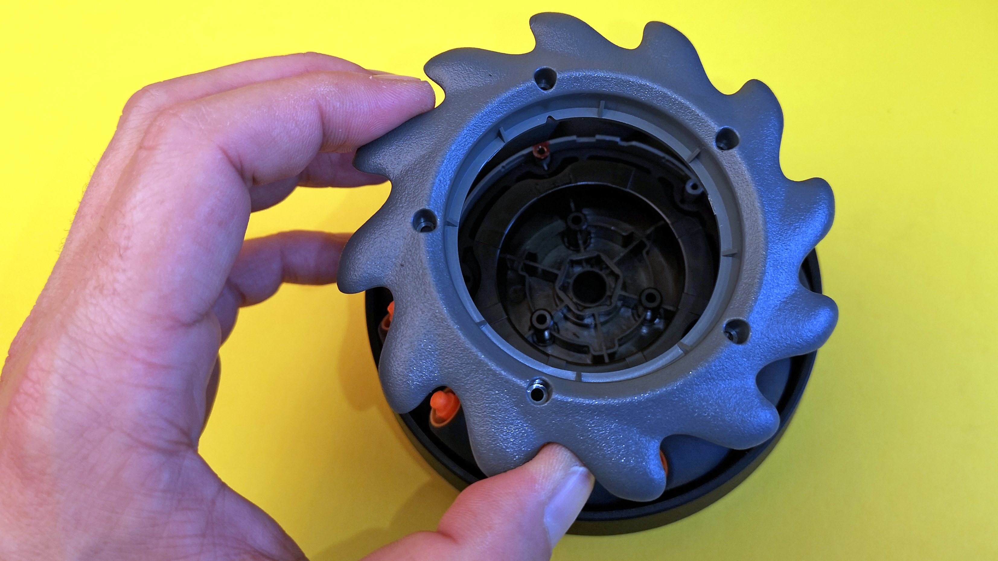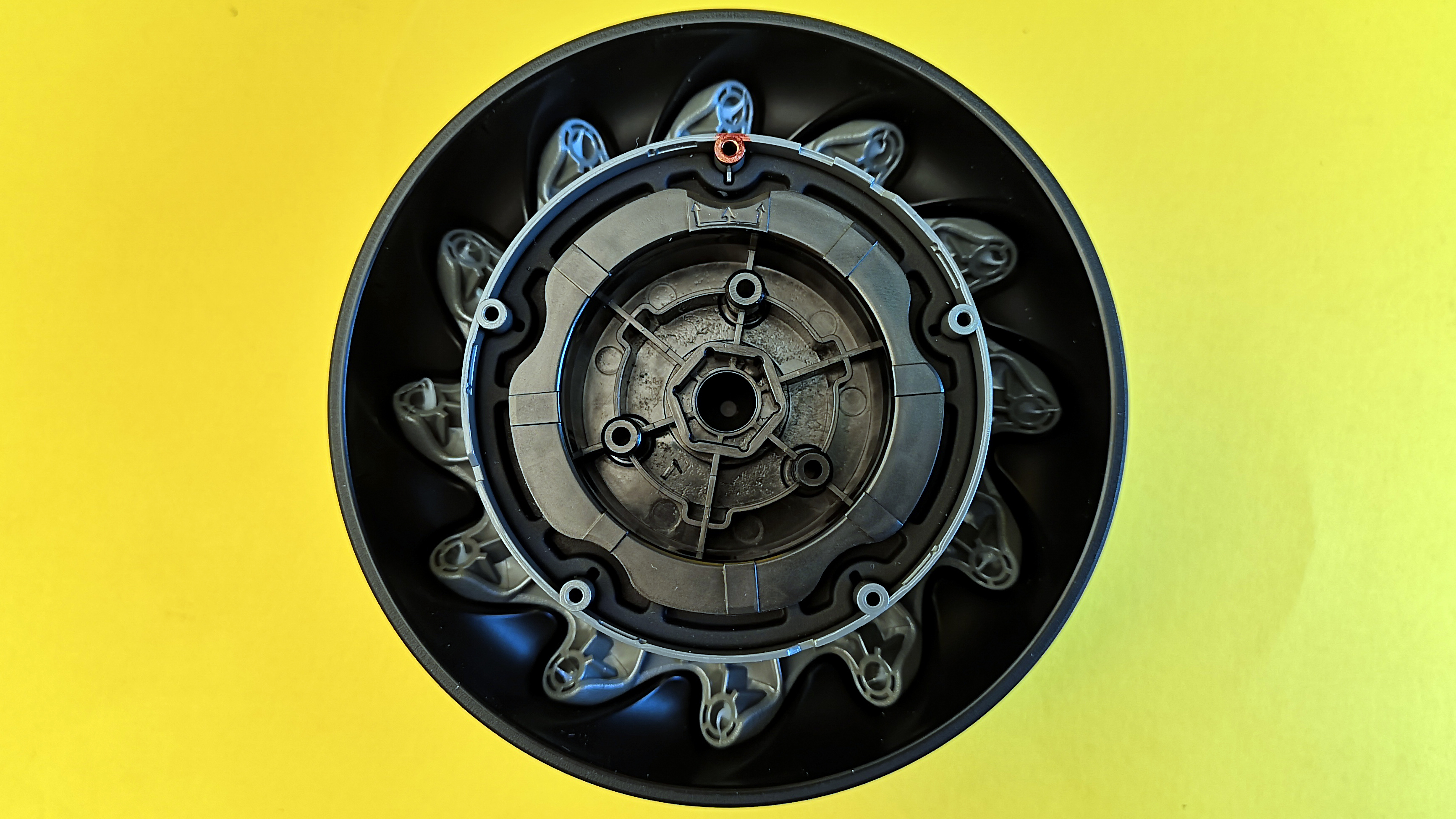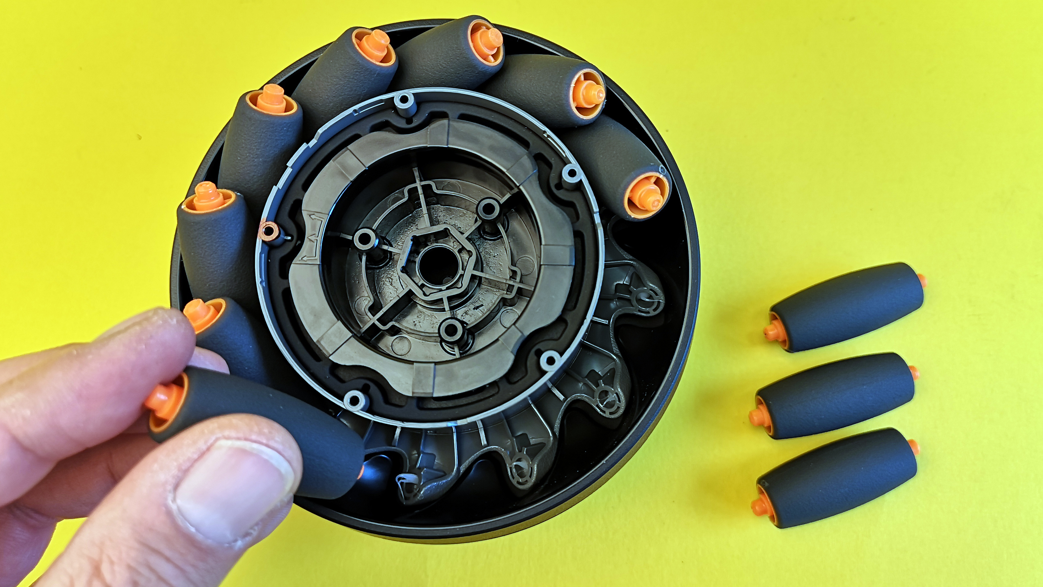 Statt normaler Räder kommt ein sogenannter Mecanum-Antrieb zum Einsatz. Dieser besteht im Falle des S1 aus zwölf gelagerten Einzelrollen, die schräg zur Fahrtrichtung um den Motor angeordnet sind. Zwar sind die Fahreigenschaften ähnlich wie mit herkömmlichen Reifen, allerdings funktioniert diese Art von Antrieb auch ganz ohne bewegliche Lenkachse. Je nachdem, welches Rad in welche Richtung dreht, kann der S1 auf der Stelle drehen, seitwärts oder schräg fahren. Wie das genau funktioniert, zeigt folgende Grafik.