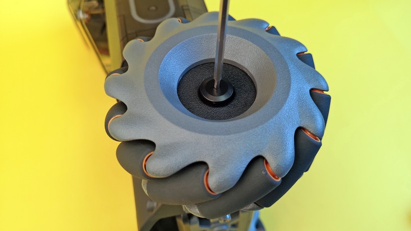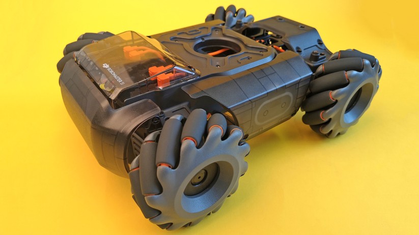 Die Bedienung ist denkbar einfach. Die linke Hand ist für die Steuerung des Roboters zuständig; die rechte für den Kameraturm. Drücken wir den Stick nach oben, fährt der S1 vorwärts. Ziehen wir den Stick nach unten, legt der Robomaster den Rückwärtsgang ein. Nun kommt der Mecanum-Antrieb ins Spiel. Wird der Stick nach links oder rechts gedrückt, fährt der Roboter nicht eine Kurve, sondern direkt seitlich. Wer eine Kurve fahren will, muss nach vorne fahren und sich gleichzeitig mit der rechten Hand nach links oder rechts steuern. Das klingt komplizierter, als es in der Praxis ist, denn in den Standardeinstellungen dreht sich das Fahrgestell automatisch mit dem Turm mit. Wer möchte, kann Turm und Unterteil auch getrennt ansteuern. Nach wenigen Minuten hat man sich an die Steuerung gewöhnt. Dann lässt sich der S1 sehr präzise durch die Gegend manövrieren.