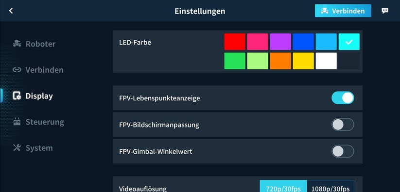 Um sich beim Steuern bequem orientieren zu können, bekommt der Pilot ein Livebild aus Sicht des S1 auf sein Smartphone oder Tablet gestreamt. Dazu setzt DJI auf eine Kamera mit 1080p-Auflösung und einem Sichtfeld von 120 Grad; die Übertragung des Livebilds und der Steuerdaten erfolgt über WLAN. Das Livebild hat in der Standardeinstellung eine Auflösung von 720p; damit läuft die Übertragung deutlich flüssiger als mit Full-HD. Wer möchte, kann das Geschehen auch direkt im Robomaster auf eine Micro-SD-Karte aufzeichnen.