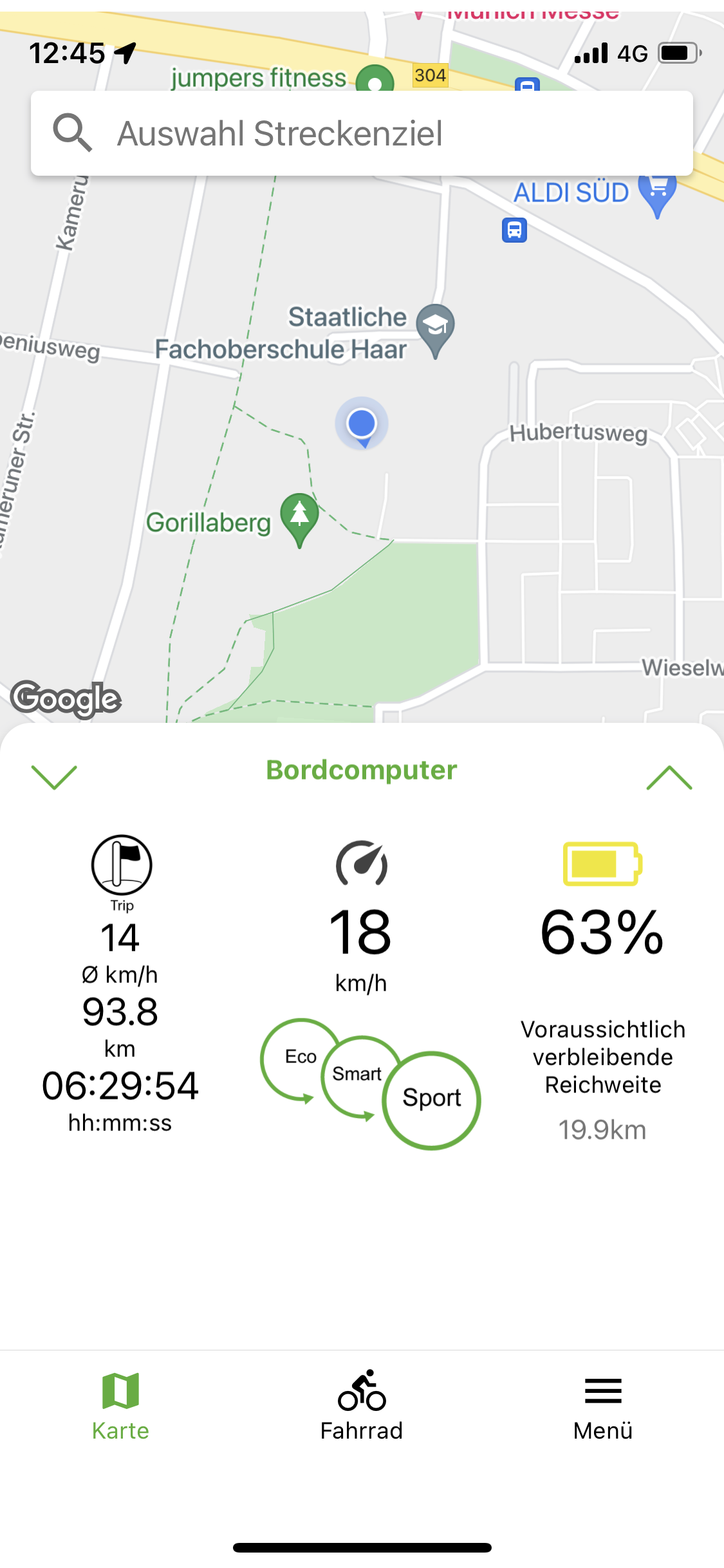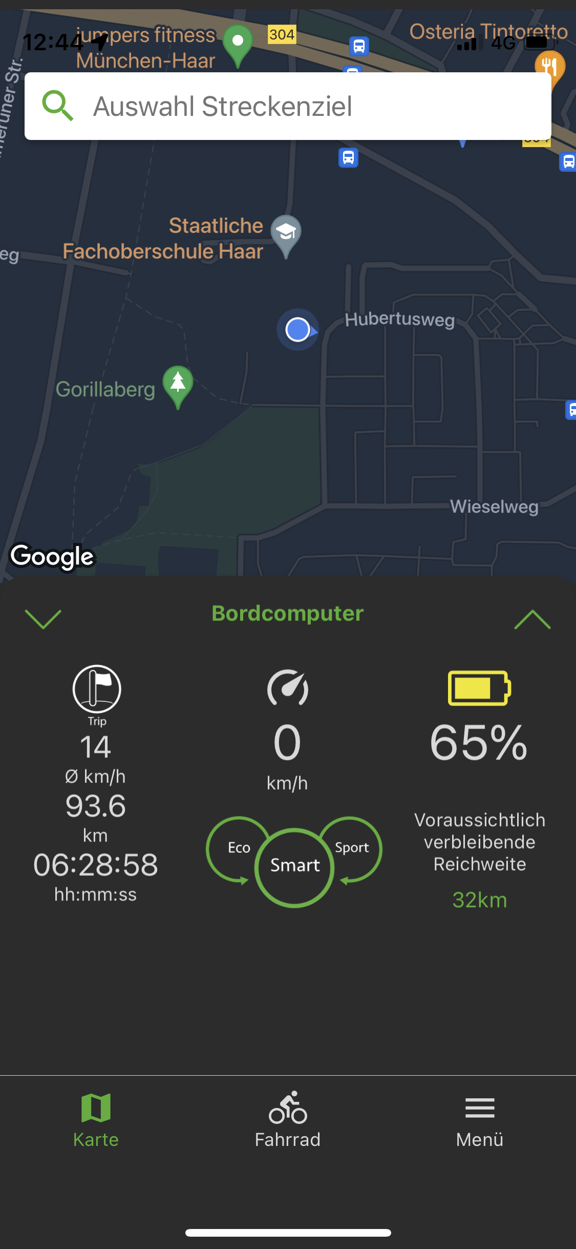 Genauere Informationen zu Akkustand und die aktuelle Geschwindigkeit zeigt die Pendix-App. Ein USB-C-Ausgang am Akku lädt auf Wunsch das Smartphone; natürlich zu Lasten des E-Bike-Ladestands. Zudem kennt die App individuelle Fahrprofile. Hier konfiguriert man etwa die Trittunterstützung oder die maximal zulässige Geschwindigkeit bis 25 Kilometer pro Stunde. Darüber bietet die App integrierte Navigation mit Google Maps; das ist sehr praktisch. Merkwürdig: Man kann über die App einstellen, dass diese sich automatisch per Bluetooth verbindet. In der Praxis funktioniert das aber leider nicht zuverlässig.