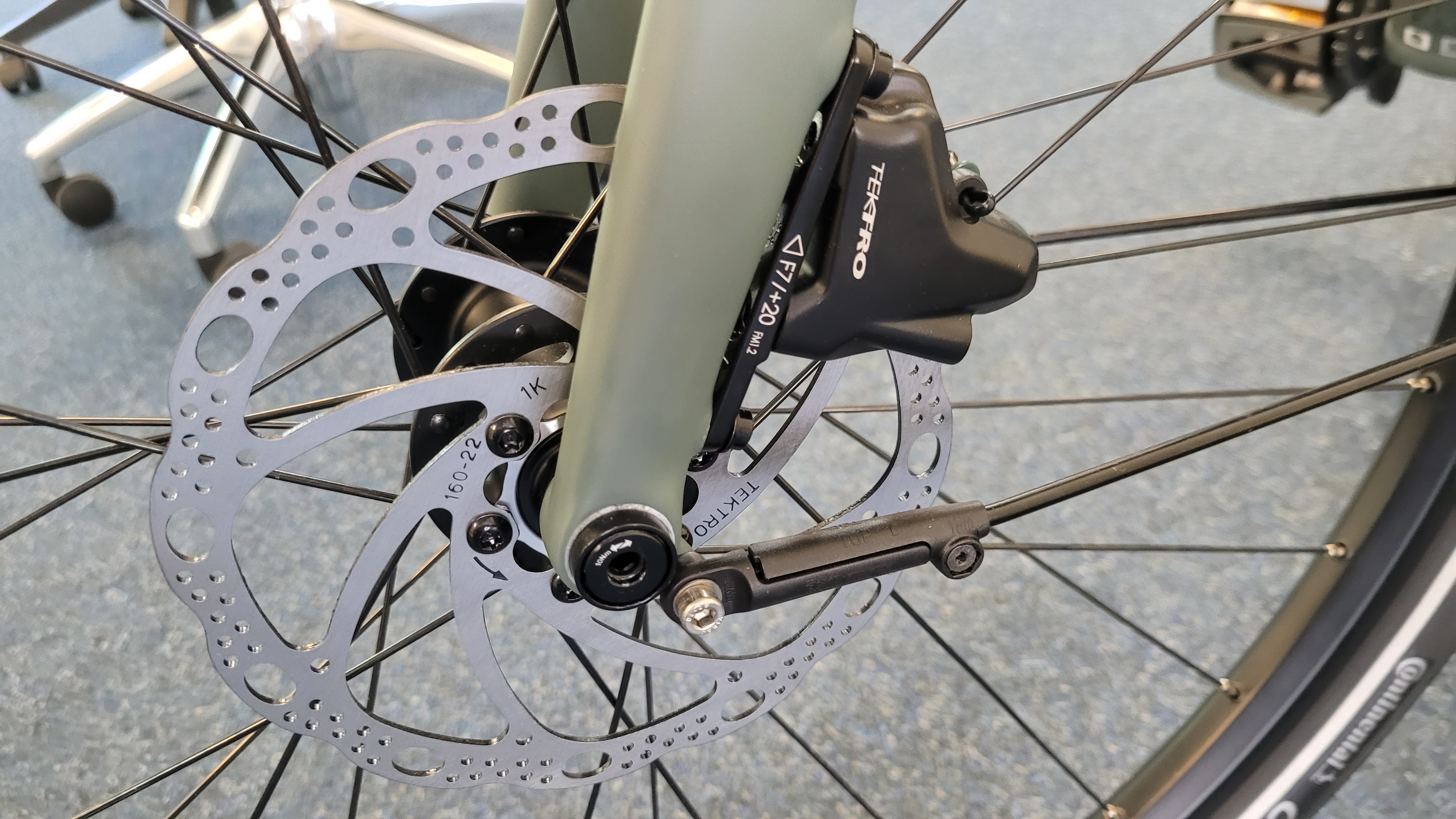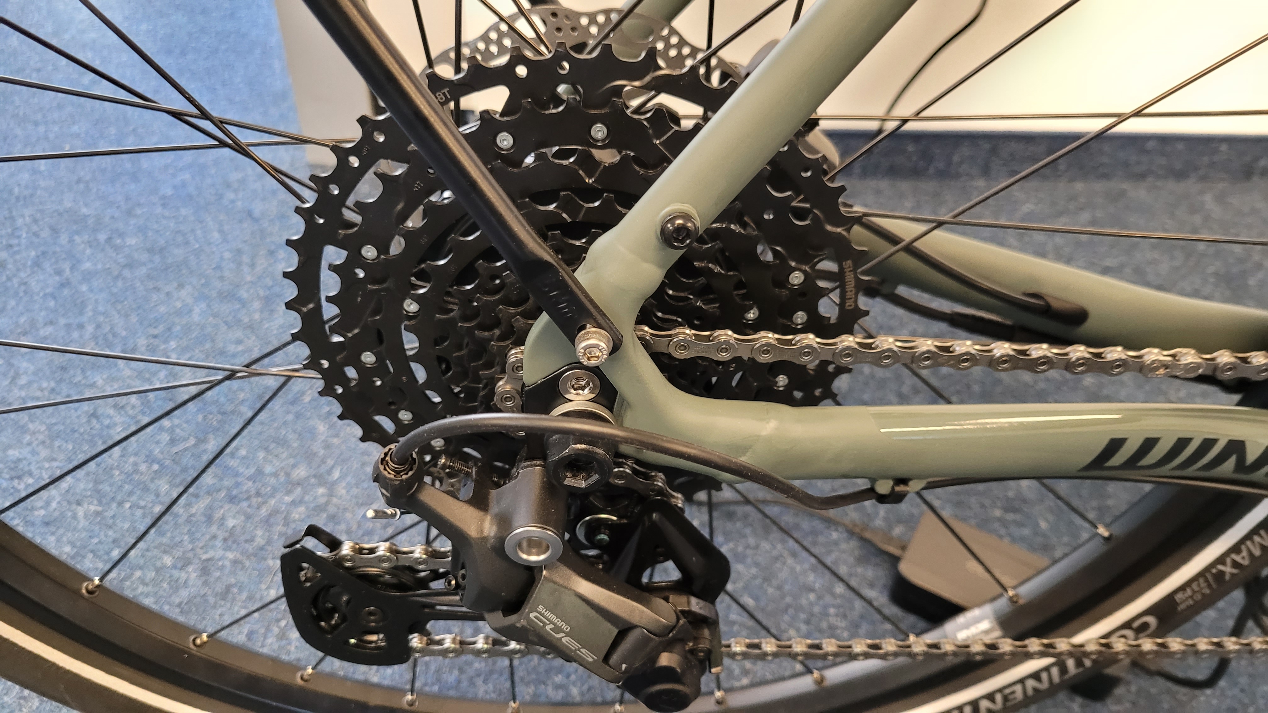 Die Verarbeitung hinterlässt einen hochwertigen Eindruck. Sämtliche Schweißnähte sind geschliffen und die Kabel der 10-Gang-Schaltung Shimano Deore sowie für die hydraulischen Scheibenbremsen (160 mm) von Tektro verschwinden größtenteils bereits in der oberen Gabel, die aus Carbon gefertigt ist. Lediglich den Zug der Vorderbremse sieht man etwas länger, bevor er im unteren Bereich auf der linken Seite in die Gabel führt.
