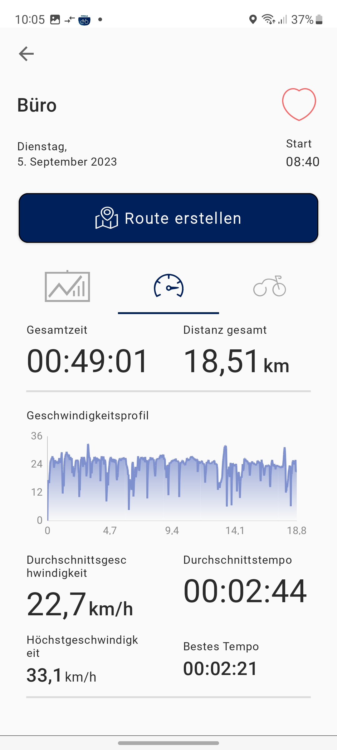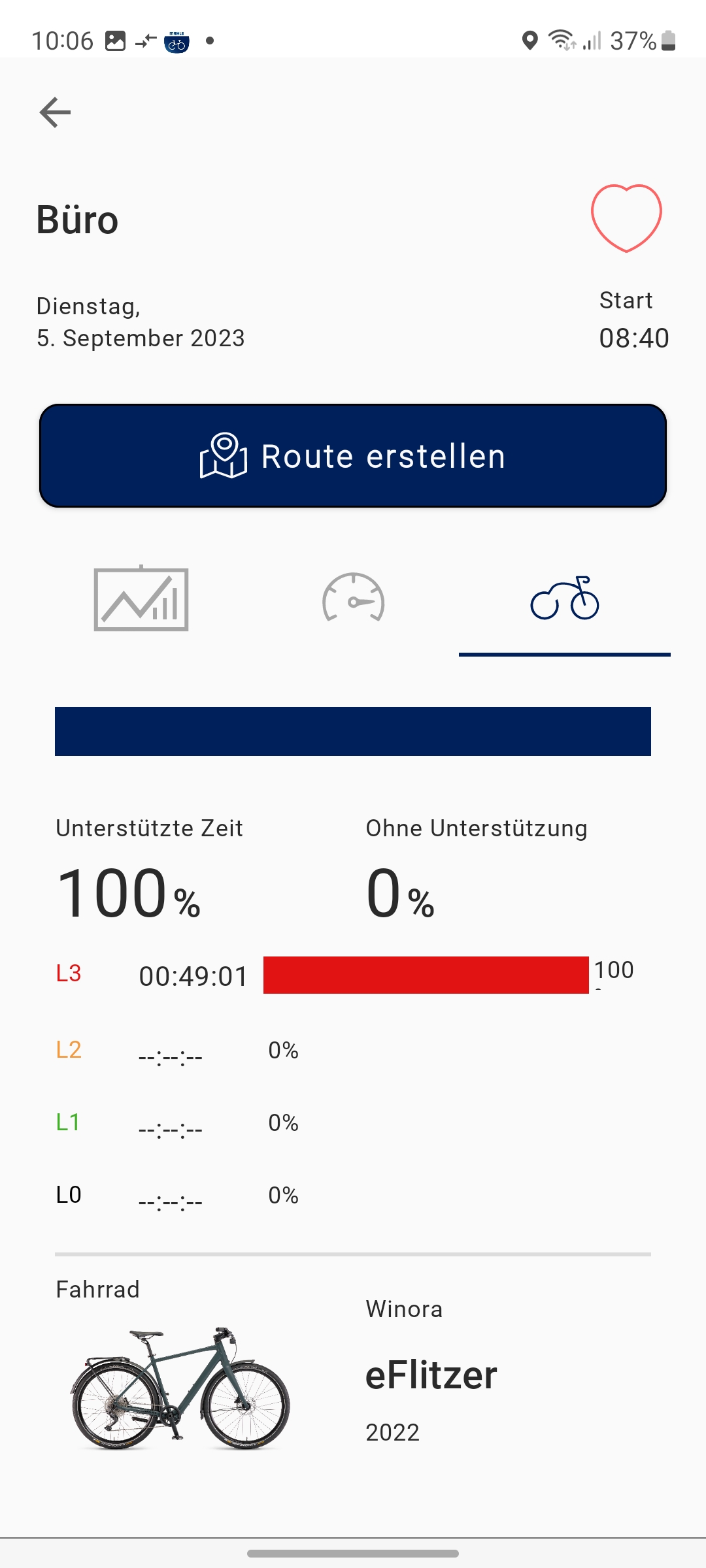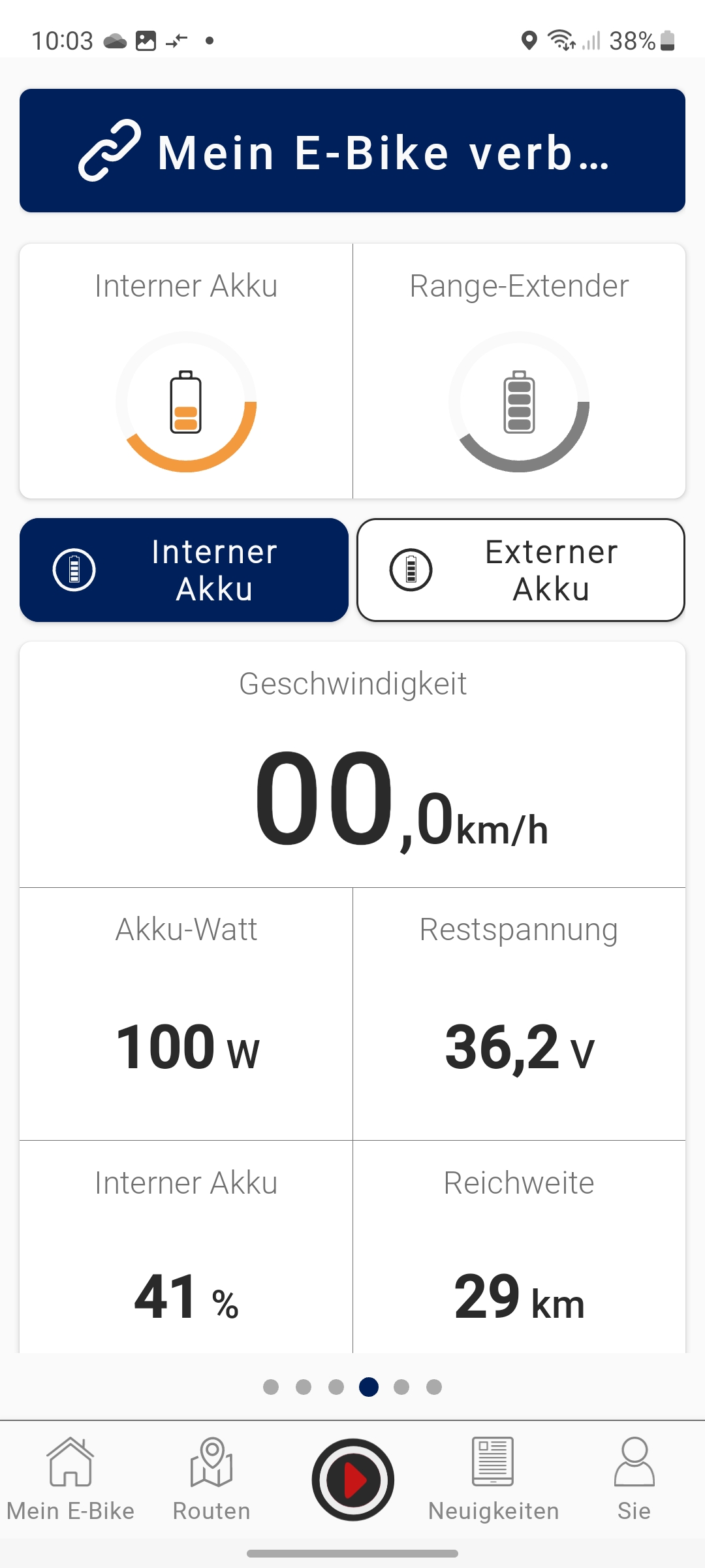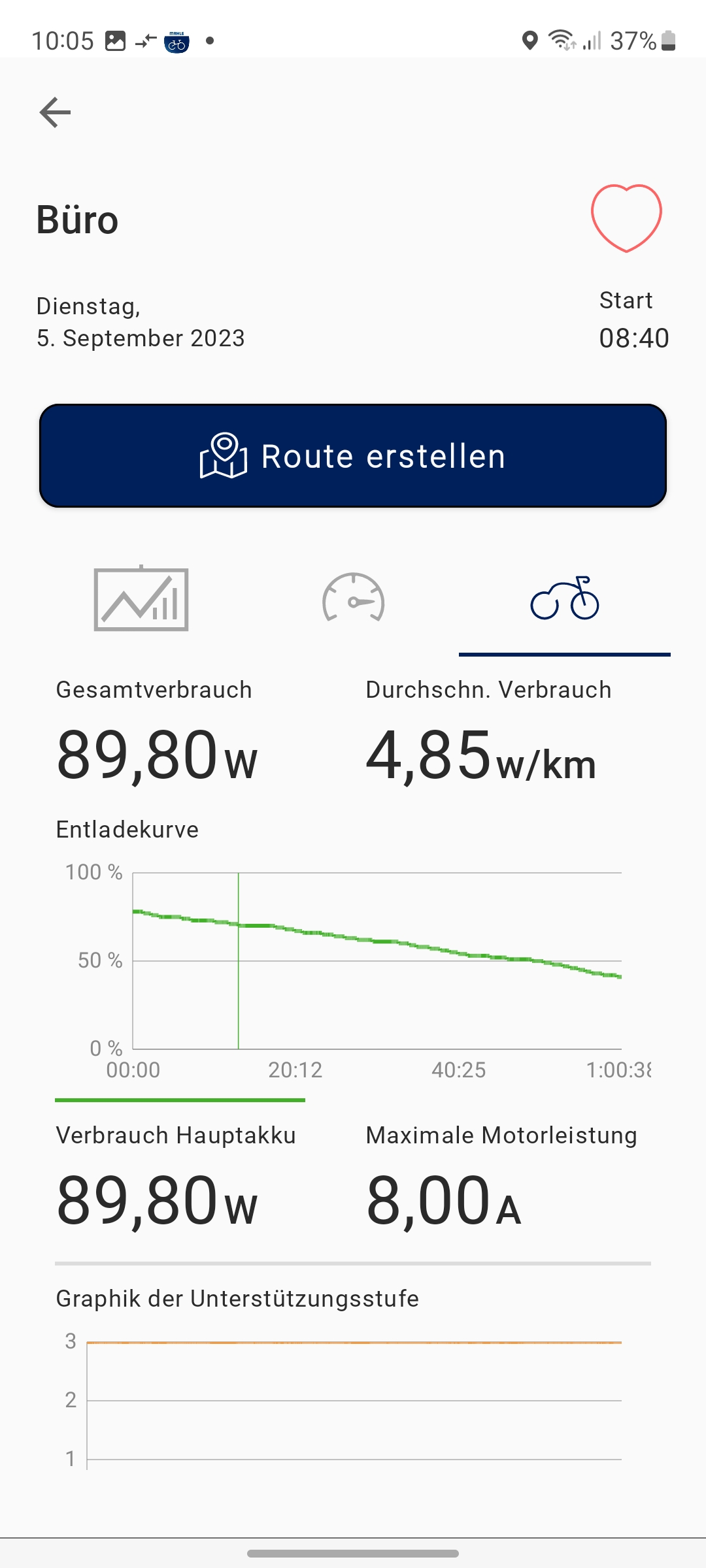 Angaben zur gefahrenen Wegstrecke oder der aktuellen Geschwindigkeit können Anwender nur über die Mahle-App My Smartbike abrufen. Dafür muss man sich allerdings mit einer E-Mail registrieren. Für die Aufzeichnung der pro Tour gefahrenen Kilometer muss man allerdings vor jeder Fahrt das Smartphone mit dem Fahrradcomputer über Bluetooth koppeln und anschließend in der App auf den roten Aufzeichnungsbutton zum Start einer Tour drücken. Die Wegstrecke pro Trip wird also nicht vom Fahrradcomputer aufgezeichnet, sondern vom Smartphone.