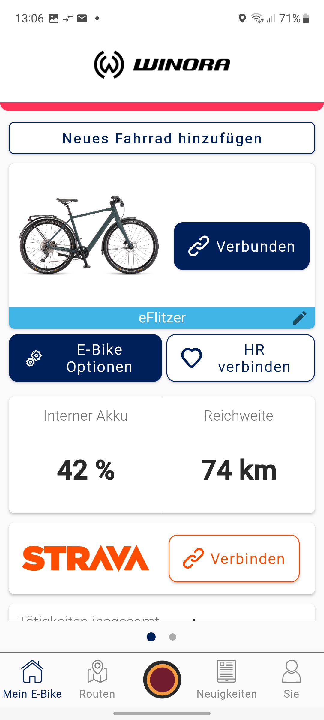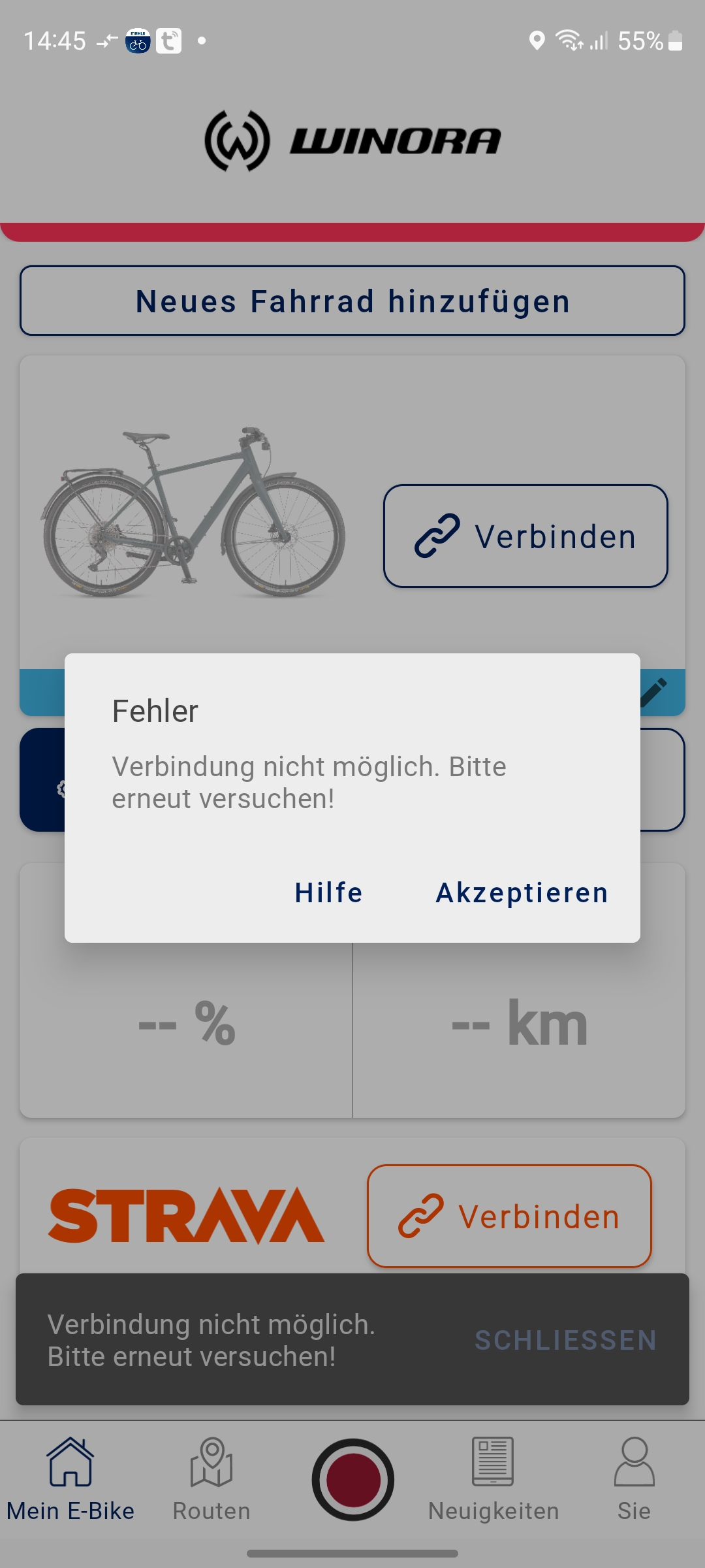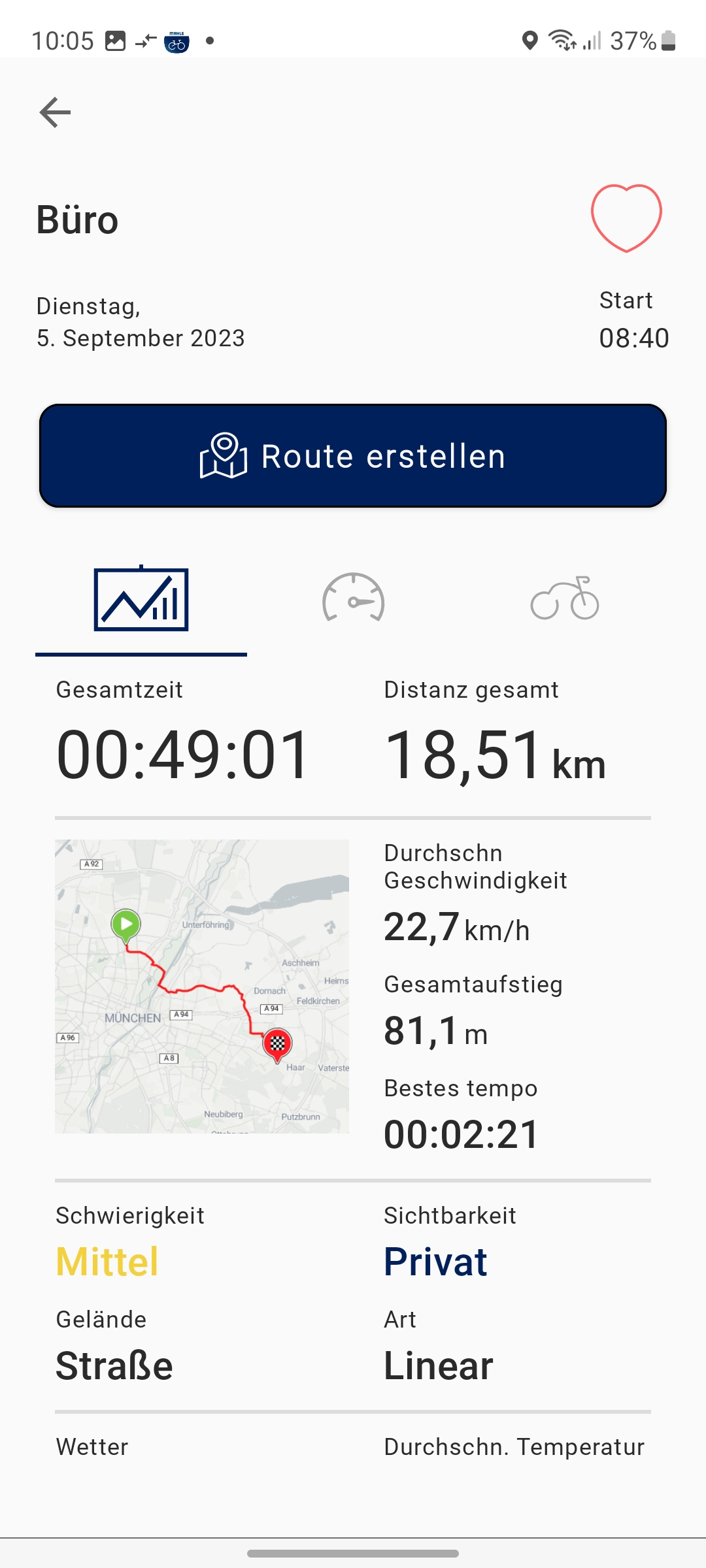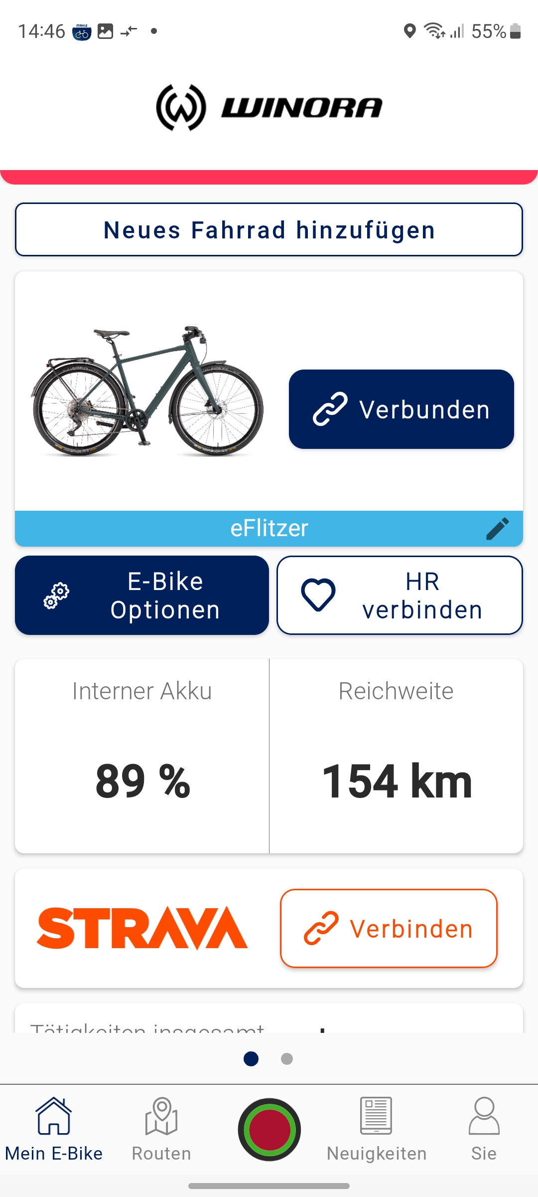 Angaben zur gefahrenen Wegstrecke oder der aktuellen Geschwindigkeit können Anwender nur über die Mahle-App My Smartbike abrufen. Dafür muss man sich allerdings mit einer E-Mail registrieren. Für die Aufzeichnung der pro Tour gefahrenen Kilometer muss man allerdings vor jeder Fahrt das Smartphone mit dem Fahrradcomputer über Bluetooth koppeln und anschließend in der App auf den roten Aufzeichnungsbutton zum Start einer Tour drücken. Die Wegstrecke pro Trip wird also nicht vom Fahrradcomputer aufgezeichnet, sondern vom Smartphone.