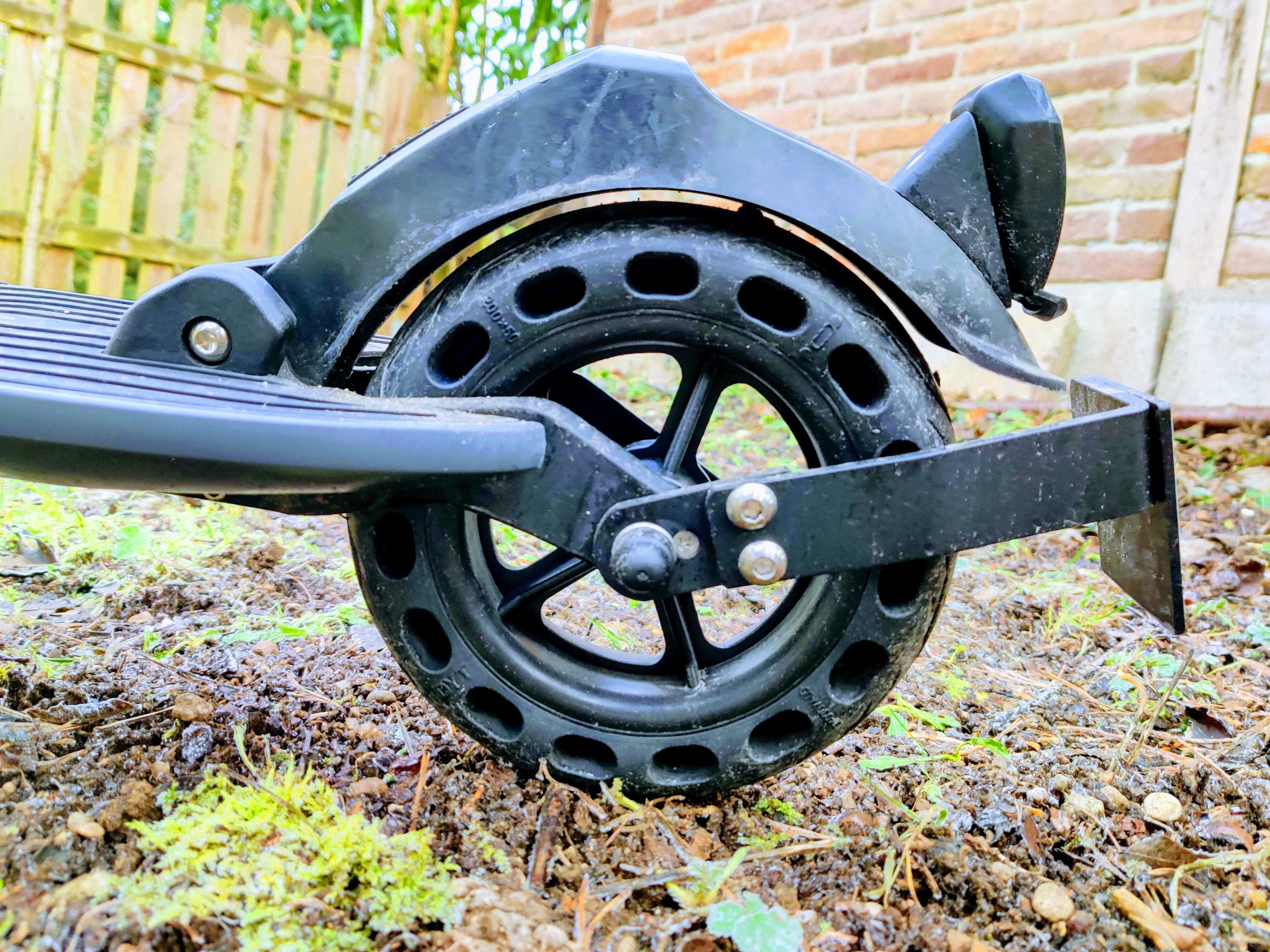 Das Trittbrett ist mit einer Länge von 41 Zentimetern zwar nicht außergewöhnlich kurz, trotzdem fühlt es sich beim Fahren so an. Das liegt daran, dass die Lenkstange direkt am vorderen Ende des Trittbretts leicht zum Fahrer geneigt nach oben ragt, was beim Fahren einschränkt. Man hat gerade im Vergleich mit anderen E-Scootern stets das Gefühl, dass der Lenker nicht nur besonders tief, sondern auch besonders nah ist. Zumindest ist das Trittbrett mit 9 Zentimetern weit genug vom Boden entfernt, um nicht versehentlich bei kleinen Bordsteinkanten aufzusetzen. Gleichzeitig ist die Trittfläche des Bretts nur 13 Zentimeter hoch, so nah ist man dem Boden sonst bei keinem anderen von uns getesteten E-Scooter. Das erleichtert das Beschleunigen per Pedes, wenn zum Beispiel der Akku leer ist. Außergewöhnlich hoch ist die maximale Zuladung von 150 Kilogramm. Andere bieten her meist nicht mehr als 120 Kilogramm.