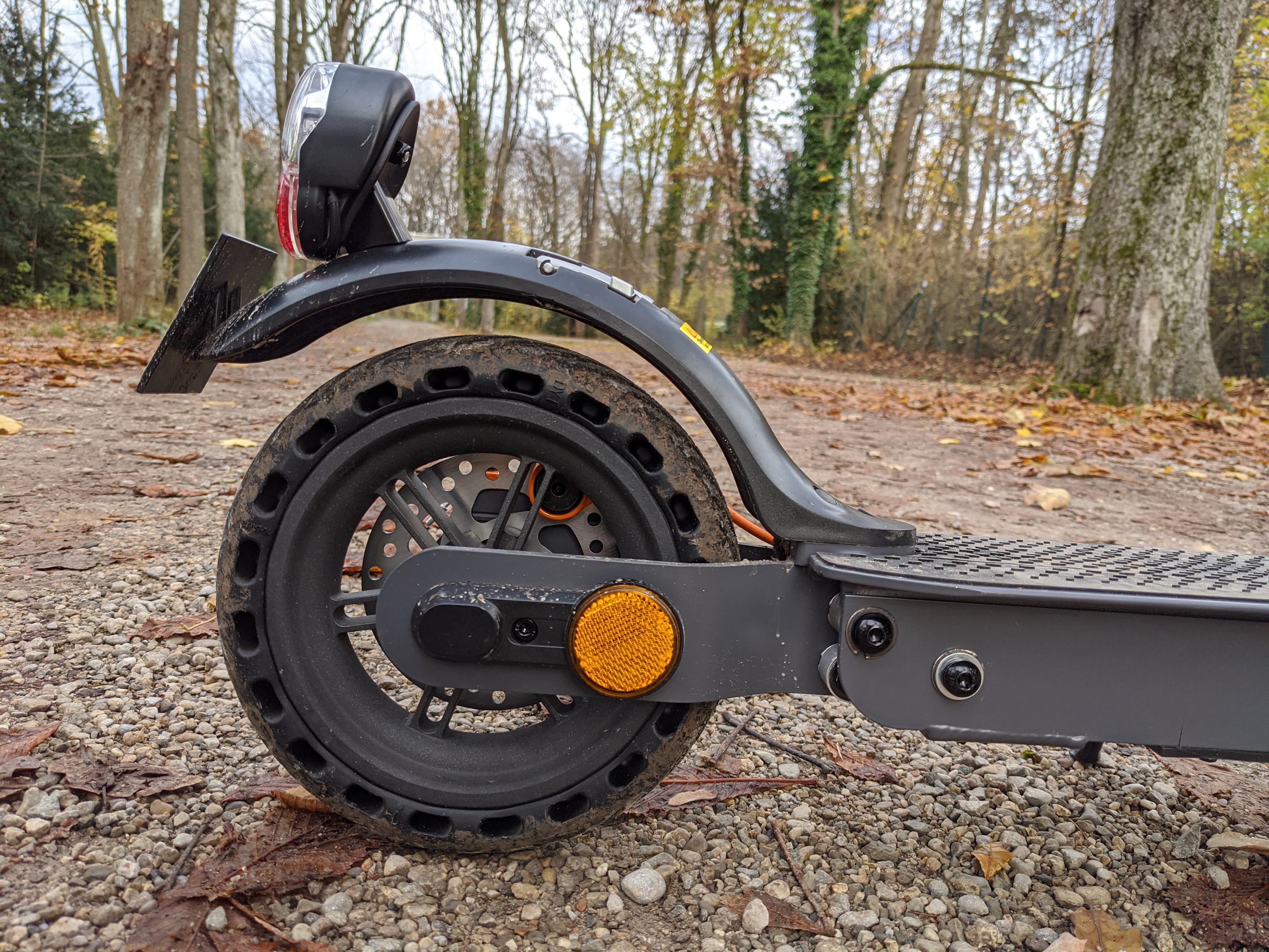 Der Trekstor EG31 hat keine normalen Luftreifen, sondern 8,5 Zoll (ca. 22 cm) große, sogenannte Honeycomb-Reifen. Diese federn durch ihre Wabenstruktur ein wenig und sollen besonders verschleißarm sein. Da sie keine Luft halten, müssen sie auch nicht aufgepumpt werden, sind damit stets einsatzbereit. Allerdings federn sich doch deutlich weniger weg als Luftreifen. Um das ein wenig auszugleichen, spendiert Trekstor dem EG31 eine Federung zwischen der Aufhängung des Hinterrads und dem ausreichend großen Trittbrett. Doch auch mit dieser Federung müssen sich Fahrer darauf gefasst machen, deutlich mehr durchgerüttelt zu werden als bei E-Scootern mit Luftreifen. Ein weiterer Nachteil der Honeycomb-Reifen: Sie greifen etwas schlechter, rutschen also tendenziell schneller weg.