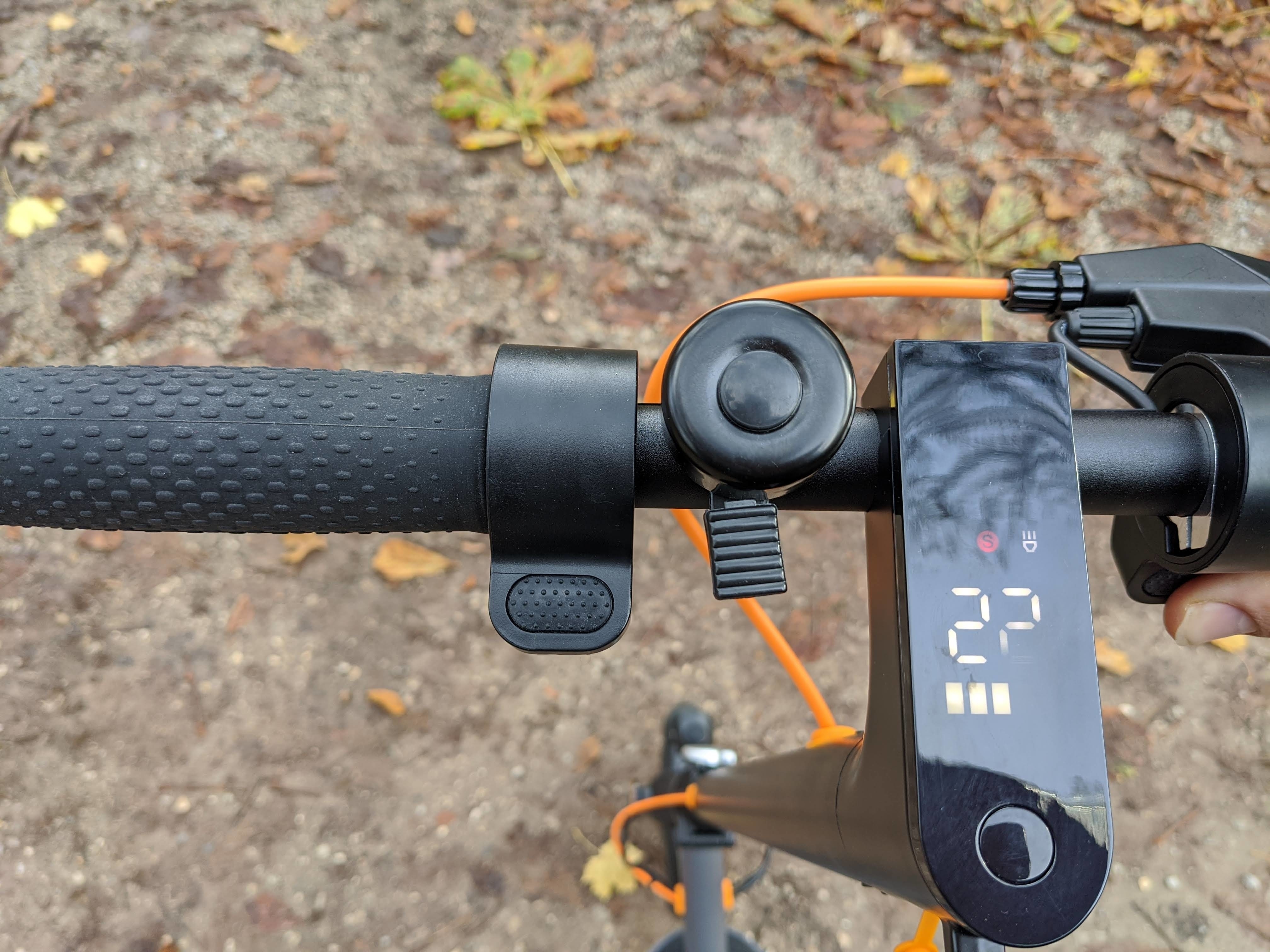 In der Mitte befindet sich oberhalb des Ein-/Austasters ein kleines, auch bei direkter Sonneneinstrahlung gut lesbares Display, welches neben der aktuellen Geschwindigkeit in ganzen Zahlen außerdem den Akkuladestand in fünf Balken zeigt. Das ist sehr rudimentär. Eine Möglichkeit, die Anzeige zum Beispiel auf die Gesamtkilometer zu wechseln, gibt es nicht. Auch eine App wie es sie beim IO Hawk Sparrow Legal (Testbericht) gibt, fehlt hier. Schlimm finden wir das nicht, gehören alle E-Scooter-Apps, die wir bisher ausprobieren konnten, doch eher in die Kategorie Spielerei ohne Mehrwert .