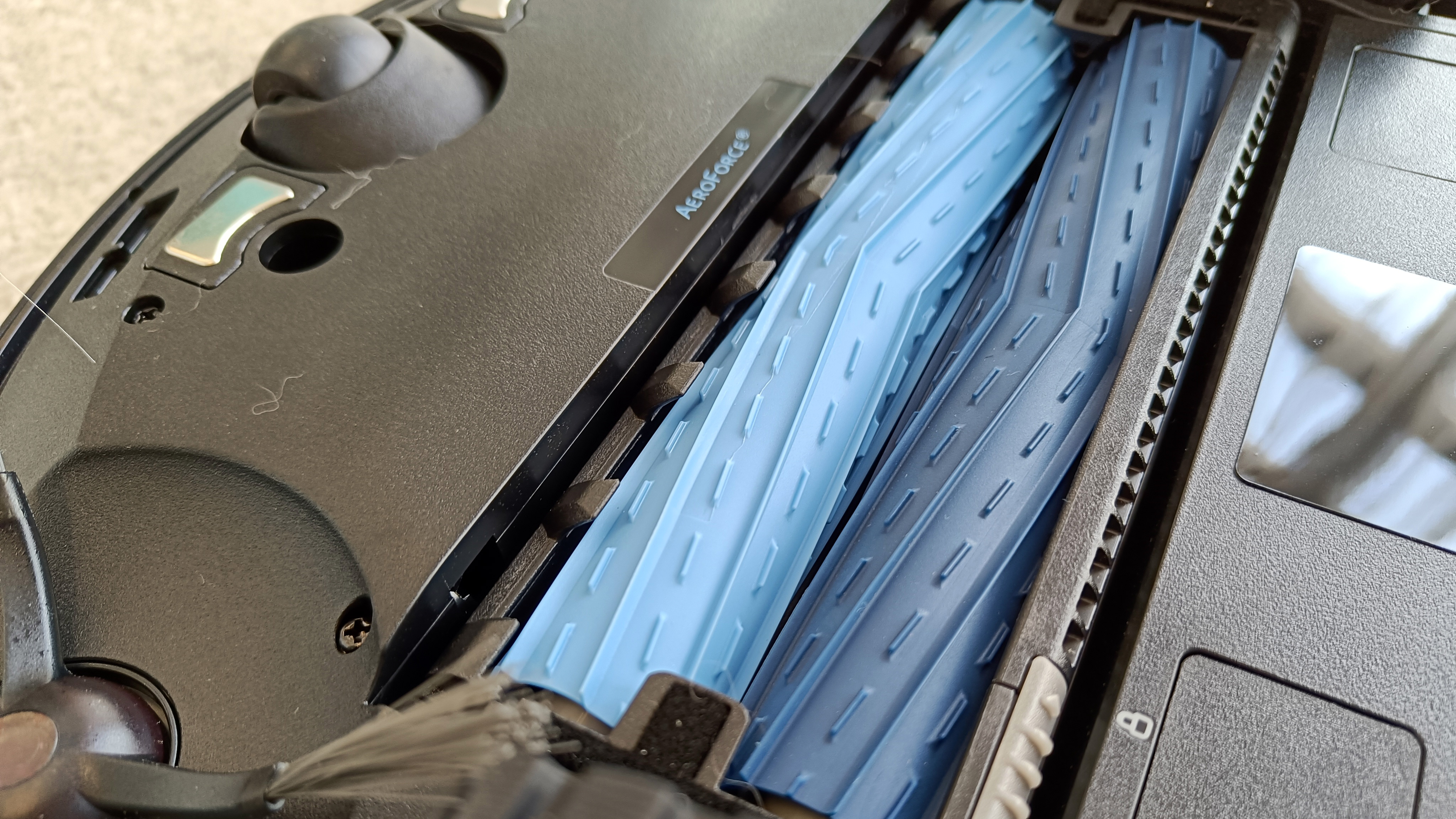 Weitere Unterschiede findet man unten am Roboter. Der T9 AIVI setzt auf die von iRobot bekannte Aeroforce-Technologie. Im Gegensatz zum T9+ gibt es daher nicht eine einzelne Hauptbürste mit einer Mischung aus Borstenreihen und Gummilippen, sondern zwei gegenläufig drehende, V-förmige Gummirollen. Die neue Technik ist auch der Grund, warum die „alten“ Absaugstationen des T9+ nicht mehr ohne Modifikation mit dem neuen Roboter zusammenarbeiten. Für den Duftspender des T9 gilt das nicht, der funktioniert problemlos auch im AIVI-Modell. Nur im Lieferumfang dabei ist er nicht.