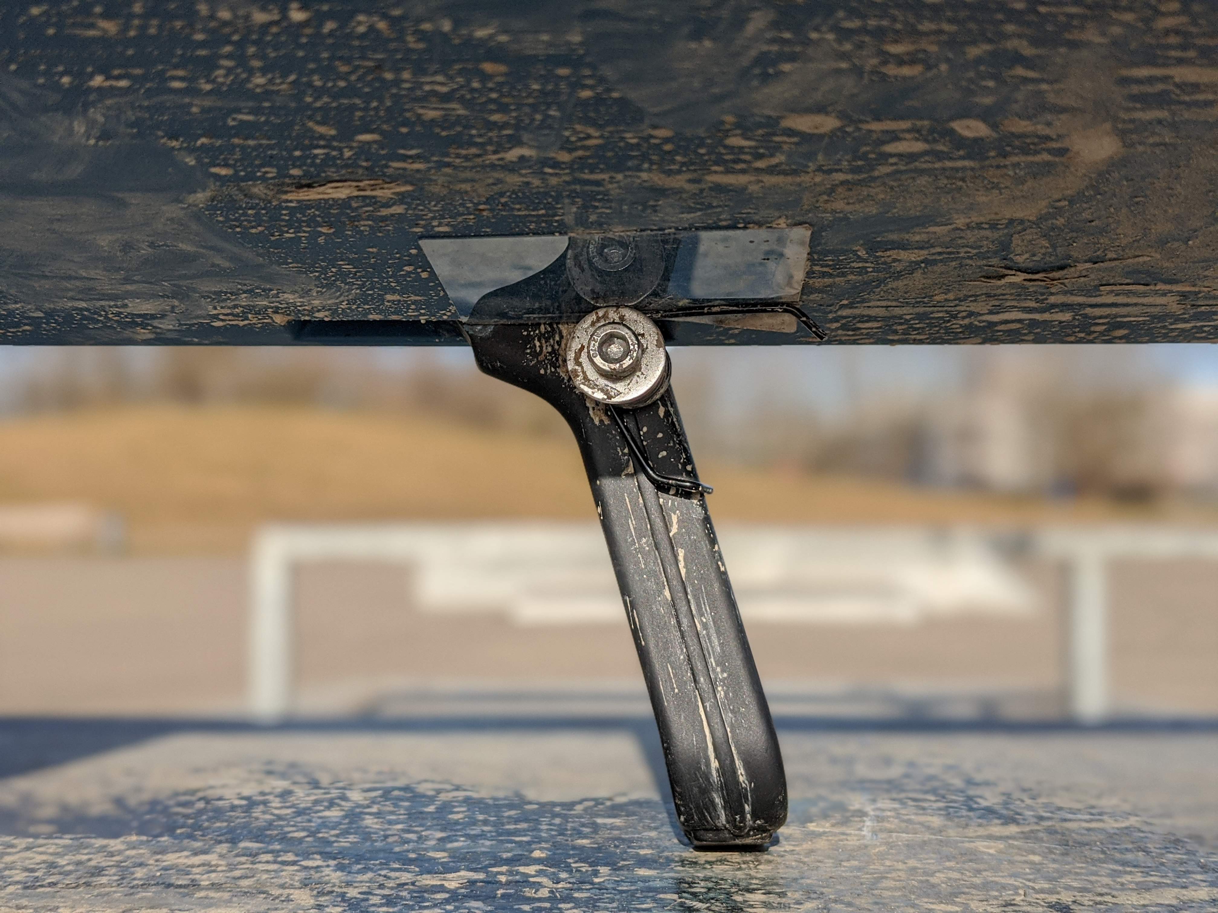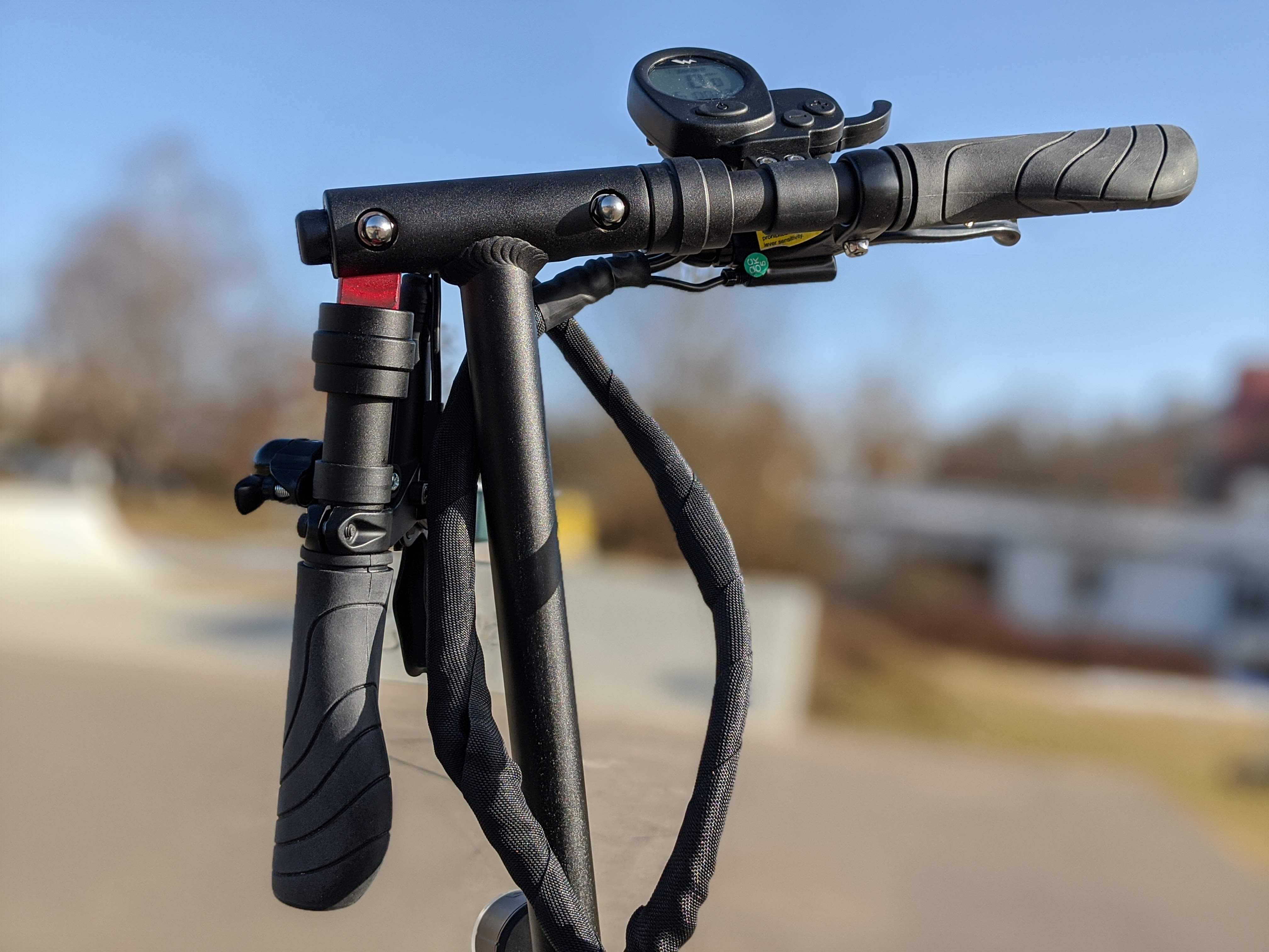 Positiv erwähnenswert ist noch die 2 × 7,7 Zentimeter breite Öse zum Festschließeh des E-Scooters, auch wenn sie für einige Schlösser zu schmal sein könnte. Etwas Probleme haben wir mit dem Standfuß, der nicht richtig halten will und stets wieder einklappt.