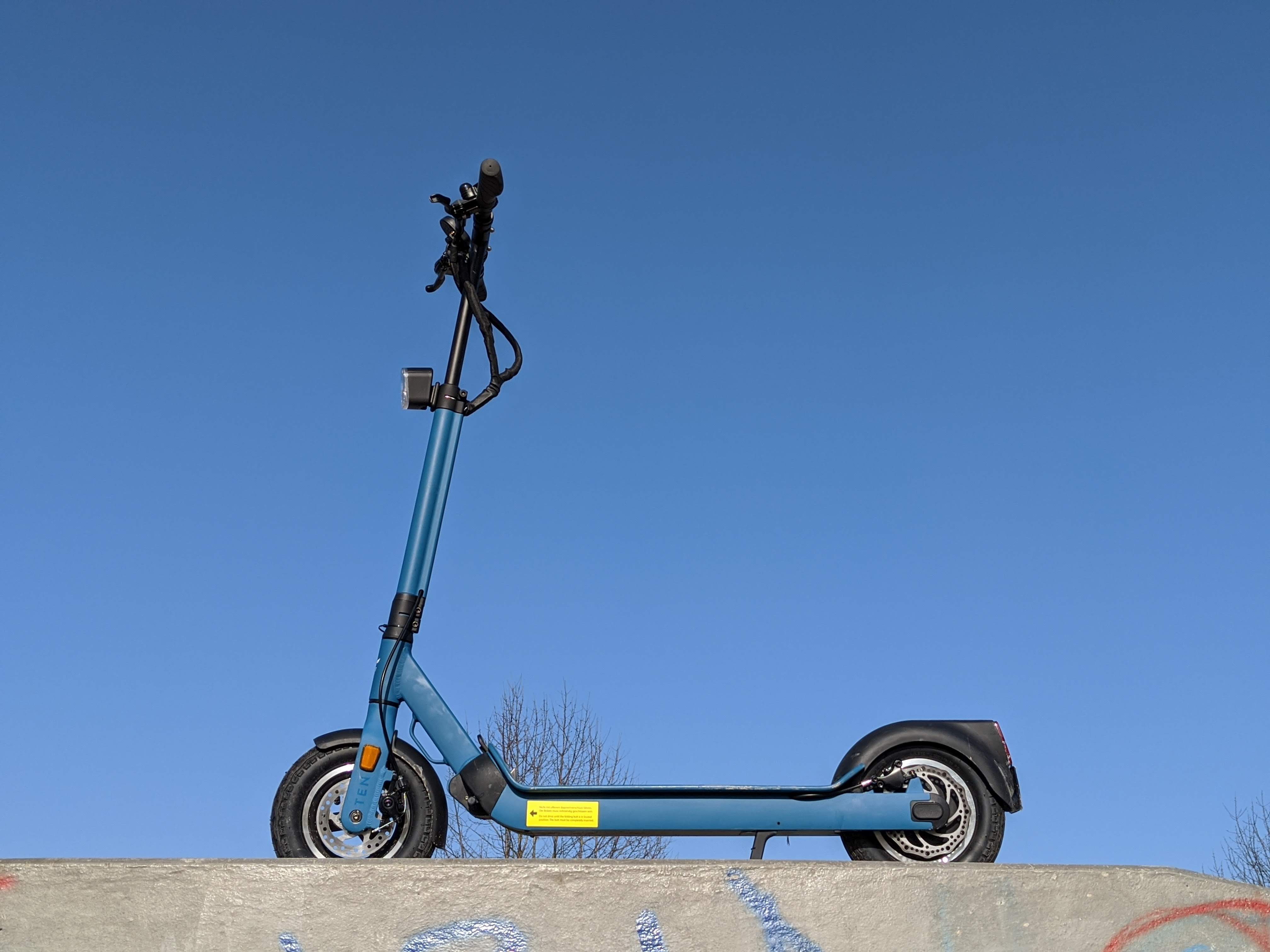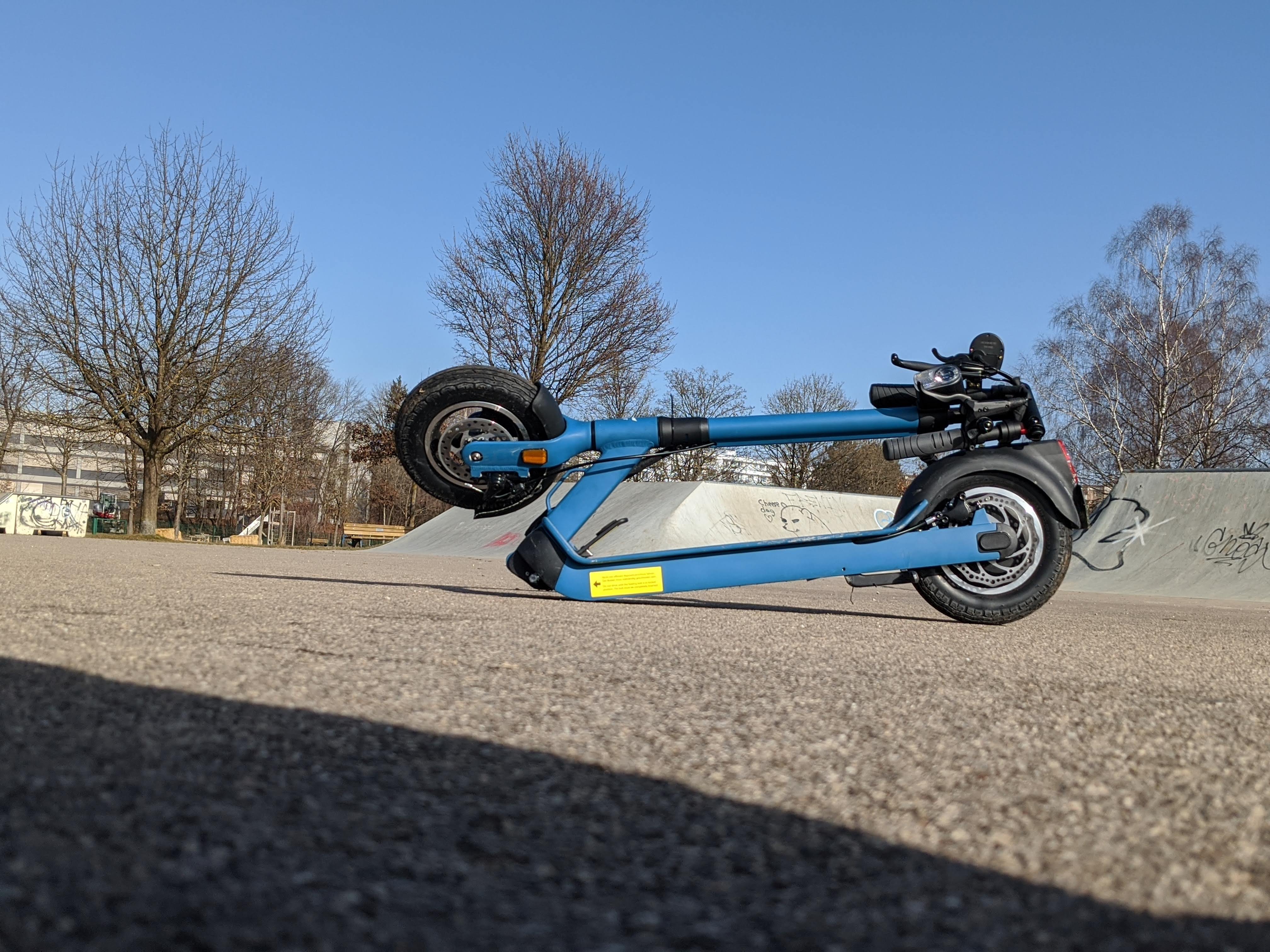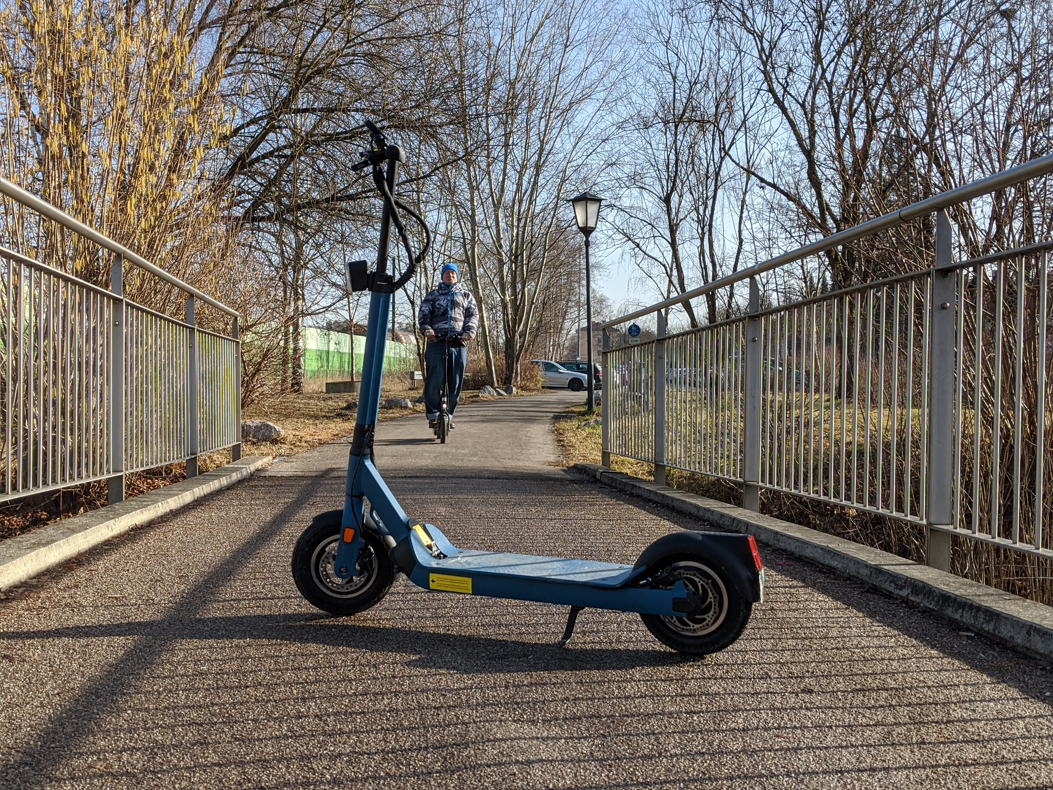 Das Trittbrett ist mit einer Länge von 47 und einer Breite von 18 Zentimetern angenehm groß. Lange Füße sind also kein Problem, eine überdurchschnittliche Körpergröße dagegen möglicherweise schon. Denn die höhenverstellbare Lenkstange misst vom Trittbrett nur maximal 95 Zentimeter. Der Testfahrer ist 186 Zentimeter groß und hat damit keine Probleme. Wer allerdings größer ist und/oder lange Beine oder kurze Arme hat, sollte dringend vor dem Kauf Probefahren. Dauerhaft leicht gekrümmt zu cruisen ist nicht nur unangenehm, sondern auch ungesund. Das maximale Zuladegewicht liegt bei 100 Kilogramm.