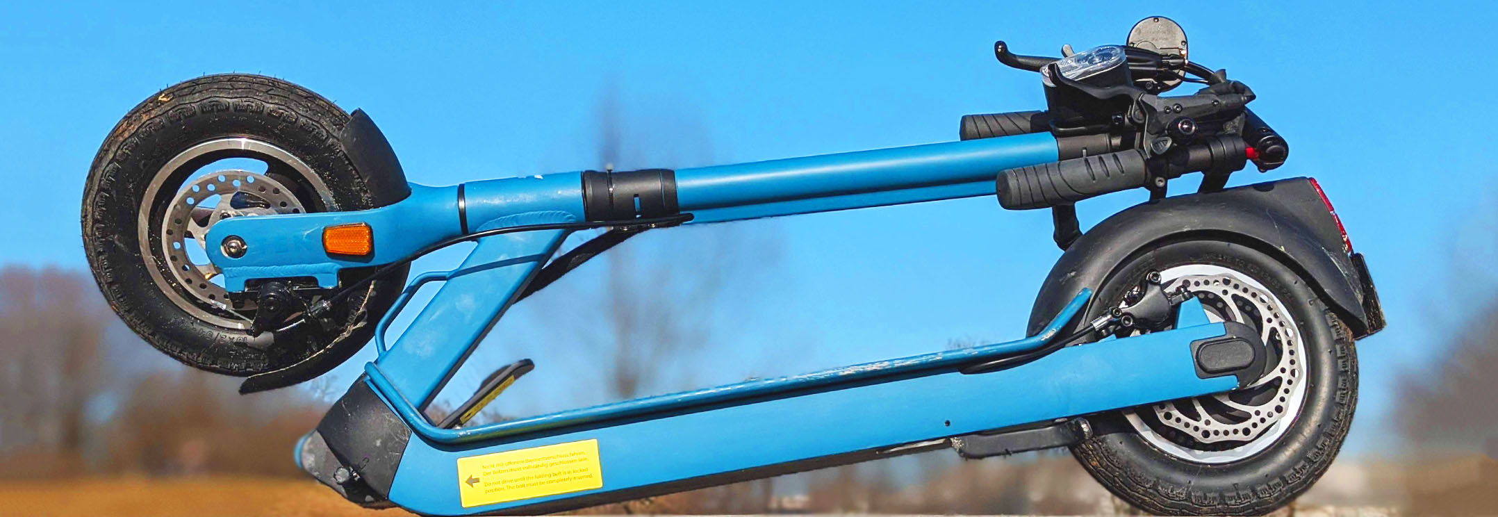 Der Clou am Egret Ten V4 ist sein Klappmechanismus. Die Mechanik am unteren Ende der Lenkstange ist hochwertig und stabil. Sie macht den Eindruck, so einiges auszuhalten. Außerdem ist der Egret Ten V4 der einzige E-Scooter unserer Testreihe, der auch die Lenkergriffe anlegen kann. So verringern sich seine Maße in allen Dimensionen von ausgeklappt 115 × 54,5 × 95-115 Zentimeter auf zusammengeklappt 107 × 18,5 × 38 Zentimeter. So sollte er auch in sehr kleine Kofferräume passen. Im zusammengeklappten Zustand kann man den 17 Kilogramm schweren E-Scooter an der Lenkstange auch vergleichsweise komfortabel mal ein paar Meter tragen.