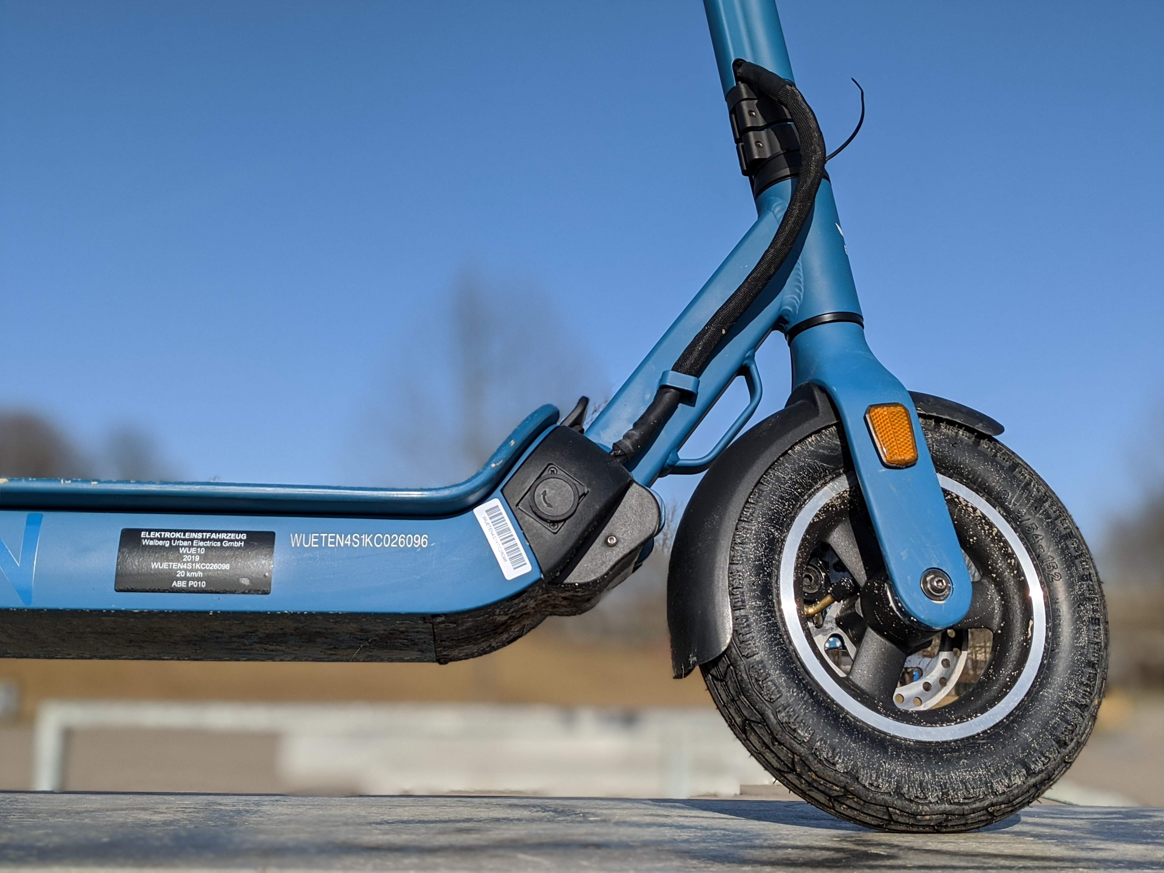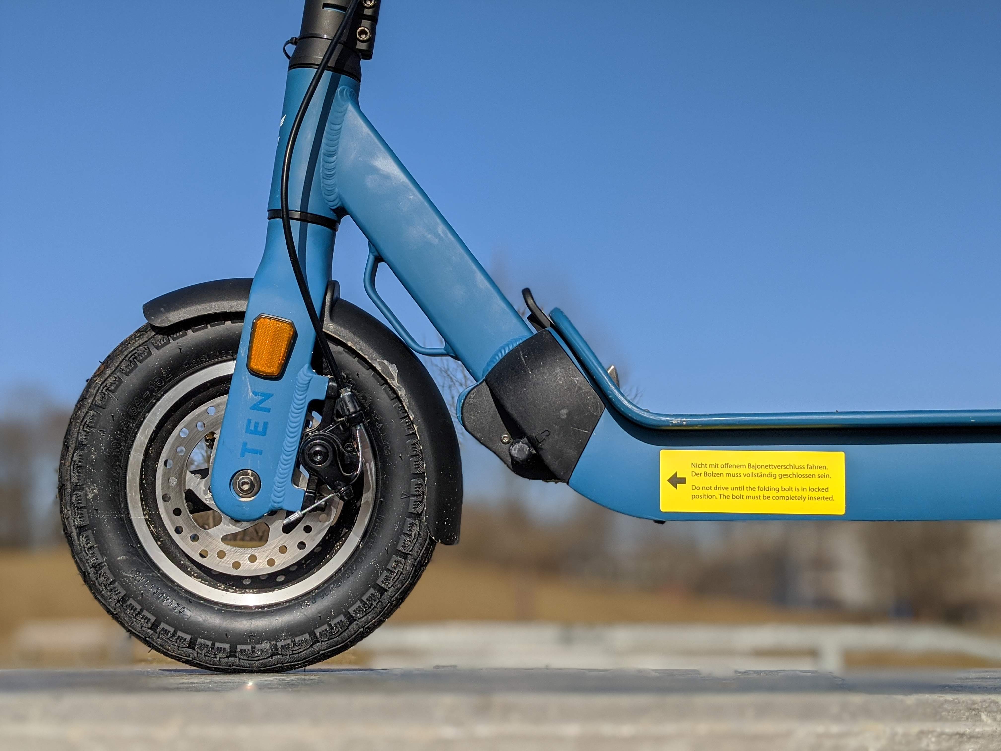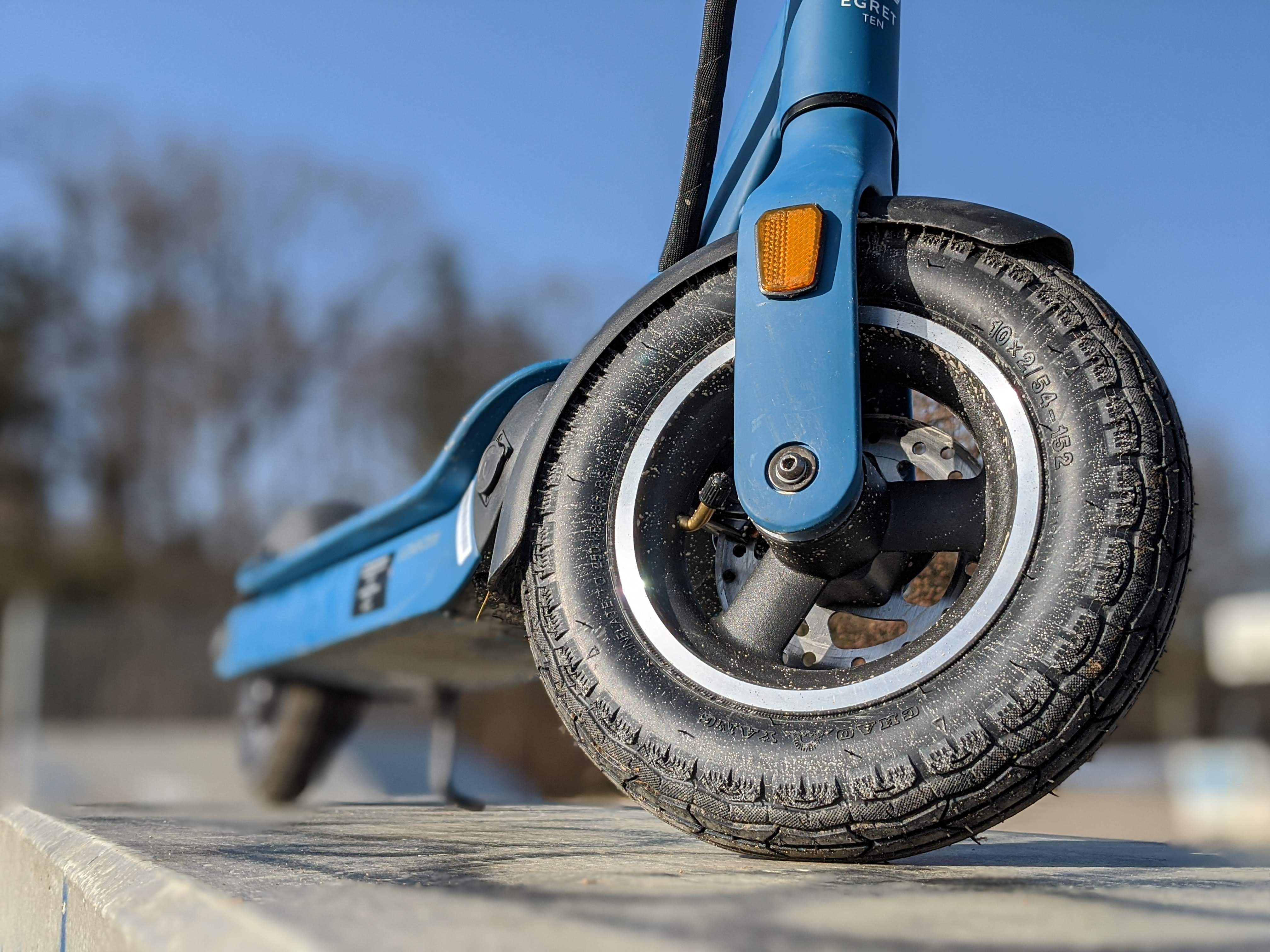 Die 10 Zoll großen Luftreifen laufen sehr widerstandsarm. Das spart nicht nur Akku, sondern erleichtert auch das manuelle Treten, sollte zum Beispiel mal der Akku leer sein. Auch fangen die Luftreifen dank ihrer Größe schon die gröbsten Ruckler ab, eine zusätzliche Federung wie sie zum Beispiel beim Mytier E-Scooter (Testbericht) und Trekstor EG 3178 (Testbericht) wegen ihrer Vollgummireifen zum Einsatz kommen, ist nicht nötig. Dafür besteht die Gefahr einer Reifenpanne.