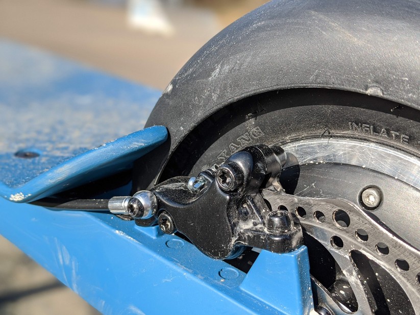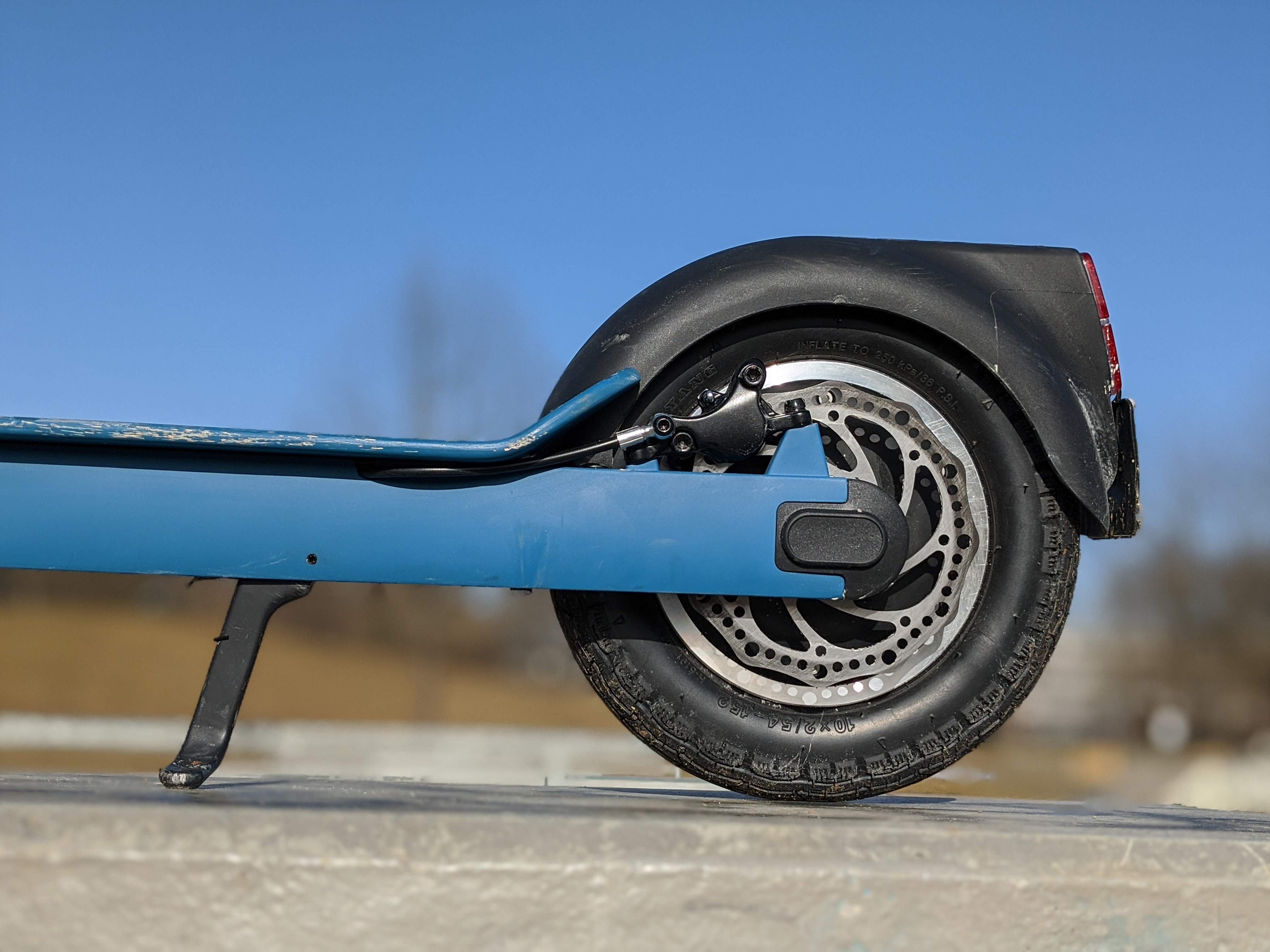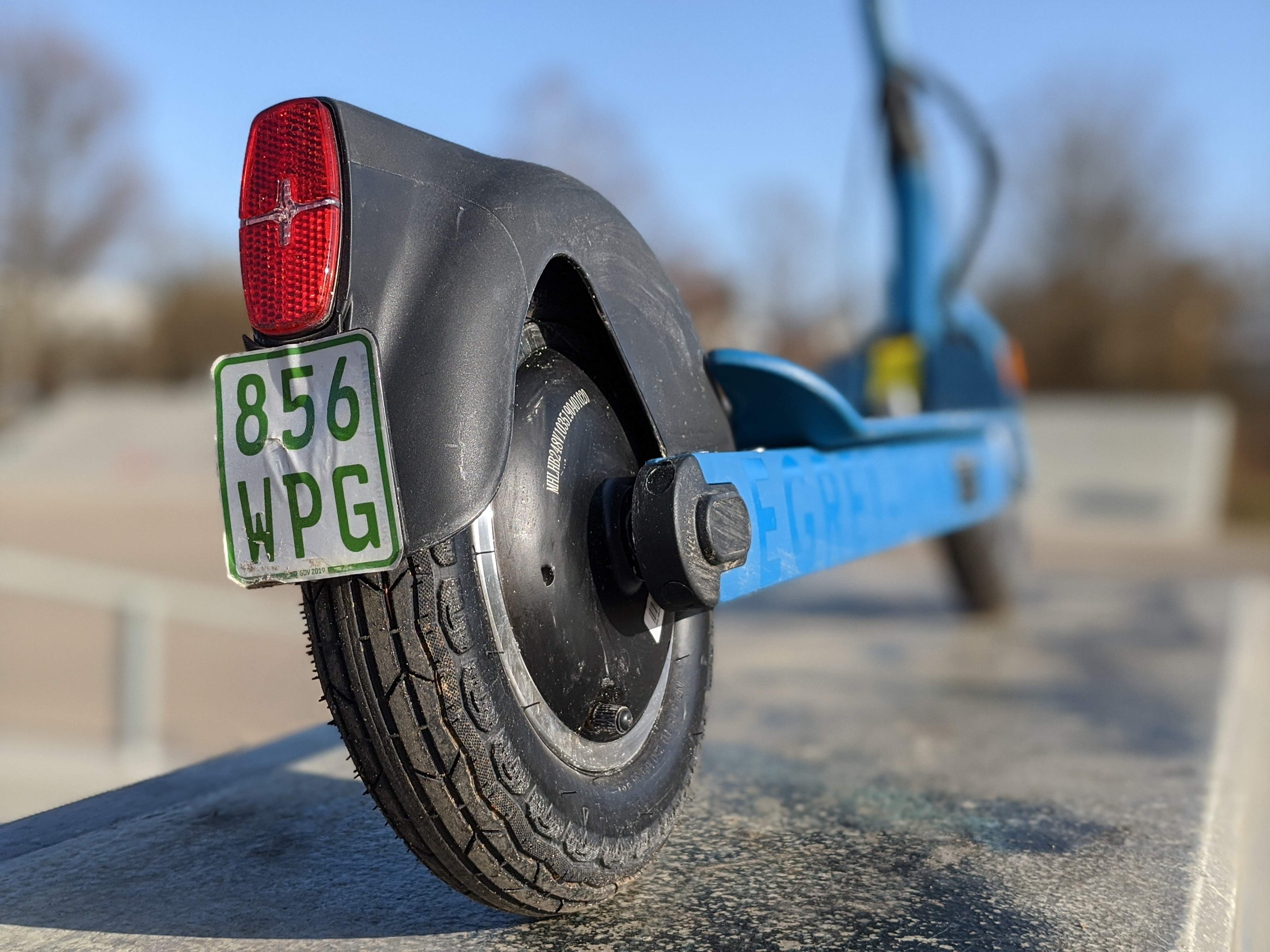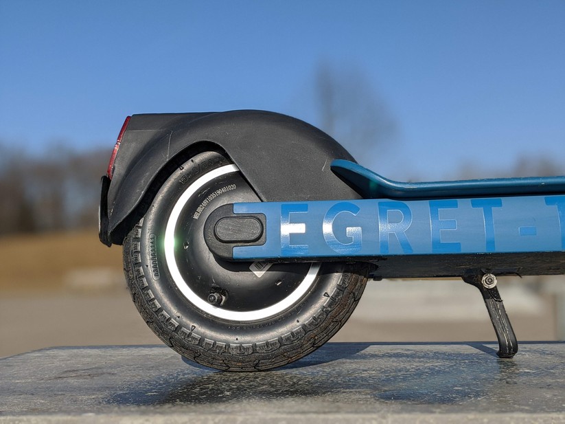 Die 10 Zoll großen Luftreifen laufen sehr widerstandsarm. Das spart nicht nur Akku, sondern erleichtert auch das manuelle Treten, sollte zum Beispiel mal der Akku leer sein. Auch fangen die Luftreifen dank ihrer Größe schon die gröbsten Ruckler ab, eine zusätzliche Federung wie sie zum Beispiel beim Mytier E-Scooter (Testbericht) und Trekstor EG 3178 (Testbericht) wegen ihrer Vollgummireifen zum Einsatz kommen, ist nicht nötig. Dafür besteht die Gefahr einer Reifenpanne.