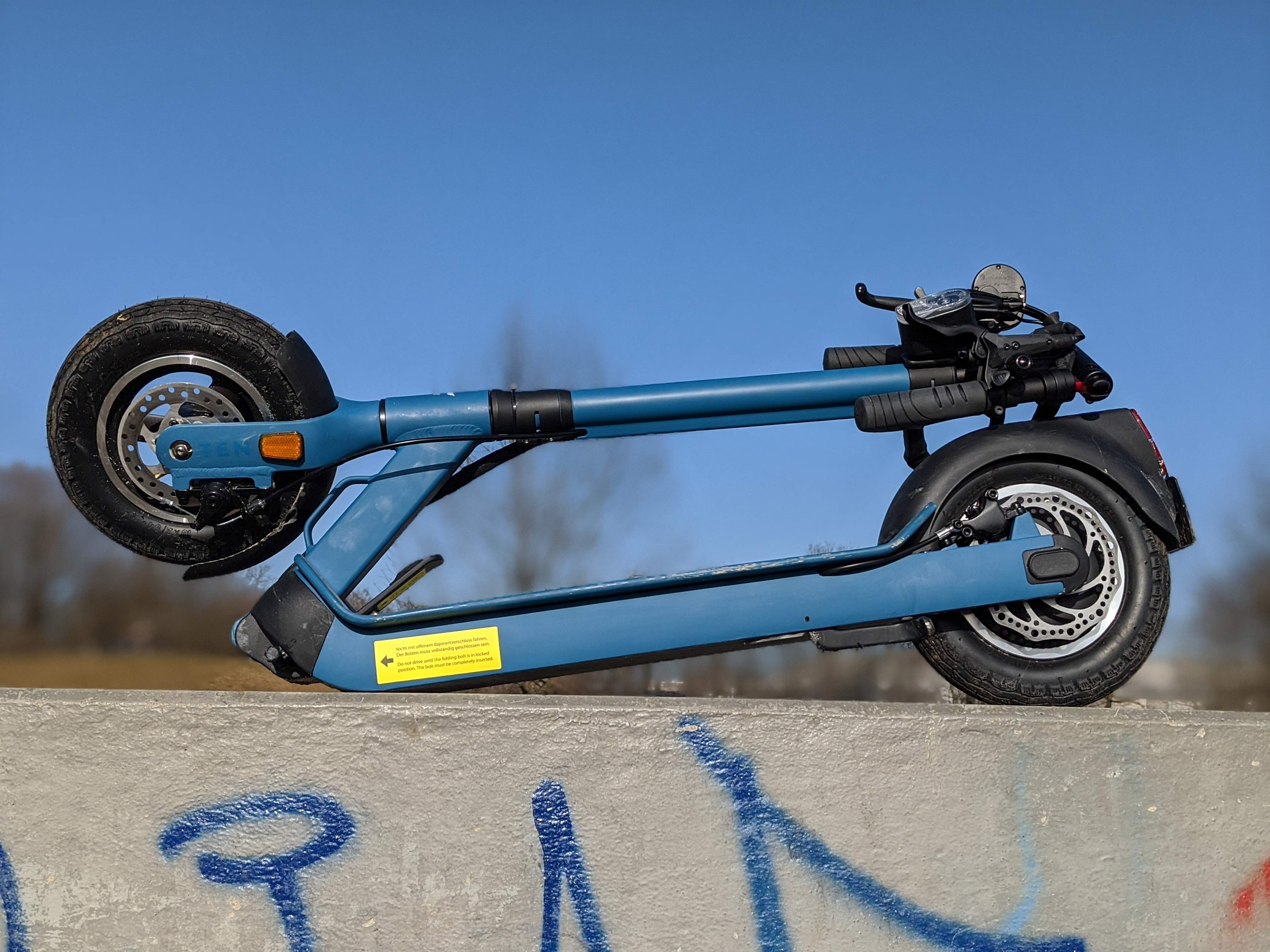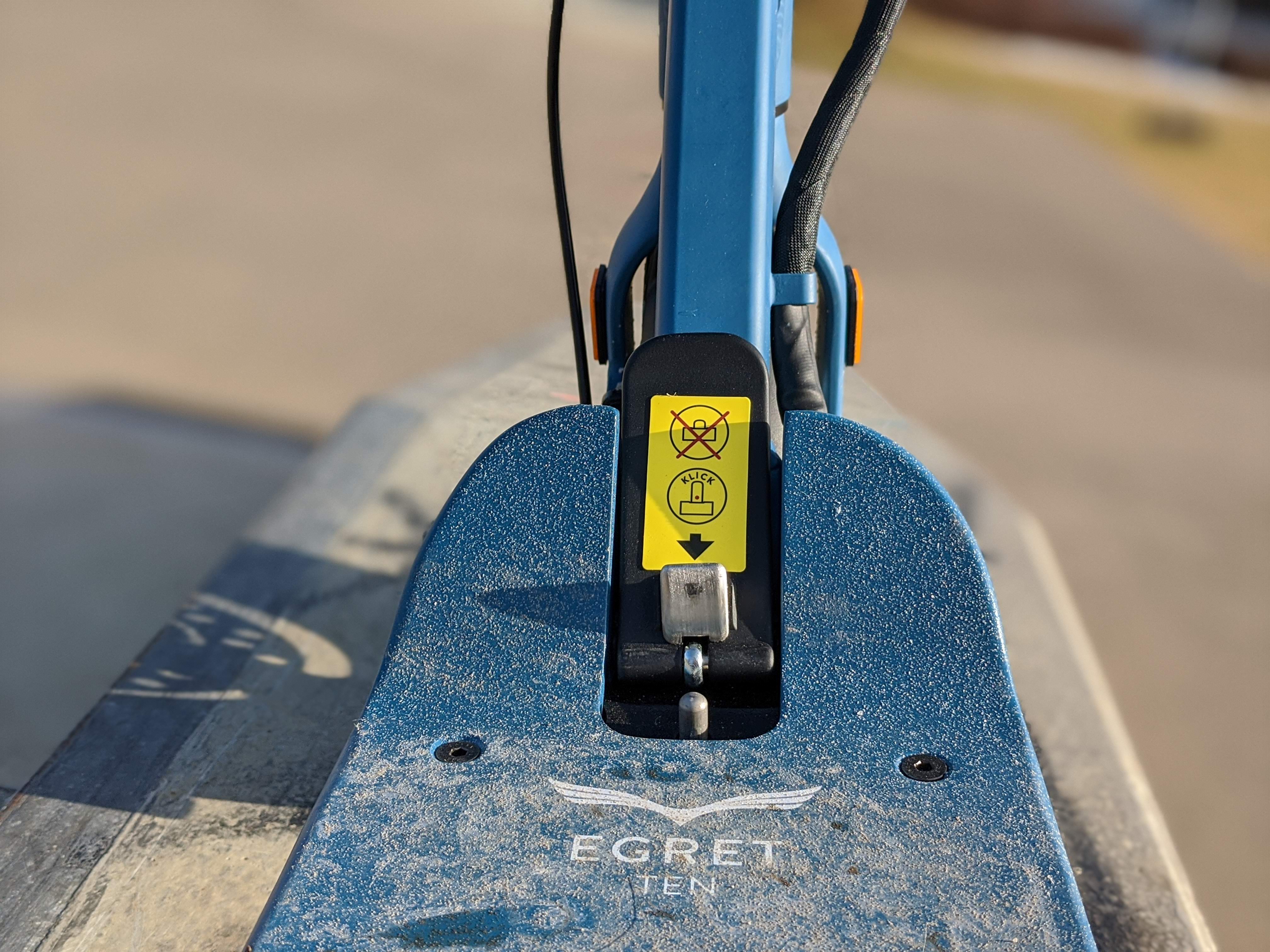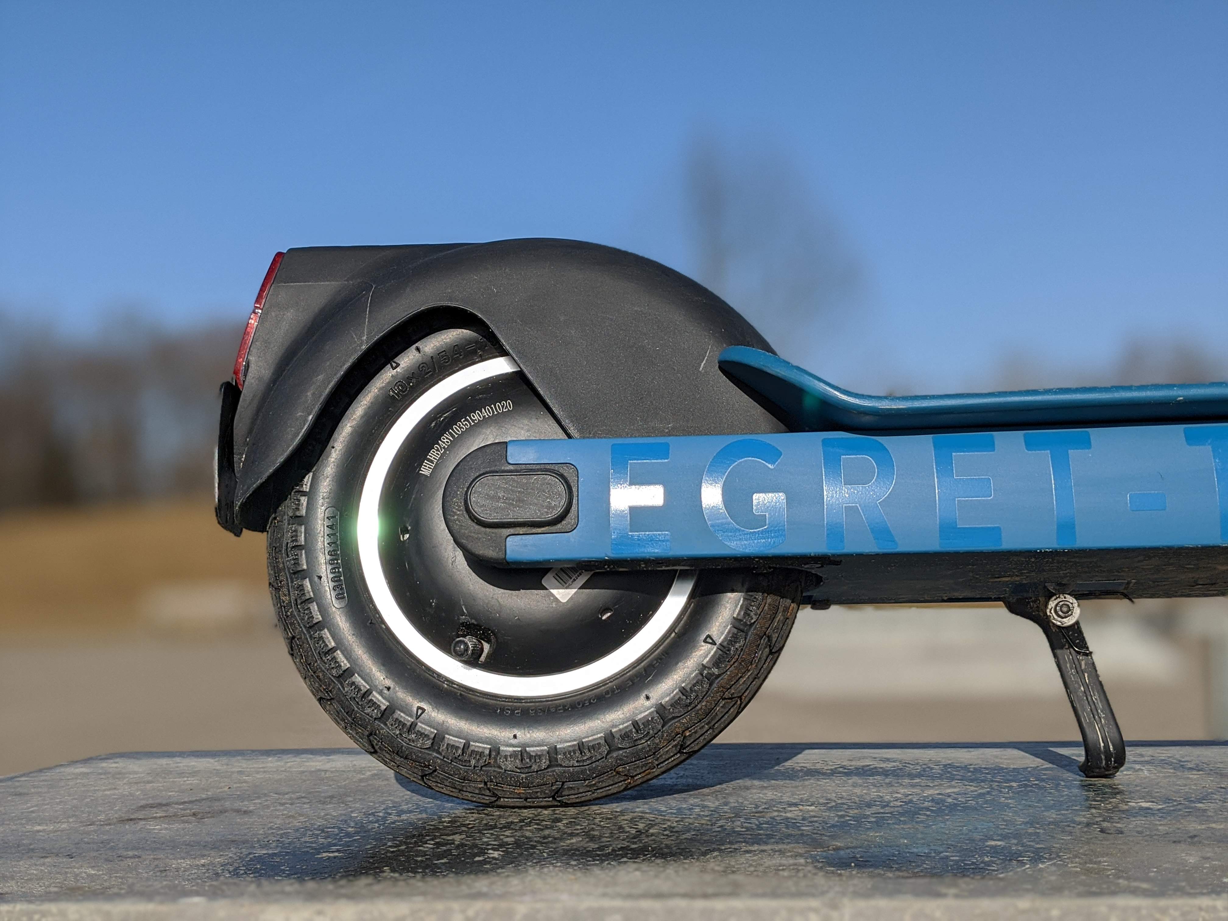 Der Egret Ten V4 überzeugt vor allem durch sein exzellentes Fahrgefühl. Das Trittbrett ist riesig, der leise Motor beschleunigt so stark wie kaum ein anderer, die Bremsen greifen zuverlässig, nichts wackelt und die großen Luftreifen fangen die meisten Unebenheiten zuverlässig ab. Der Klappmechanismus ist zuverlässig, die Griffe lassen sich ebenfalls umklappen, um die Maße weiter zu verringern – eine echte Seltenheit unter den E-Scootern.