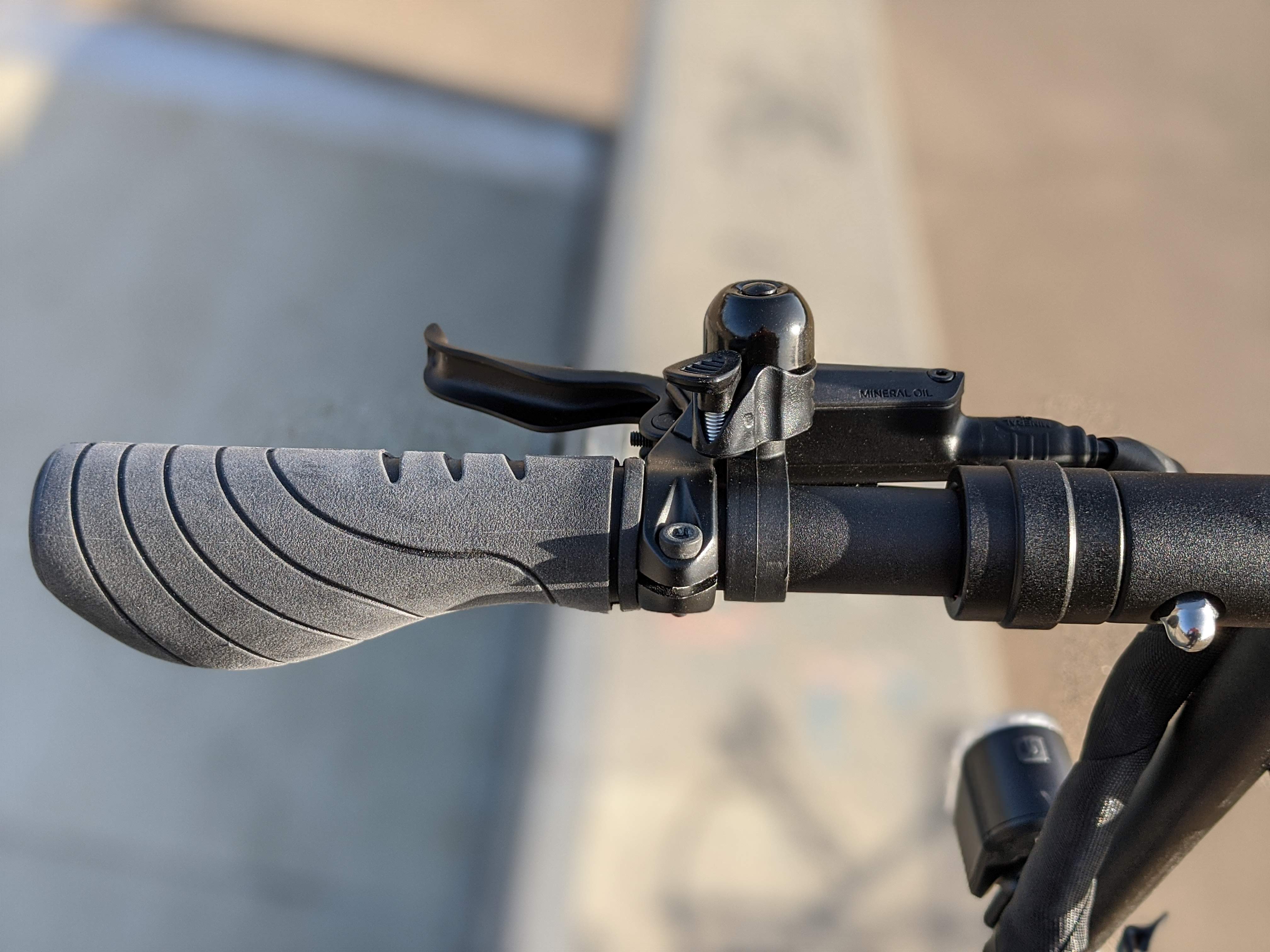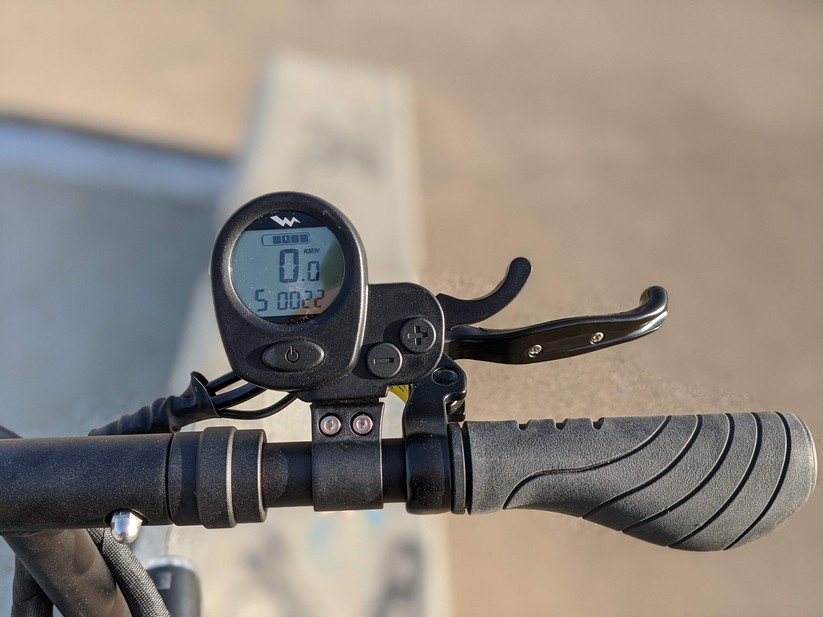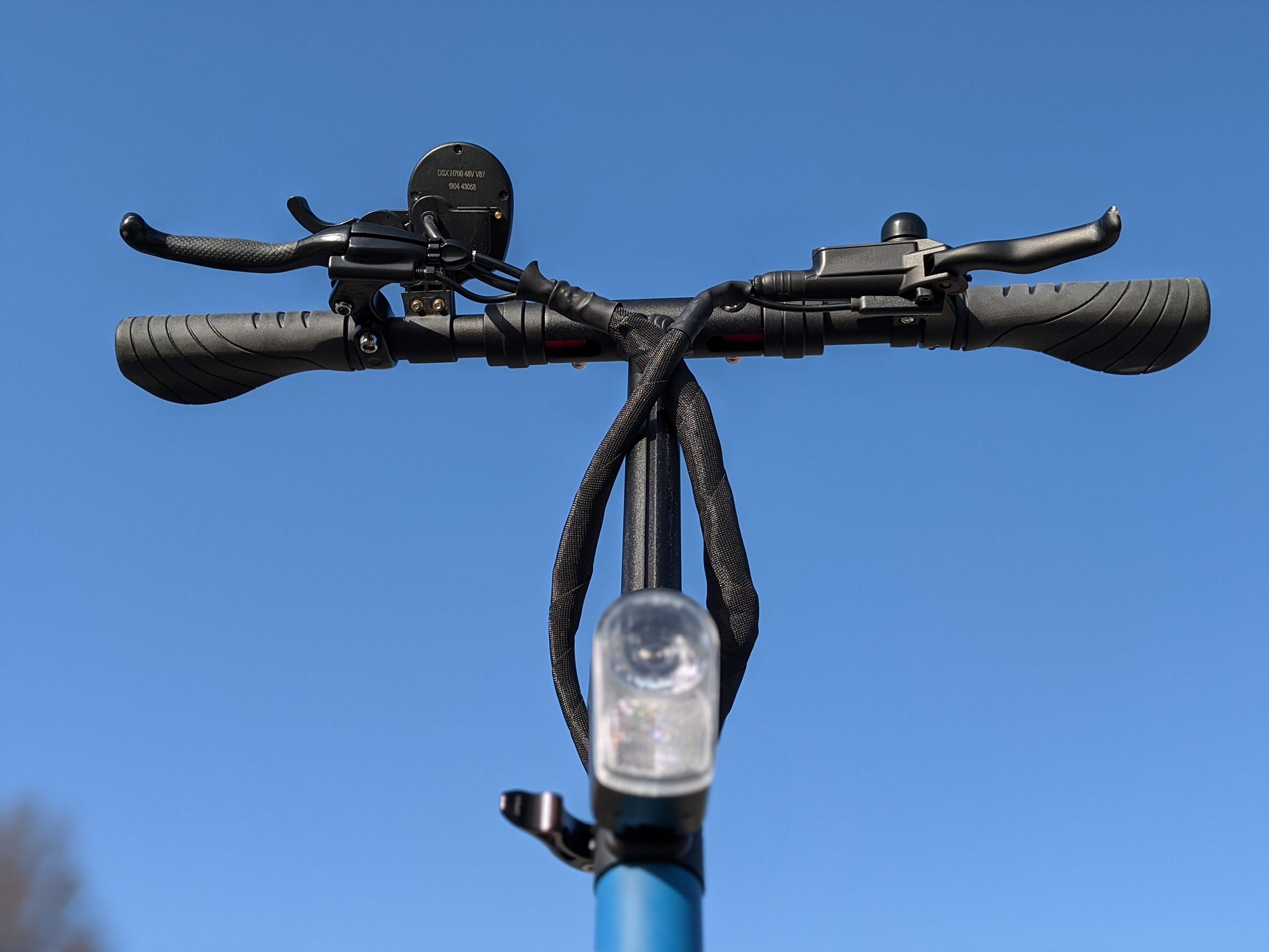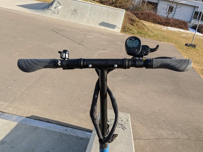 Das Display mit Gaszug wirkt altmodisch und aus der Zeit gefallen. Zum einen ist das hintergrundbeleuchtete, monochrome LC-Display unförmig. Es zeigt die Geschwindigkeit mit einer Nachkommastelle, die Akkuladung in fünf Balken, die Fahrstufe und die Gesamtkilometer an. Zum anderen steht es wie ein Fremdkörper vom Lenker ab, wirkt wie nachträglich aufgesetzt und wenig stabil. Der Gashebel sitzt oberhalb des Lenkers. Üblicherweise sitzt er unterhalb des Lenkers und wird mit dem Daumen gedrückt; hier kommt der Zeigefinger zum Einsatz. Einige Käufer beschweren sich in Foren über den Zeigefingerzug des Egret Ten V4. Wir finden die Lösung ziemlich gut, da so auch bei längeren Fahrten kaum Ermüdungserscheinungen auftreten. Was ebenfalls hilft, sind die breiten Auflageflächen der gummierten Handgriffe.