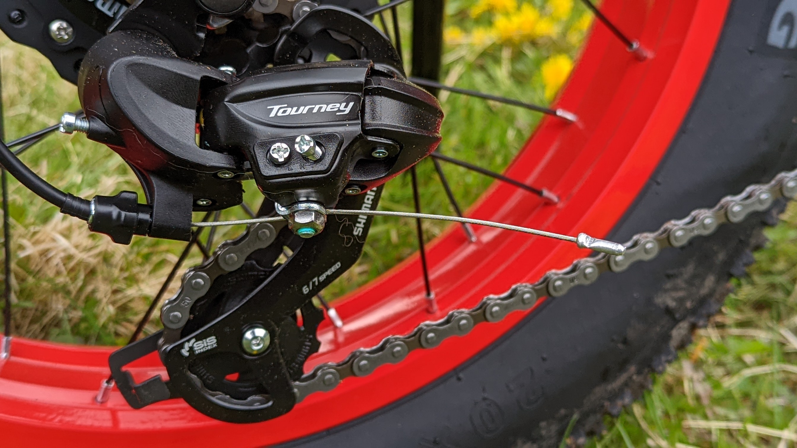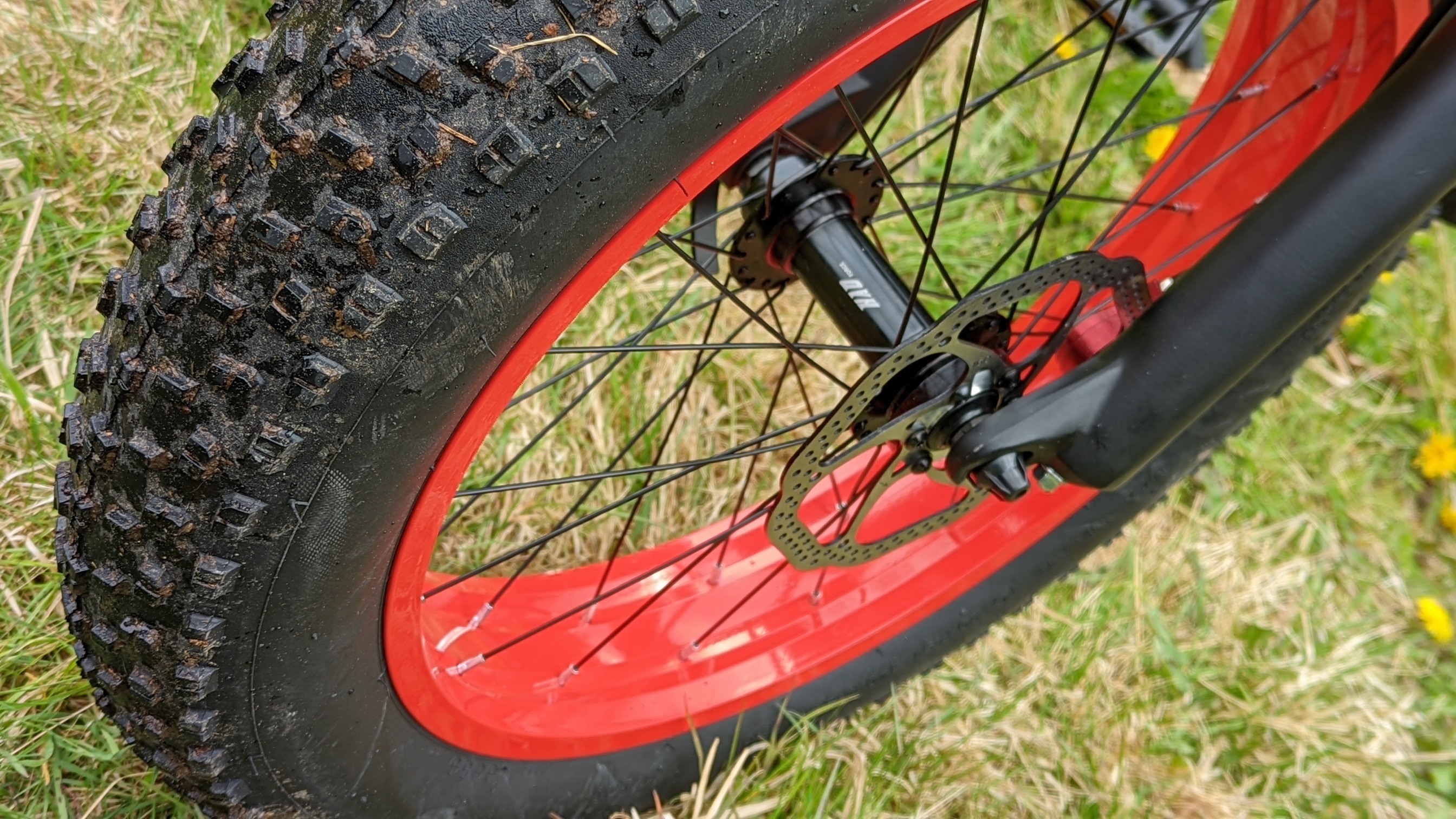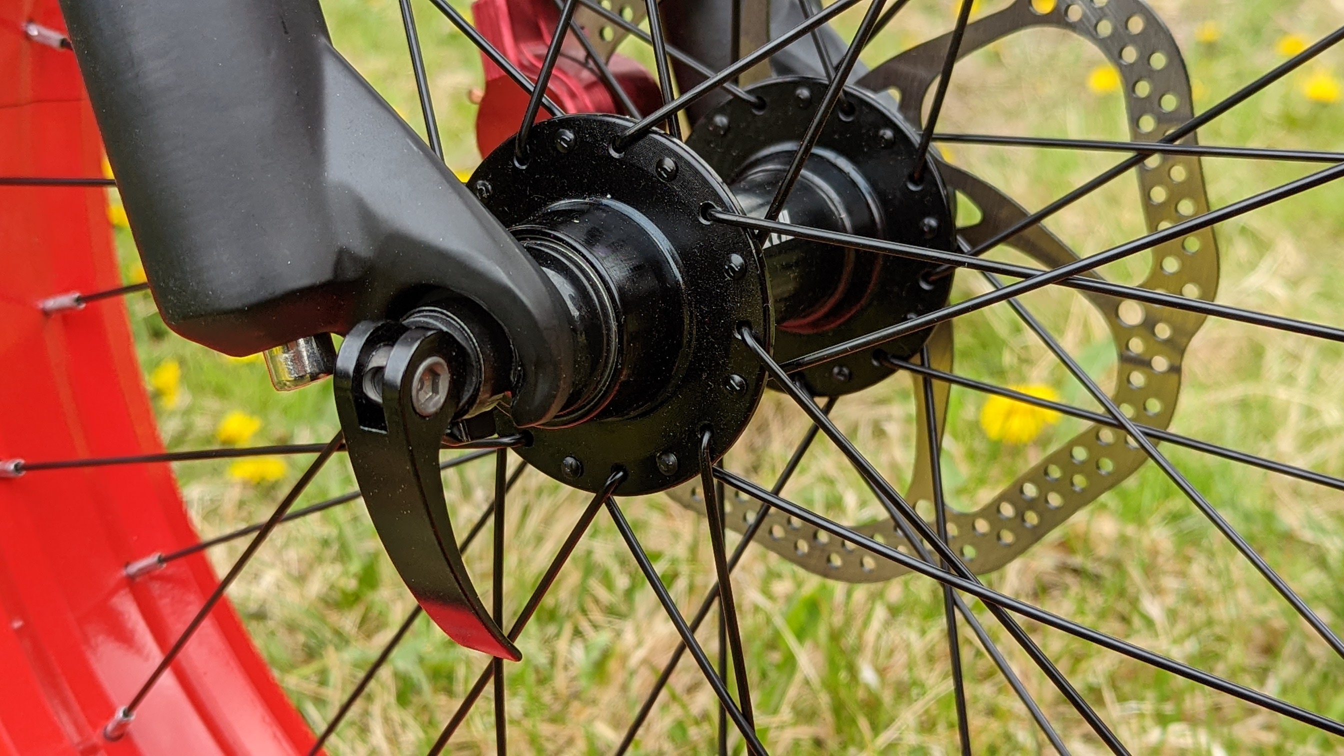 Wer eher unauffällig durch die Gegend cruisen will, sollte allgemein einen großen Bogen um Fatbikes machen. Diese sind nicht nur wegen ihrer Reifen ein echter Hingucker. Die Reifen sind etwa auf Asphalt deutlich lauter als ihre schmalen Geschwister. Das Laotie FT100 setzt optisch einen drauf. Es gibt es in Gelb und in der uns vorliegenden roten Variante. Diese Farbe findet sich neben dem Rahmen vor allem auf den Felgen wieder. Das sieht toll aus und sorgt für neugierige Blicke.