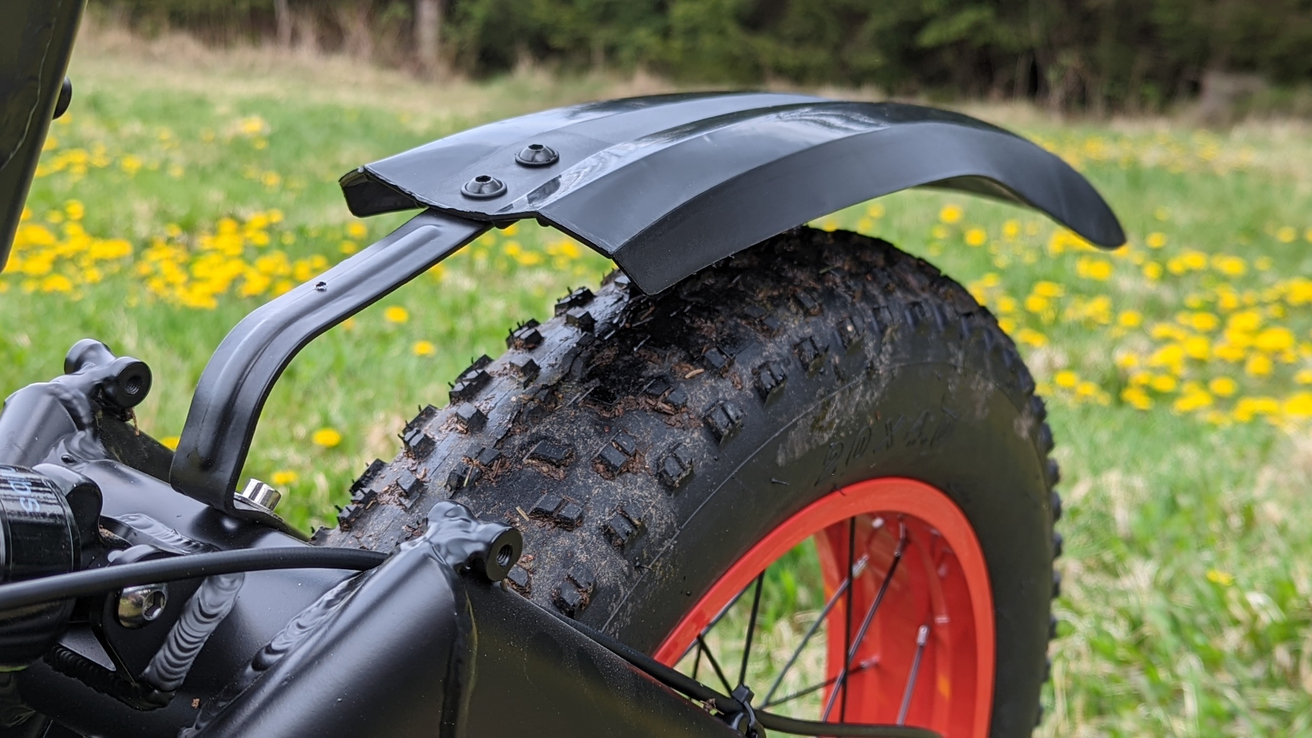 Der Rahmen selbst beherbergt den Akku. Nach hinten geht er im leichten Winkel nach oben. Das verleiht dem E-Fatbike ein dynamisches Aussehen. Das Laotie FT100 kommt mit Schutzblechen aus Kunststoff. Ohne sieht es klar besser aus. Dennoch würden wir empfehlen, die Schutzbleche zu montieren. Wer einmal mit Schmackes durch eine Matschpfütze fährt, wird sie schnell zu schätzen wissen.