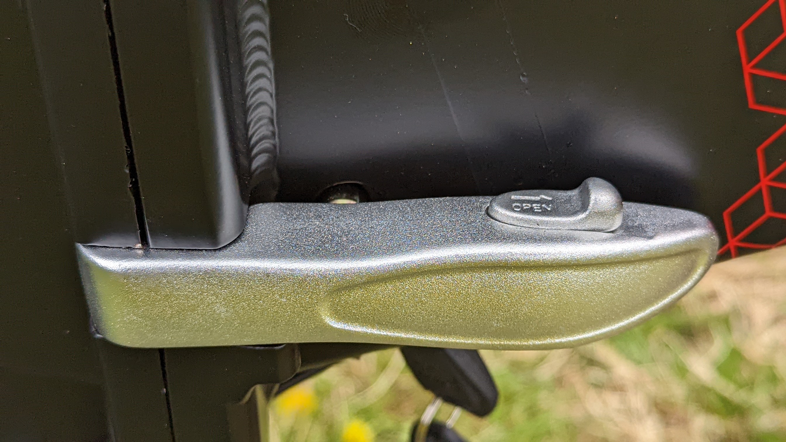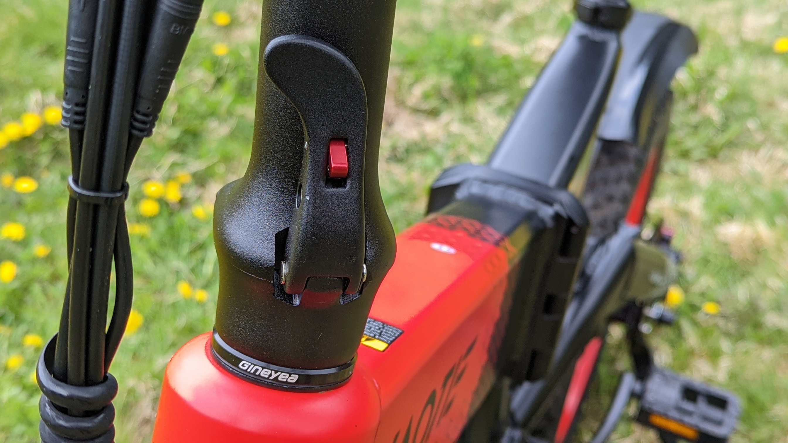 Zum Zusammenklappen legt man zunächst die Lenkstange um, klappt die Pedale ein und fährt den Sattel ganz nach unten. Über einen großen Sicherungshebel in der Mitte des Rahmens klappt das Laotie FT100 zusammen. So verringern sich die Maße von 177 Zentimeter Länge und 120 Zentimeter Höhe auf 100 Zentimeter Länge und 80 Zentimeter Höhe. Das Ganze dauert keine Minute.