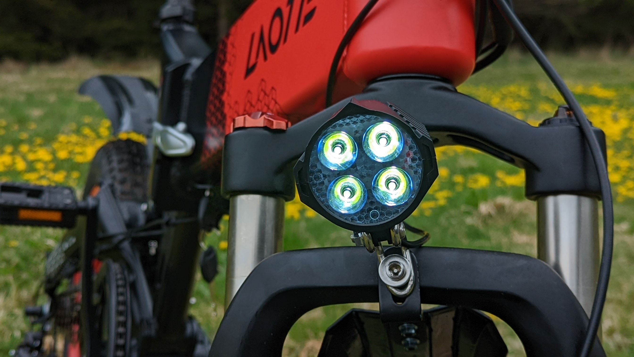 Das Frontlicht bietet vier helle LEDs, die in der Dunkelheit einen Weg ausreichend ausleuchten. Der Fahrer steuert es über den Bordcomputer. Leider hat das Laotie FT100 kein Rücklicht. Anderen chinesischen E-Bikes wie dem sehr guten Ado D30C (Testbericht) liegt eine batteriebetriebene Leuchte bei. Allerdings kann man auch für wenige Euro selbst ein Rücklicht nachkaufen. Mehr dazu in unserem Ratgeber Fahrradleuchten: Helles Licht mit Akku oder Batterie ab 15 Euro.