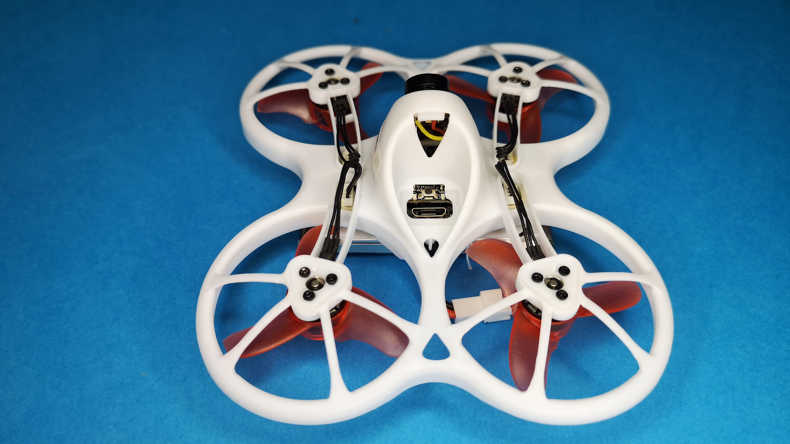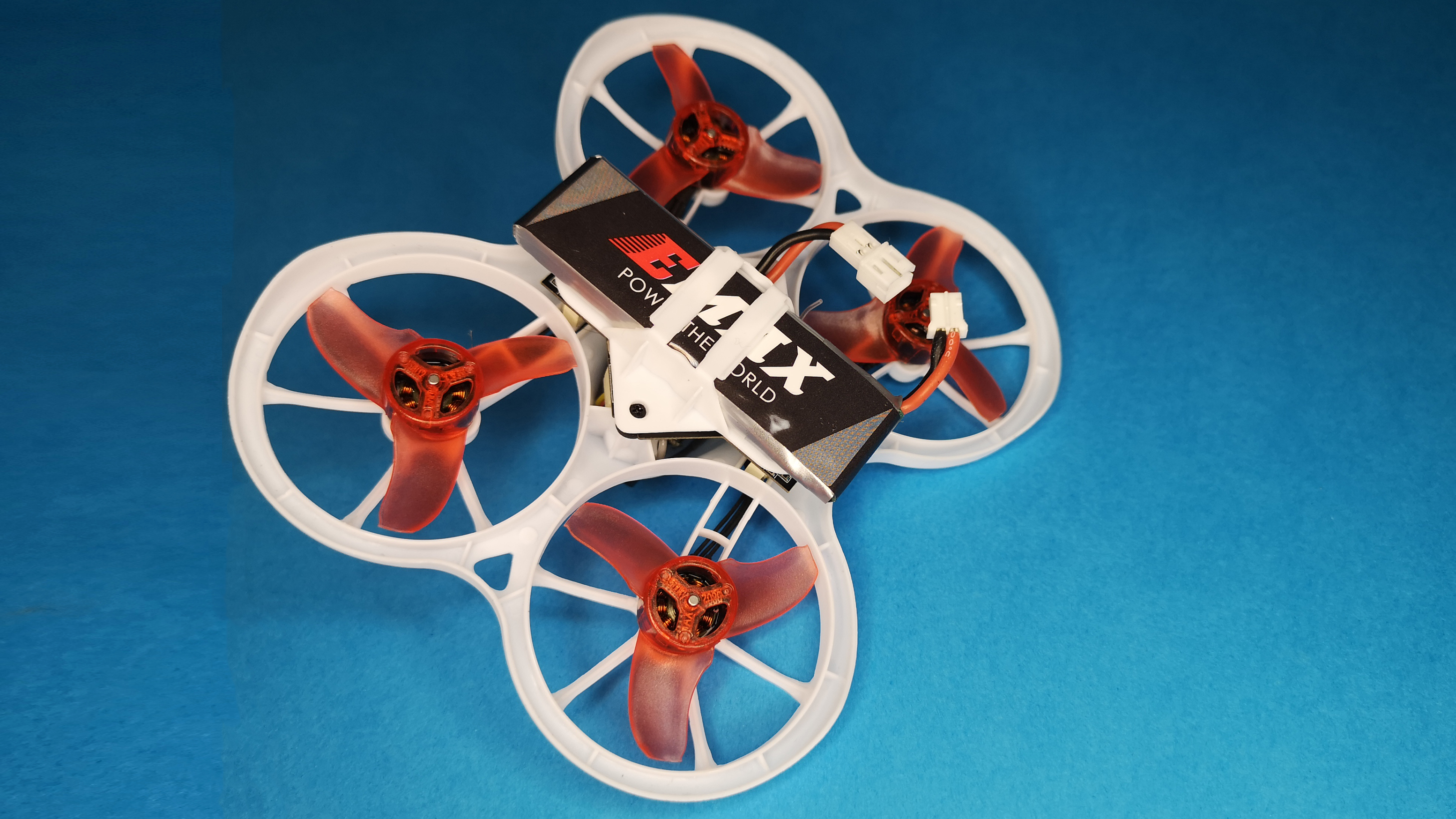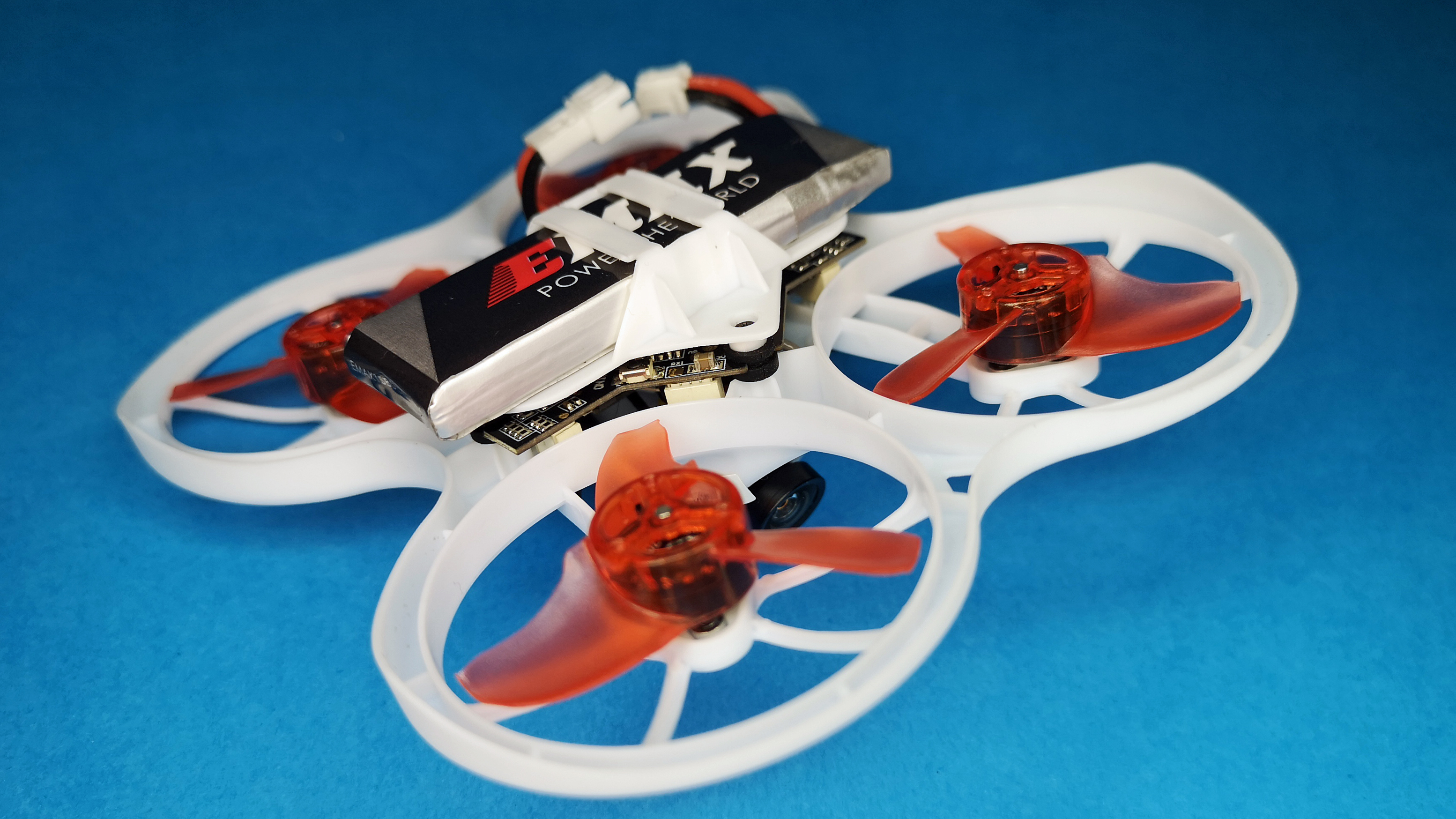 Das Auffälligste an der handtellergroßen Drohne mit dem Namen Tinyhawk ist dessen Aufbau mit den nach unten gerichteten Propellern in sogenannter Pusher-Bauweise. Der Rahmen des Mini-Copters besteht aus weißem Kunststoff und ist dadurch weniger verwindungssteif als große Racing-Drohnen mit Carbon-Rahmen. Die Vorteile dieser Bauweise sind das geringe Gewicht und die hohe Belastbarkeit des flexiblen Kunststoffs. Für den Antrieb sorgen vier kleine 0802er Brushless-Motoren, sie sind wartungsfrei und bieten im Vergleich zu Bürstenmotoren deutlich mehr Schub. Der im Copter integrierte Flight-Controller arbeitet mit der beliebten Firmware Betaflight, welche auch in professionellen und teuren FPV-Drohnen zum Einsatz kommt. Der installierte RC-Empfänger arbeitet mit dem Frsky-Protokoll. Für die Stromversorgung ist der mitgelieferte, einzellige 3,8 V Akku mit 450 mAh zuständig. Das Videobild der fest installierten Kamera wird per 5,8-GHz-Videosender übertragen.
