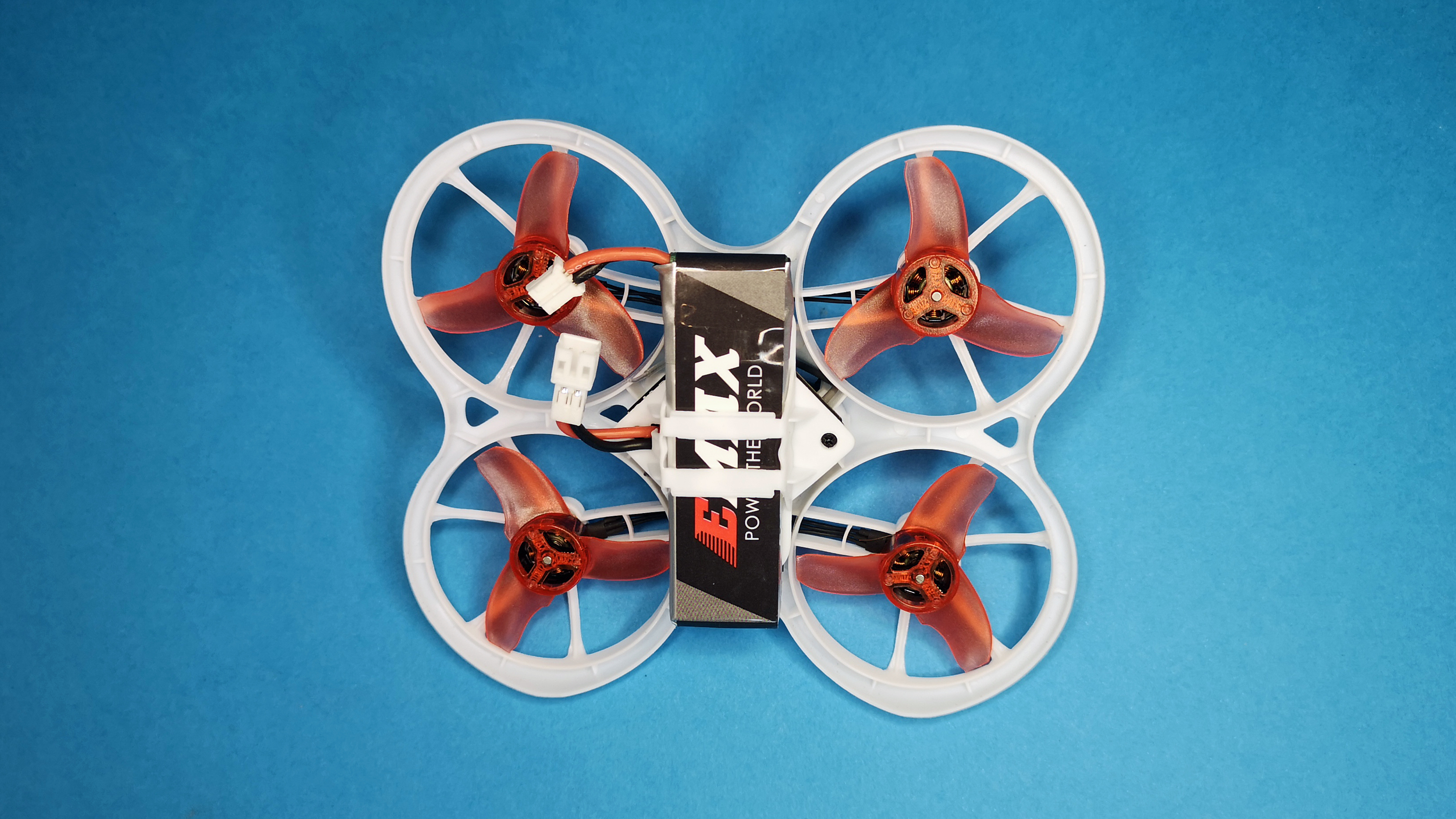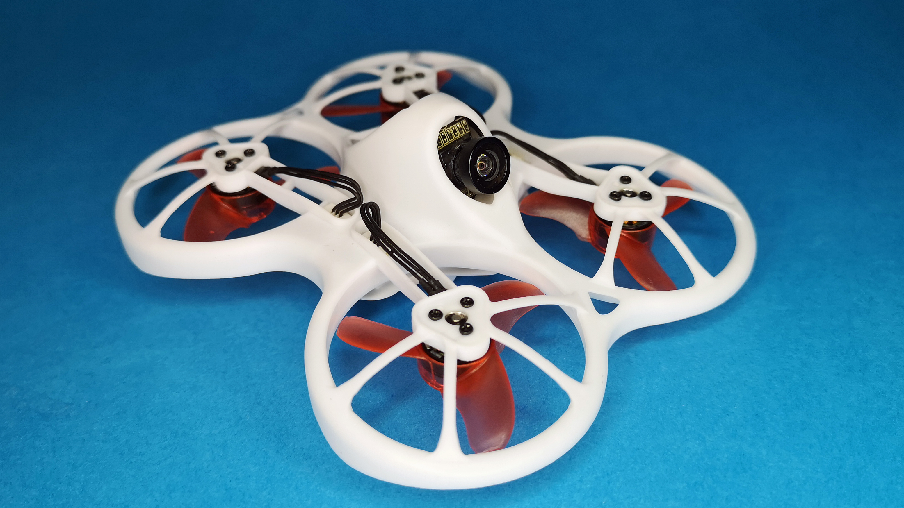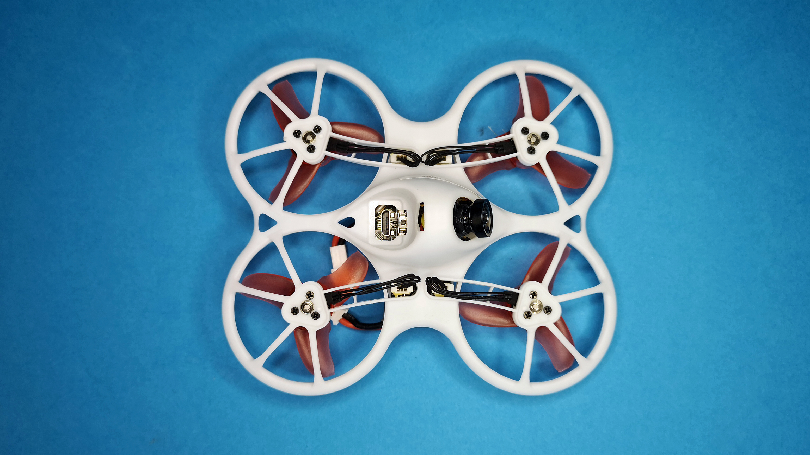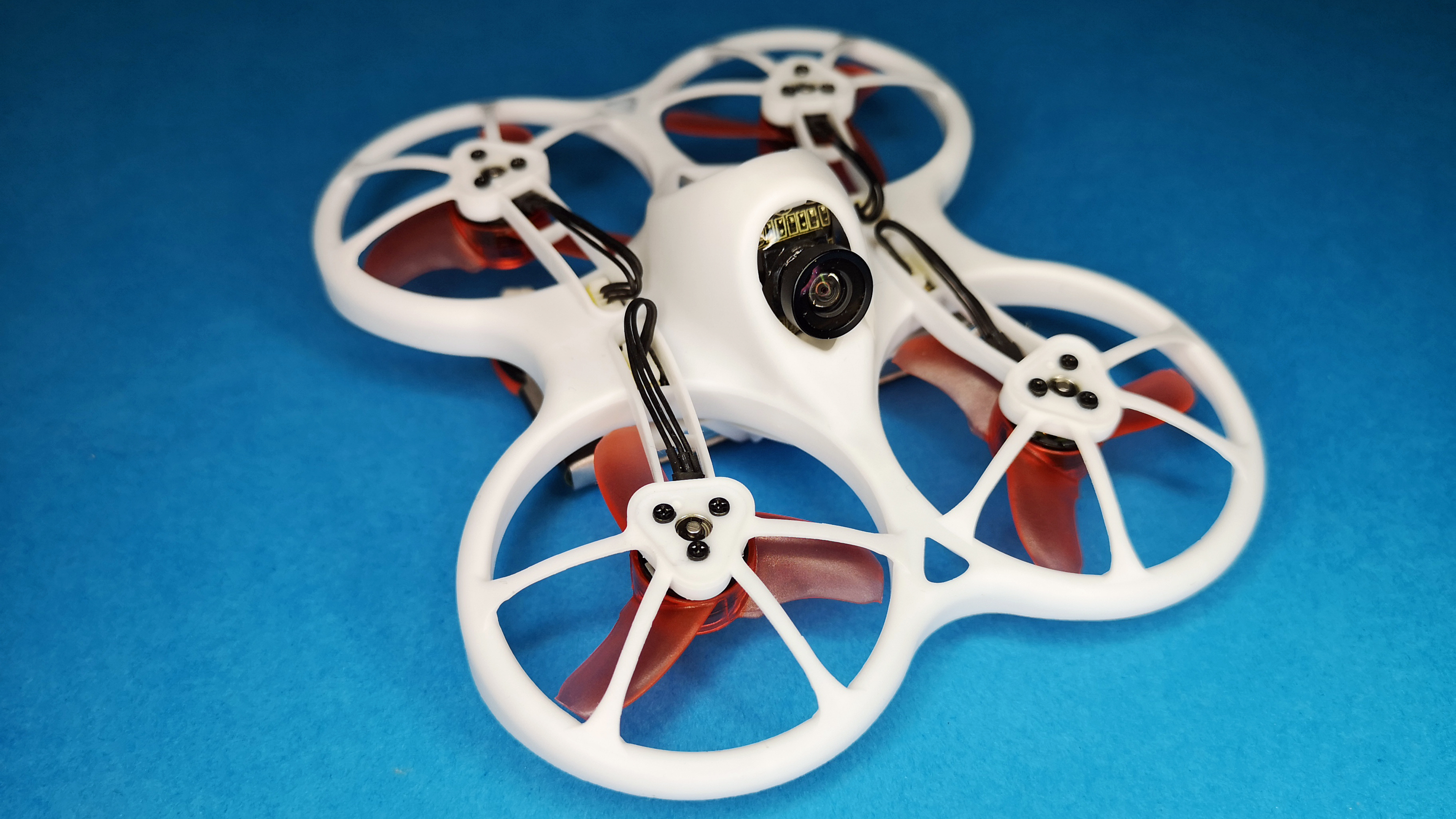 Das Auffälligste an der handtellergroßen Drohne mit dem Namen Tinyhawk ist dessen Aufbau mit den nach unten gerichteten Propellern in sogenannter Pusher-Bauweise. Der Rahmen des Mini-Copters besteht aus weißem Kunststoff und ist dadurch weniger verwindungssteif als große Racing-Drohnen mit Carbon-Rahmen. Die Vorteile dieser Bauweise sind das geringe Gewicht und die hohe Belastbarkeit des flexiblen Kunststoffs. Für den Antrieb sorgen vier kleine 0802er Brushless-Motoren, sie sind wartungsfrei und bieten im Vergleich zu Bürstenmotoren deutlich mehr Schub. Der im Copter integrierte Flight-Controller arbeitet mit der beliebten Firmware Betaflight, welche auch in professionellen und teuren FPV-Drohnen zum Einsatz kommt. Der installierte RC-Empfänger arbeitet mit dem Frsky-Protokoll. Für die Stromversorgung ist der mitgelieferte, einzellige 3,8 V Akku mit 450 mAh zuständig. Das Videobild der fest installierten Kamera wird per 5,8-GHz-Videosender übertragen.
