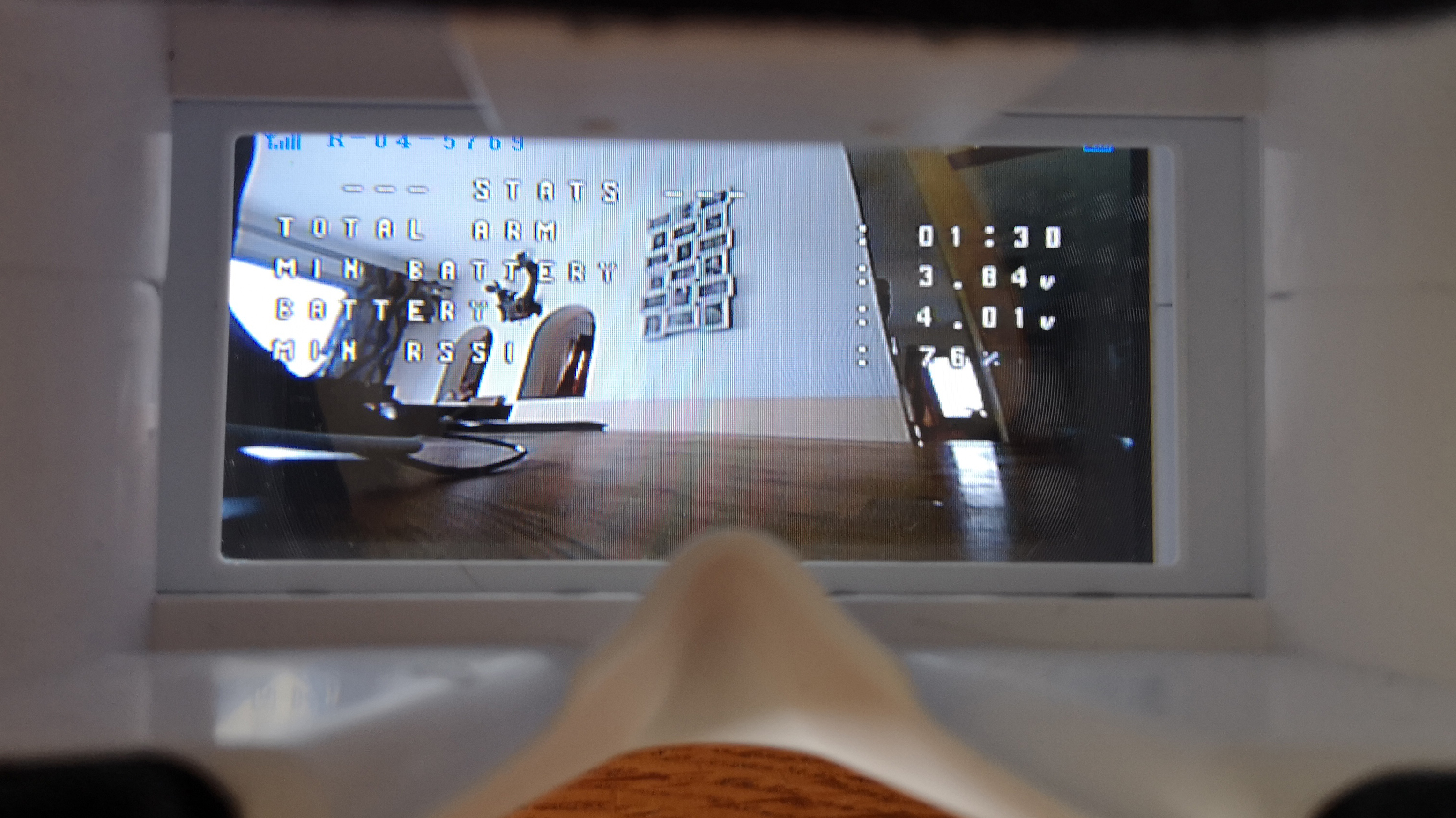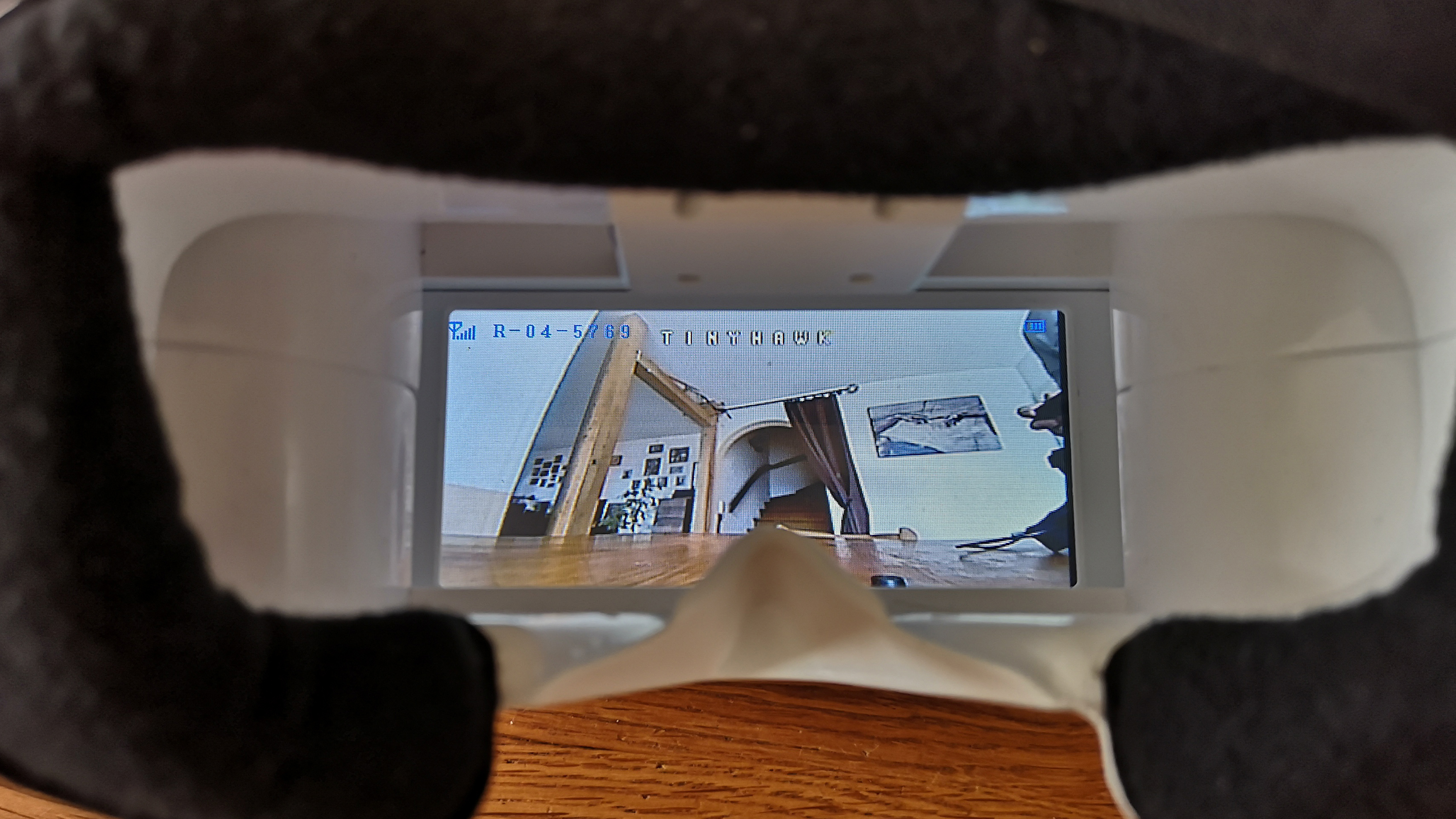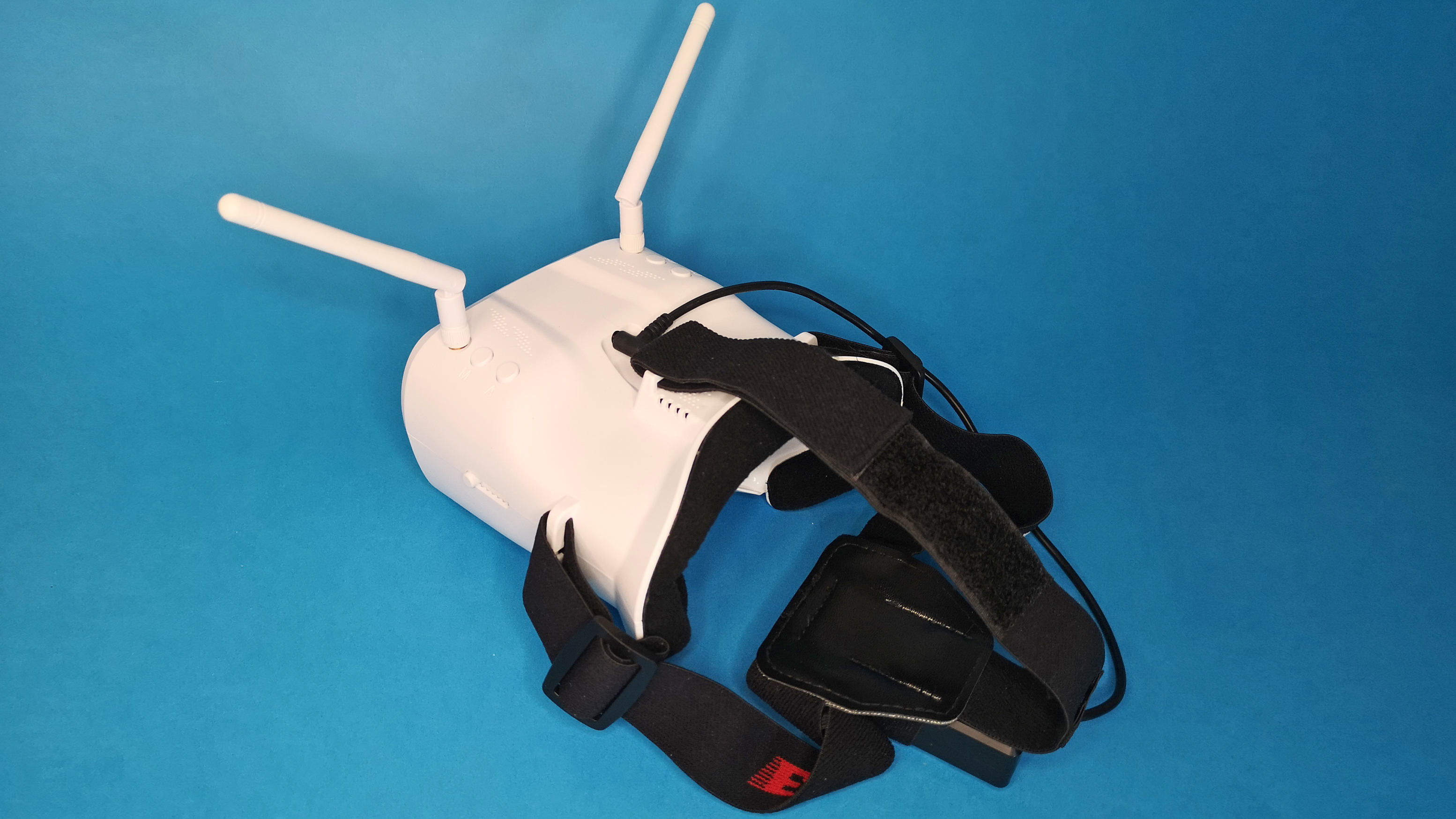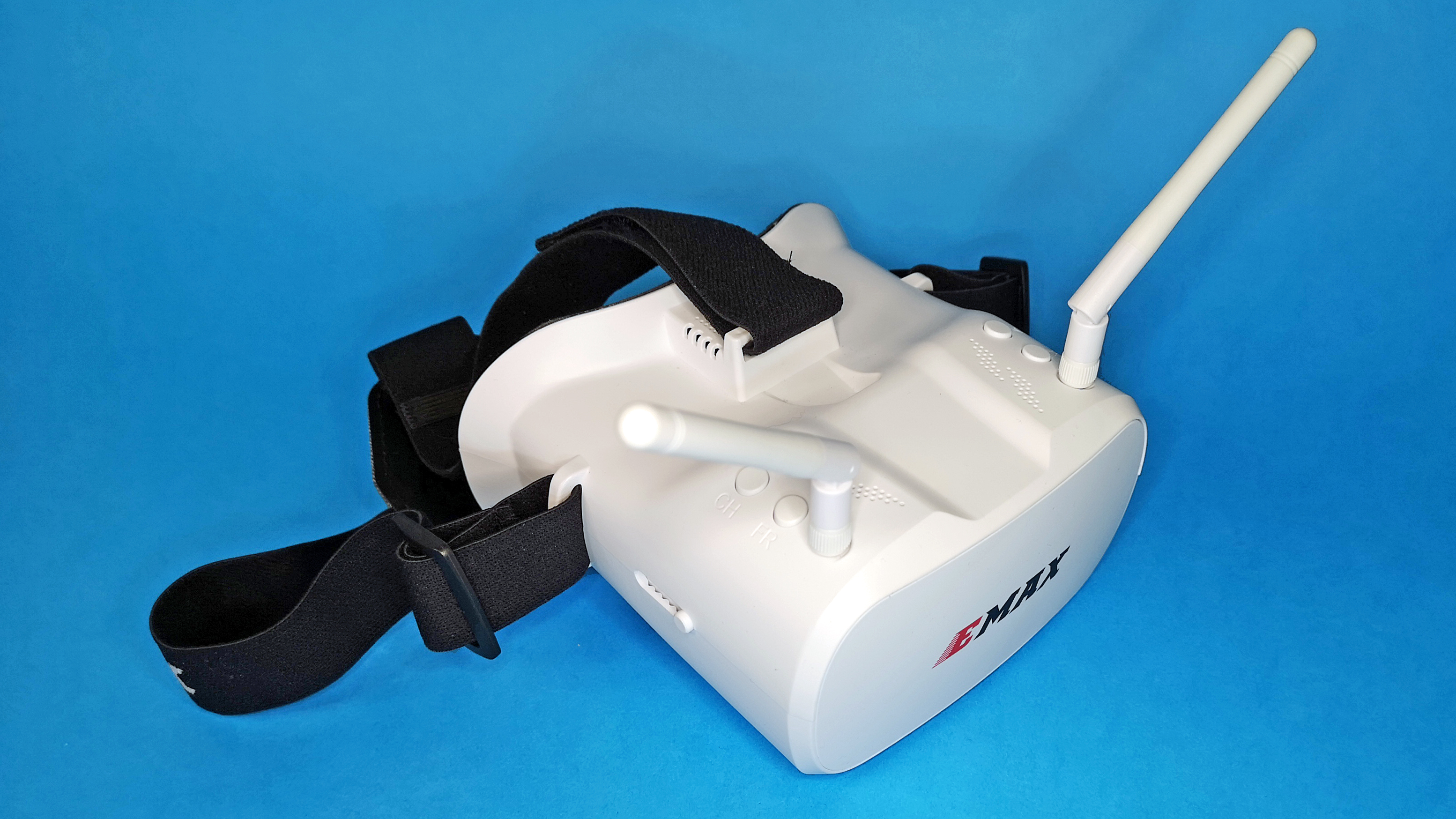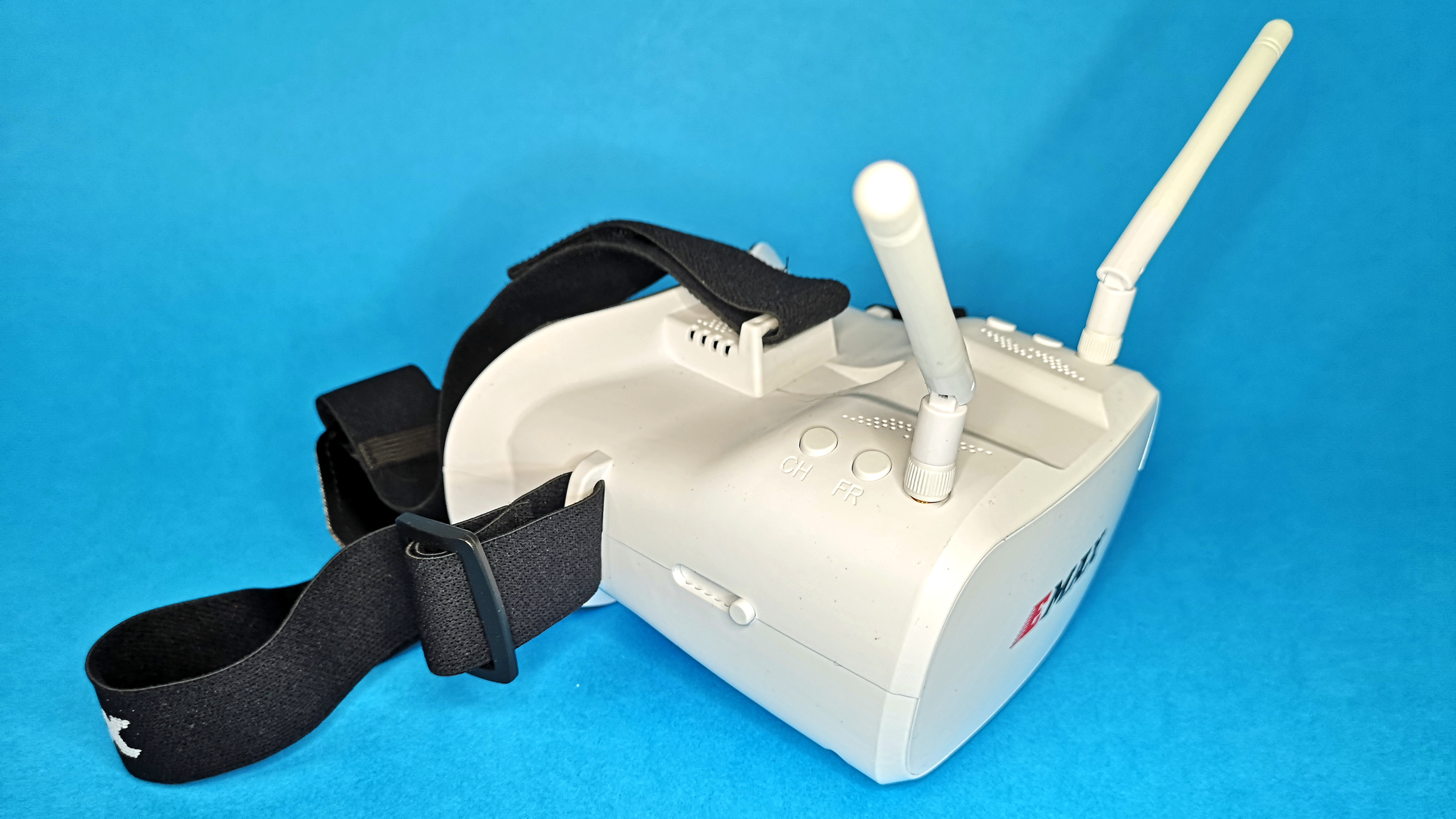 Der Videoempfänger steckt in der mitgelieferten FPV-Brille. Die Haptik der weißen Kunststoff-Brille ist zwar nicht extrem hochwertig, aber die Verarbeitung ist immerhin ordentlich. Der Videoempfang mithilfe von zwei getrennten Empfangseinheiten sorgt für eine ausreichend stabile Übertragung ohne lange Bildaussetzer. Durch die Nutzung des 5,8-GHz-Bandes, ist die Videobrille zu allen analogen FPV-Coptern kompatibel. Für eine ausreichend helle und ausreichend scharfe Darstellung sorgen ein LCD mit einer Auflösung von 480 × 272 Pixeln und eine davor angebrachte Fresnel-Linse. Die insgesamt 37 Empfangskanäle sind per Hand umschaltbar; deutlich komfortabler ist allerdings der automatische Suchlauf, der im Test zuverlässig und schnell funktioniert. Der externe Akku der Brille wird per Micro-USB-Anschluss geladen.