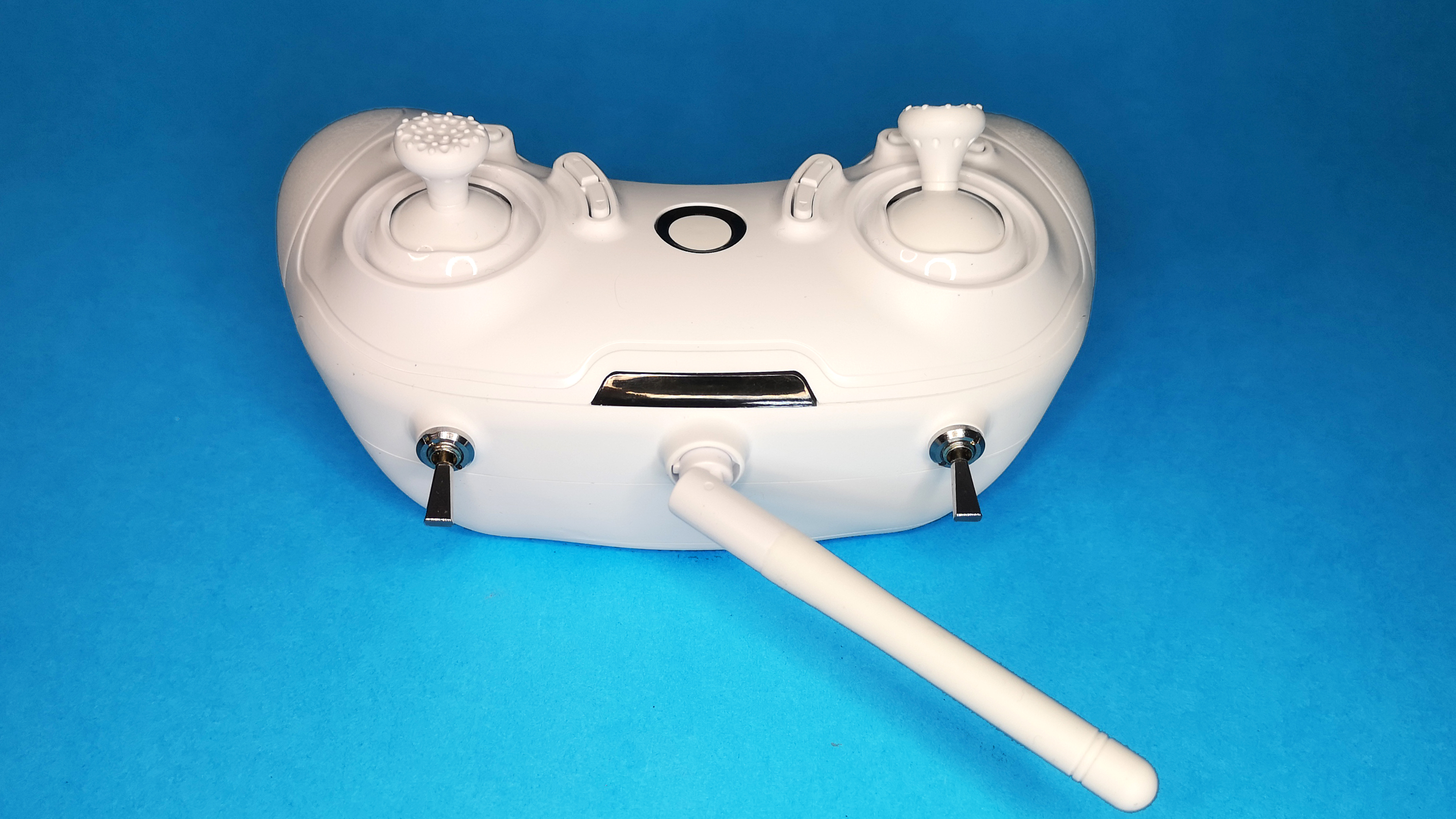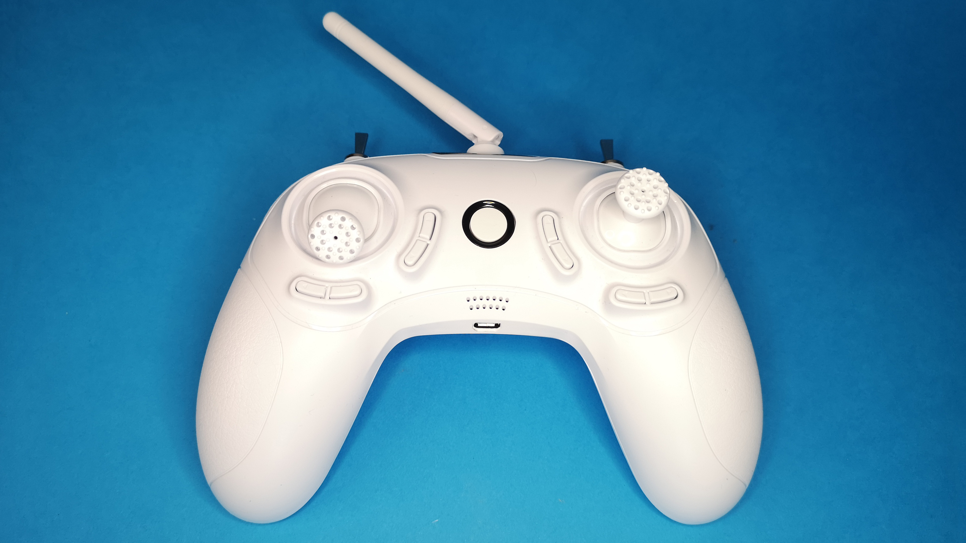 Das Design des Handsenders aus weißem Kunststoff und der aufgesetzten Stabantenne könnte auch von einem billigen Spielzeug-Copter stammen. Letztlich geht es aber um die Funktion und nicht um das Aussehen. Und so ist der integrierte 6-Kanal-Sender der Fernsteuerung zu allen Frsky-Empfängern kompatibel und erlaubt daher auch die Steuerung von anderen Drohnen wie der UK65 (Testbericht) oder des Mobula6 HD (Testbericht) . Die Verarbeitung des Senders ist in Ordnung, auch wenn er nicht so hochwertig wie das Modell aus dem Starter-Set von Betafpv (Testbericht) ist. Insbesondere die beiden Steuerknüppel wirken billig. Zur Stromversorgung dient ein fest installierter Akku, der per Micro-USB-Kabel geladen wird.