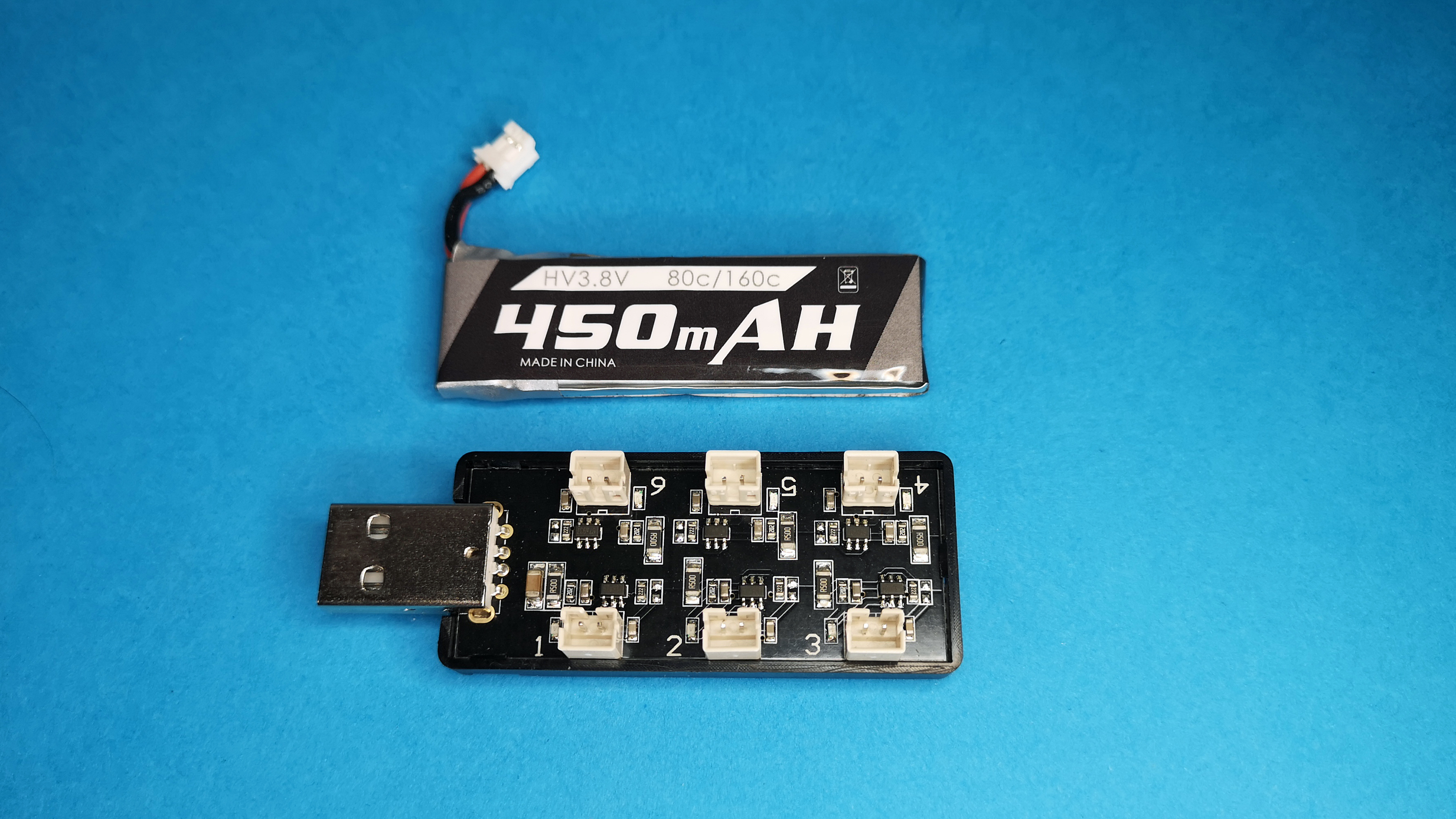 Das USB-Ladegerät lädt bis zu sechs Flug-Akkus gleichzeitig. Mangels geschlossenem Gehäuse wirkt es allerdings sehr spartanisch. Im Test hat es trotzdem gut und zuverlässig funktioniert.